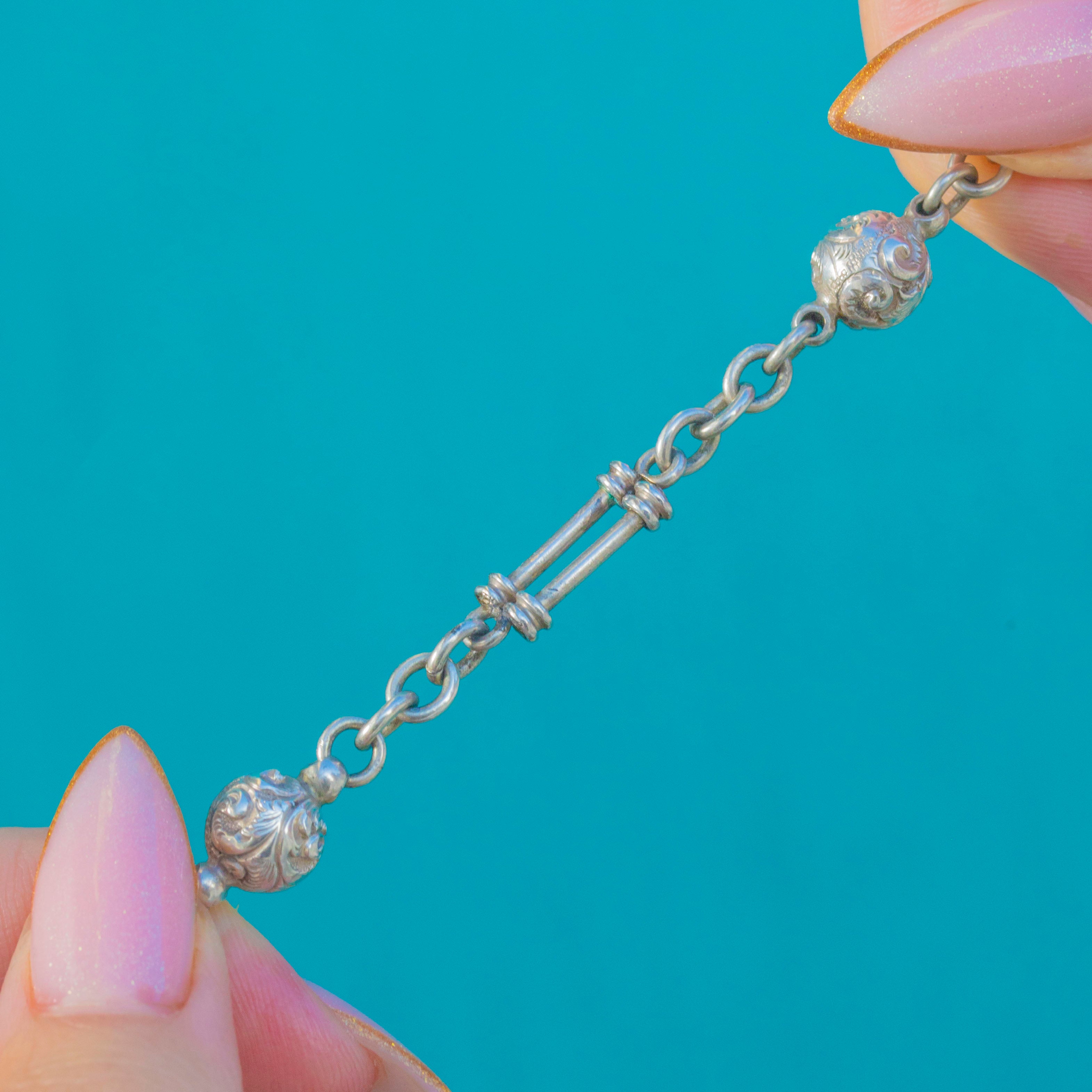 This charming Victorian Silver Albertina chain bracelet features ornate ball spacers and classic double-bar links, creating that elegant, slightly decorative look so loved in 19th-century pocket-watch jewellery. Light and wearable with lovely detail, it retains its original T-bar and dog clip—ideal for wearing as a bracelet, attaching charms, or styling as part of a layered wrist stack.