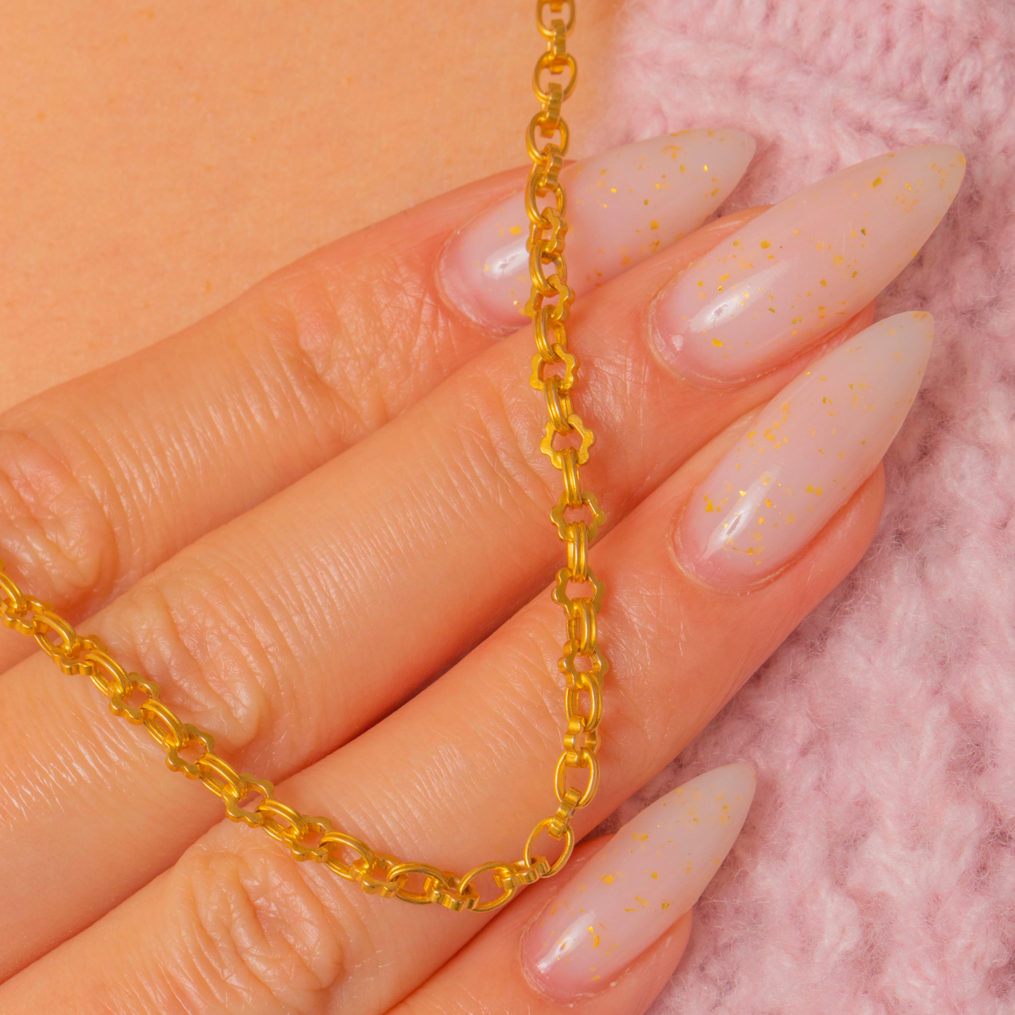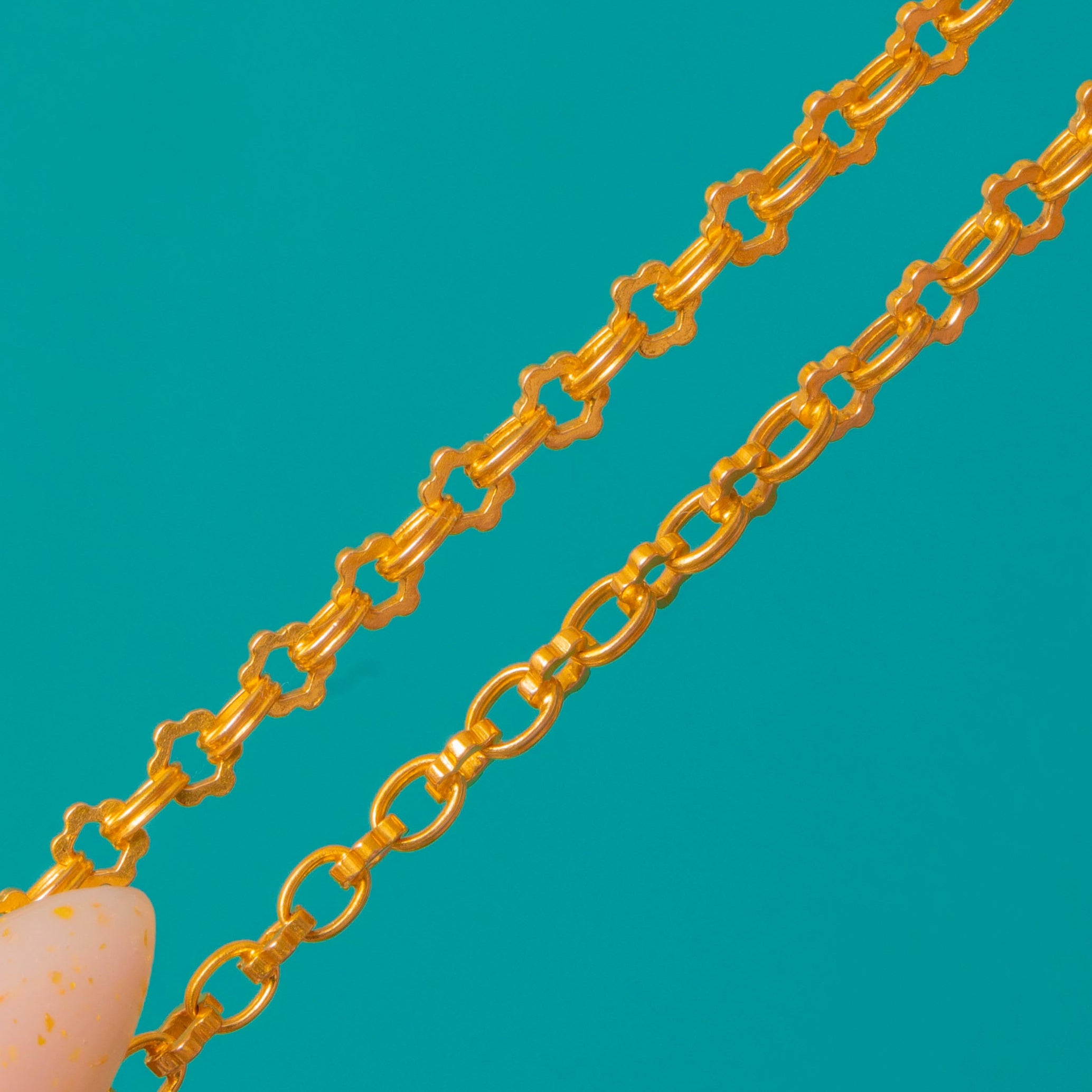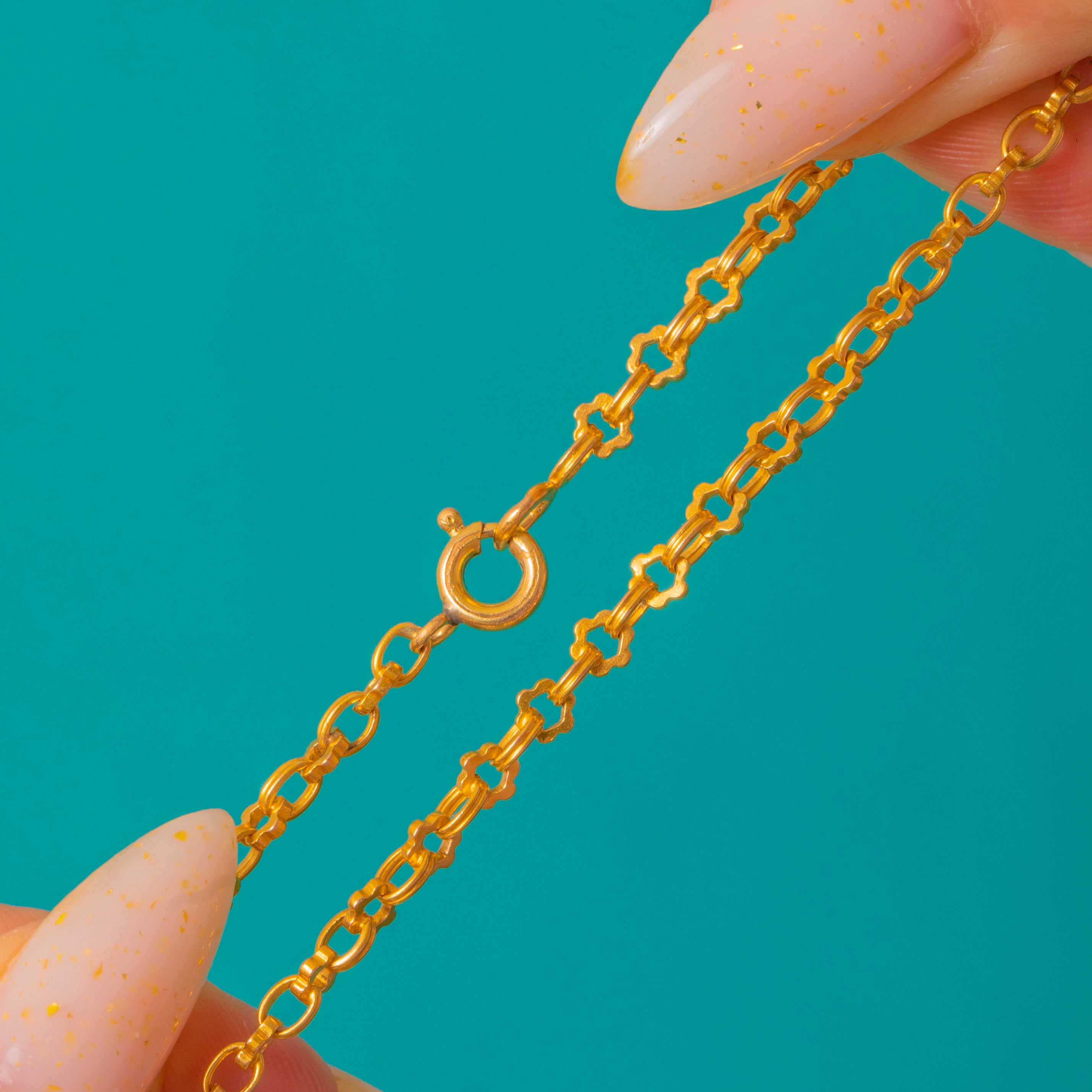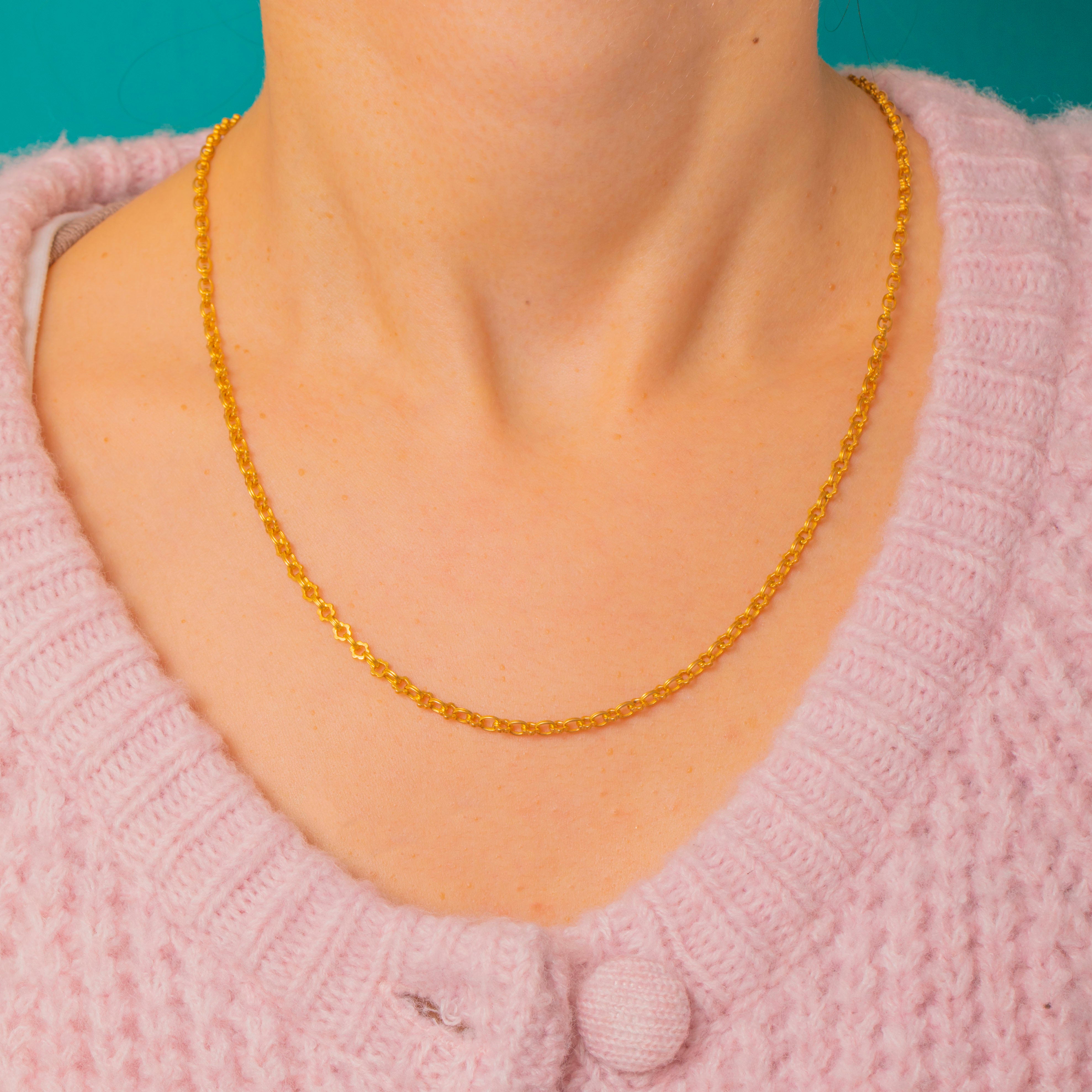 A French 18ct Gold fancy chain, composed of repeating flattened oval links alternating with small quatrefoil connector links for a decorative geometric look.