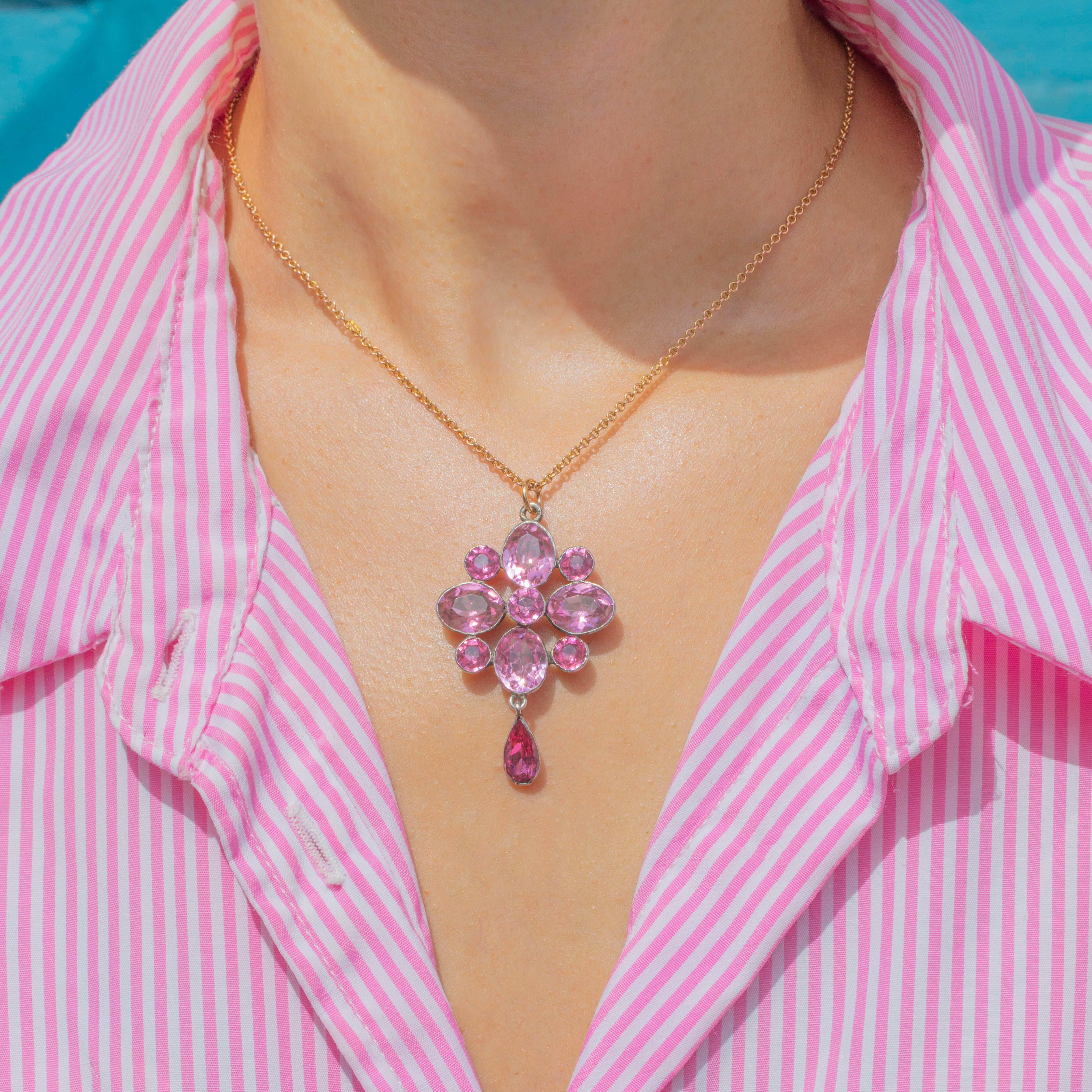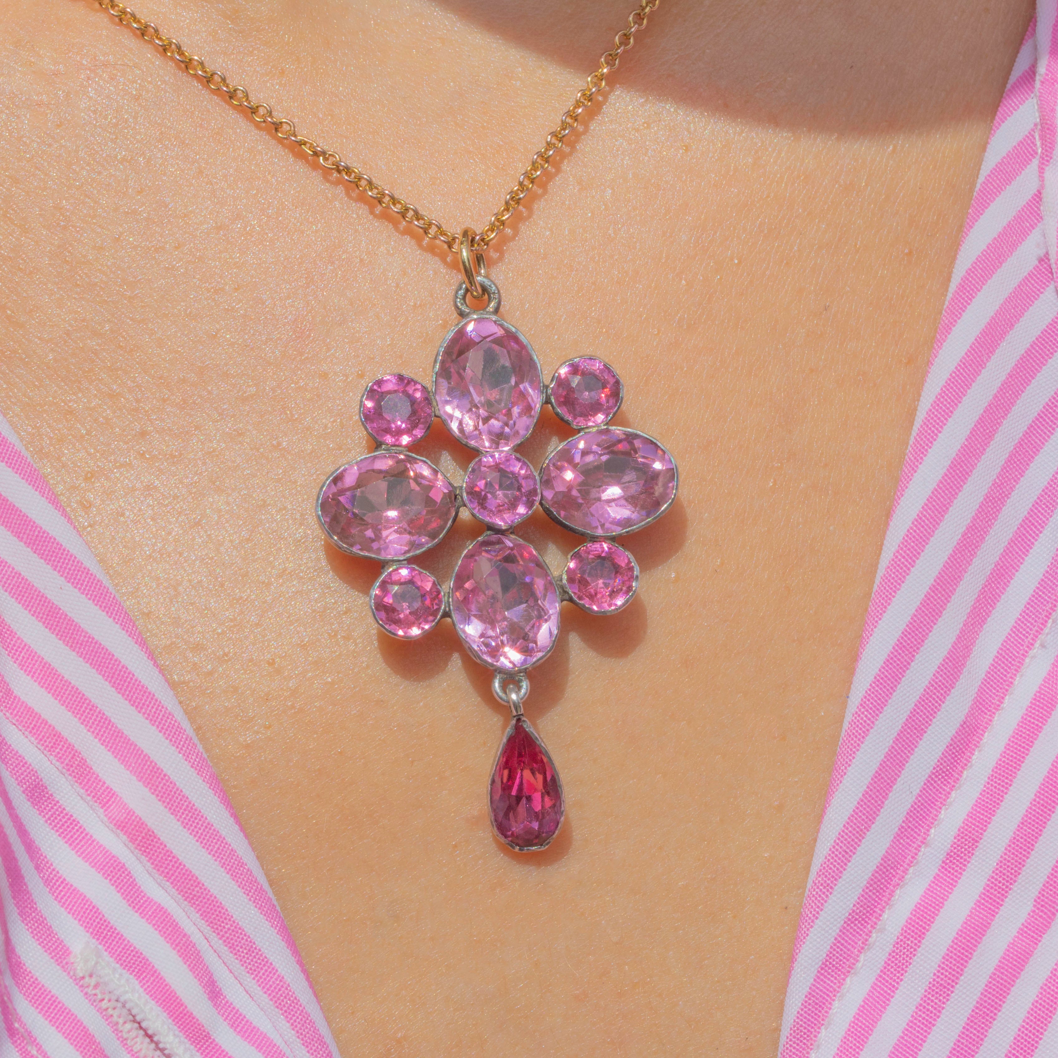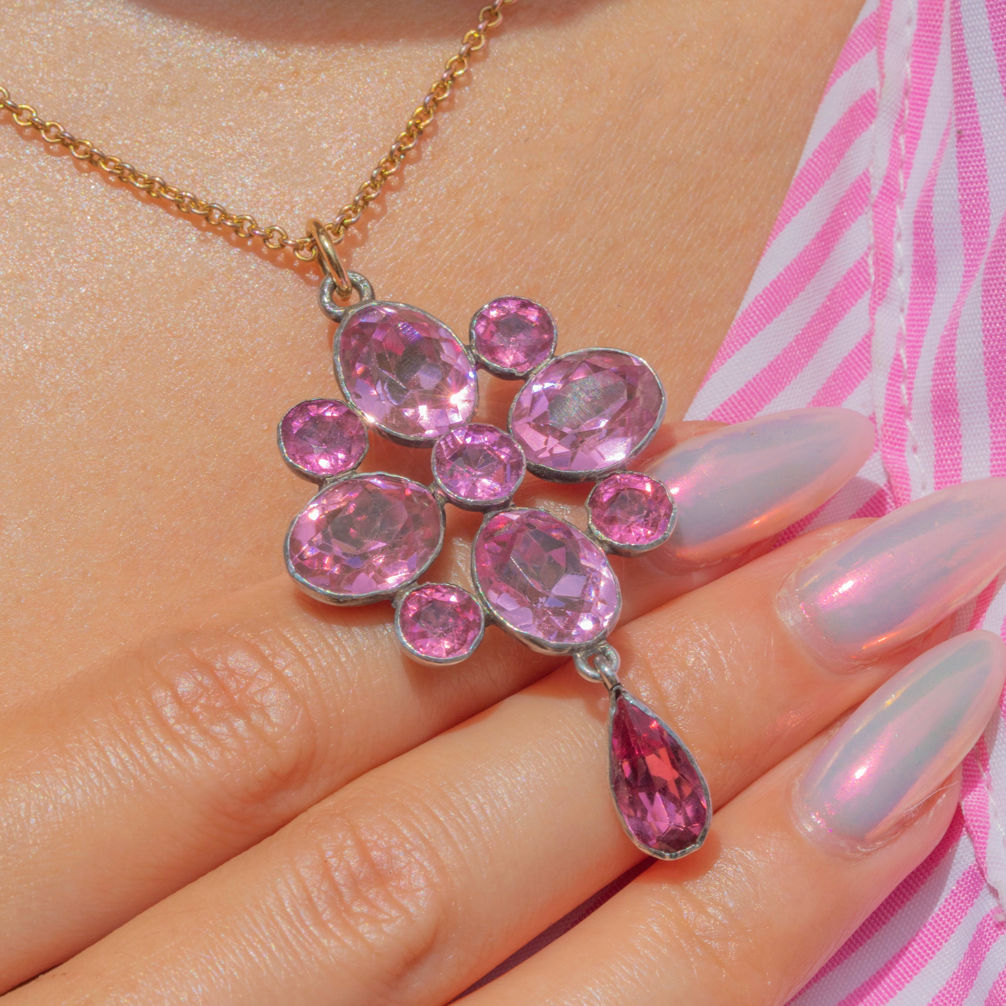Crafted circa 1850, this bold Victorian pendant displays vibrant Pink Paste set in Sterling Silver, arranged in a stunning floral design that dazzles from every angle.