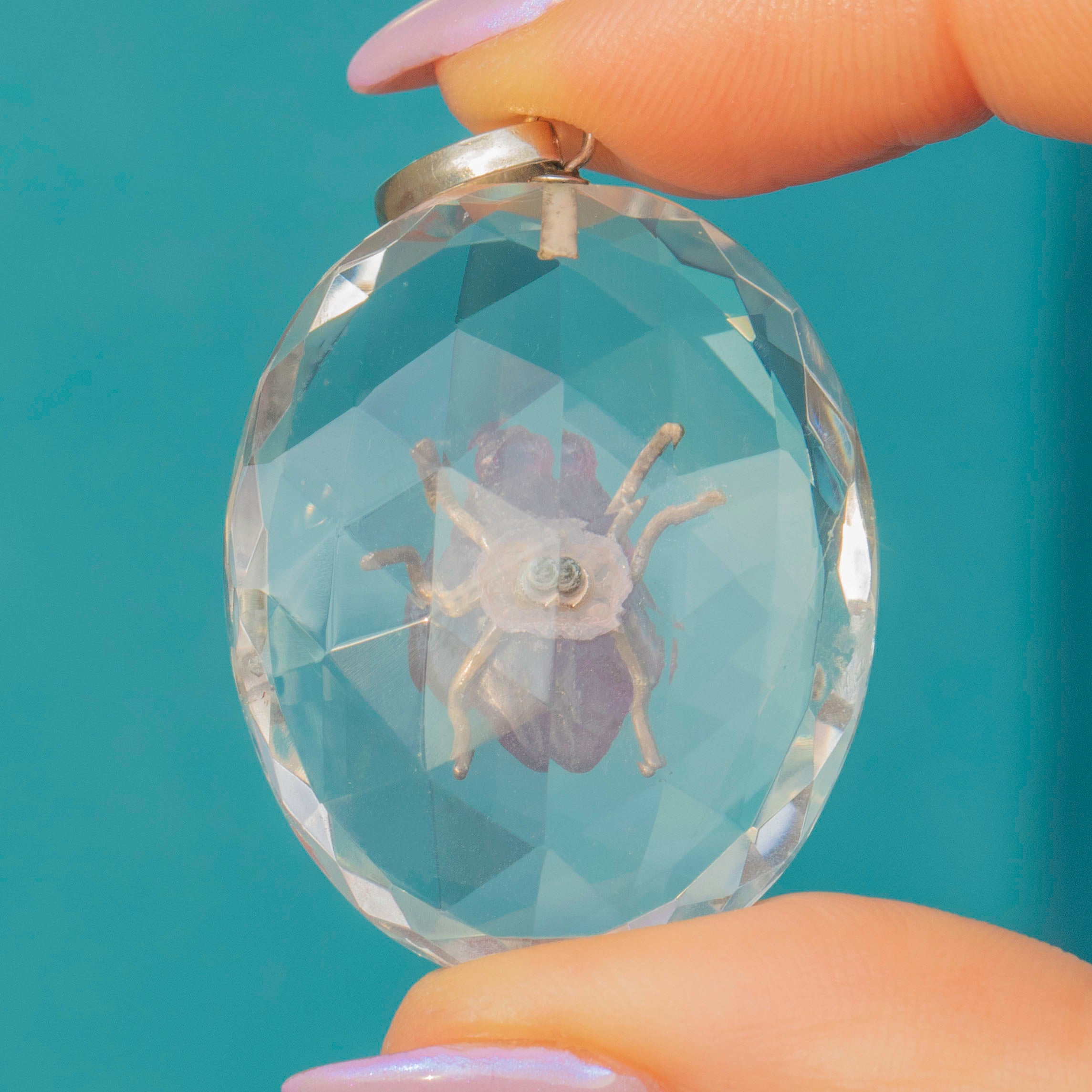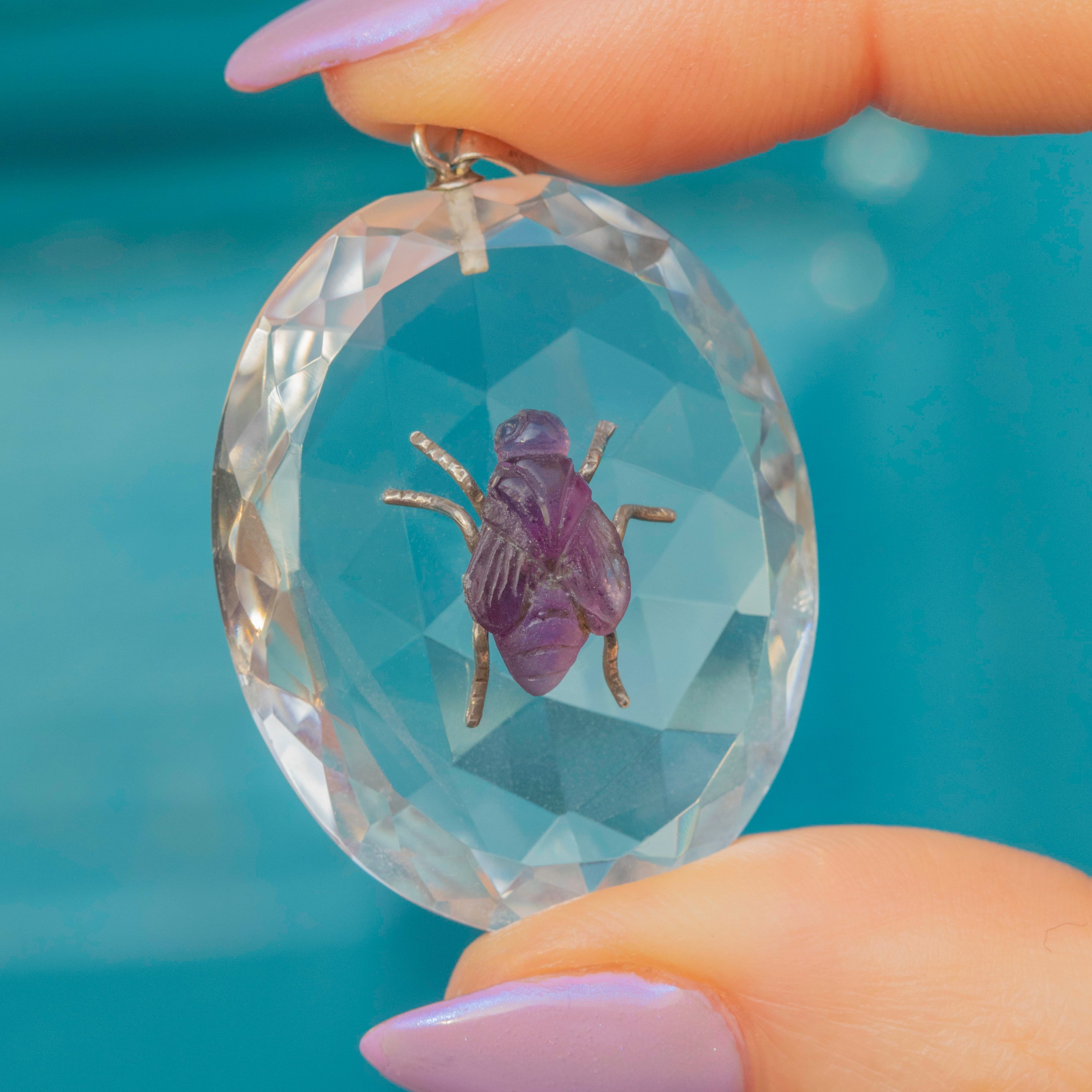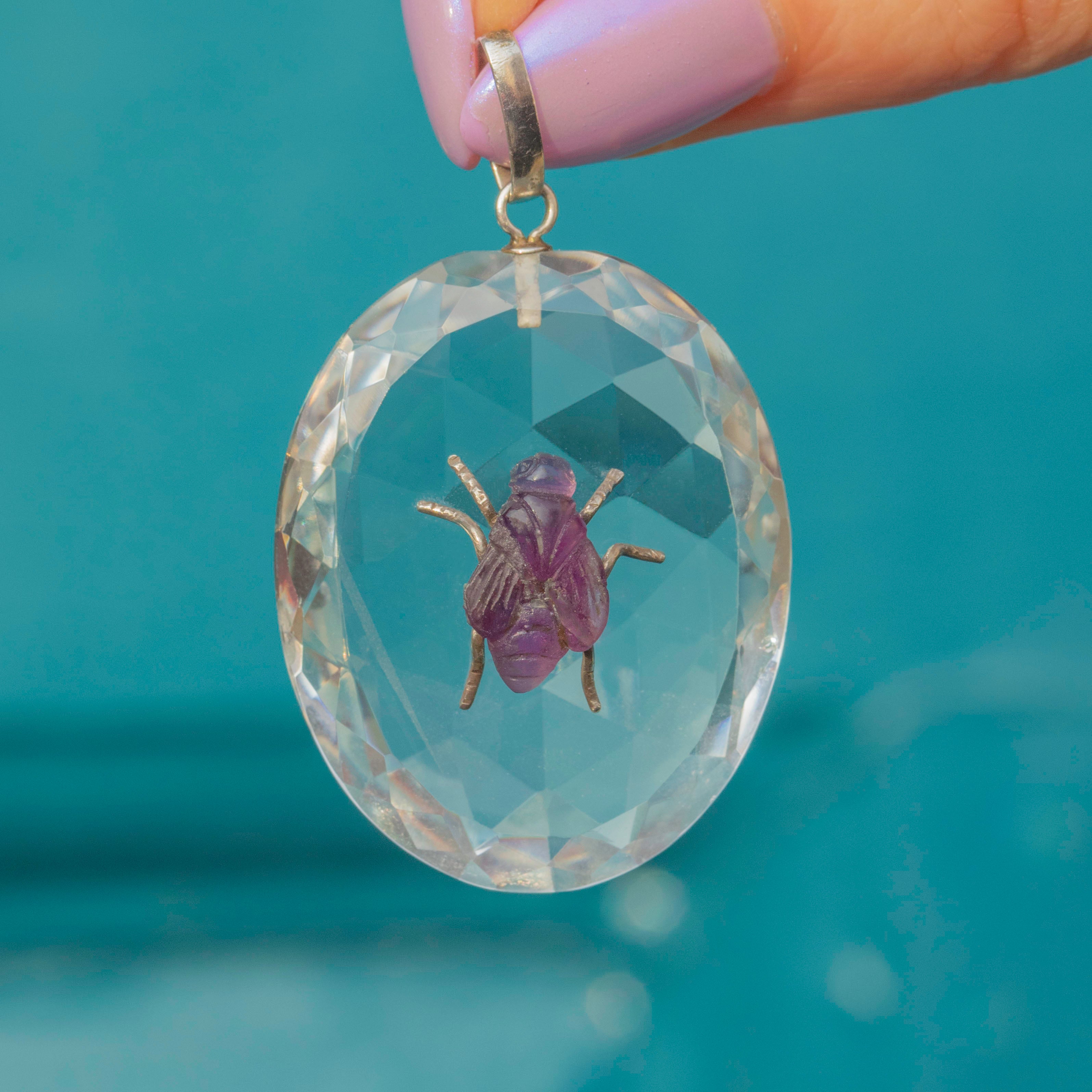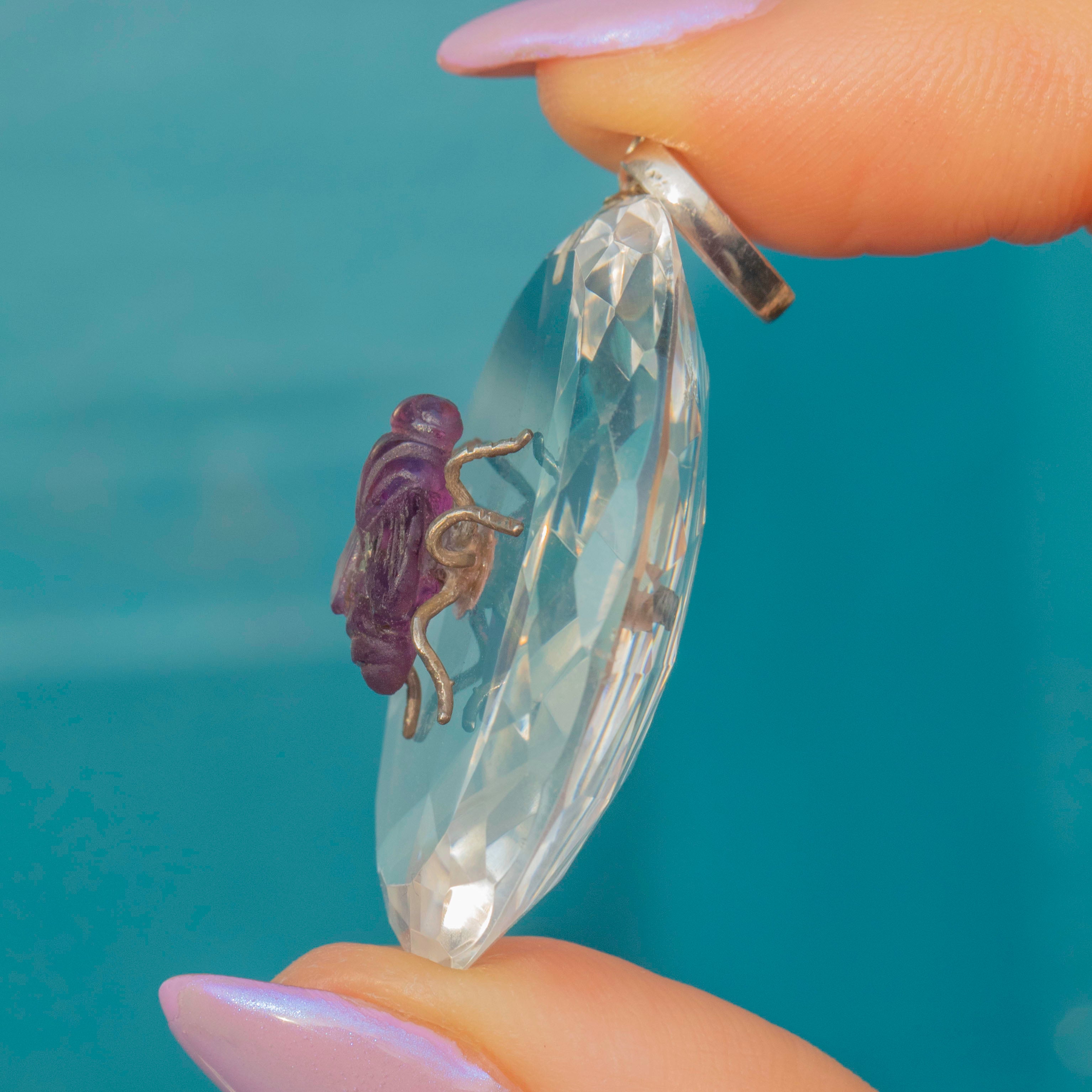 This Victorian Rock Crystal Amethyst fly pendant perfectly captures the 19th-century love of the curious! A window into the trends of the 1800's, this large faceted Rock Crystal pendant features a fly carved from Amethyst adorning her front.