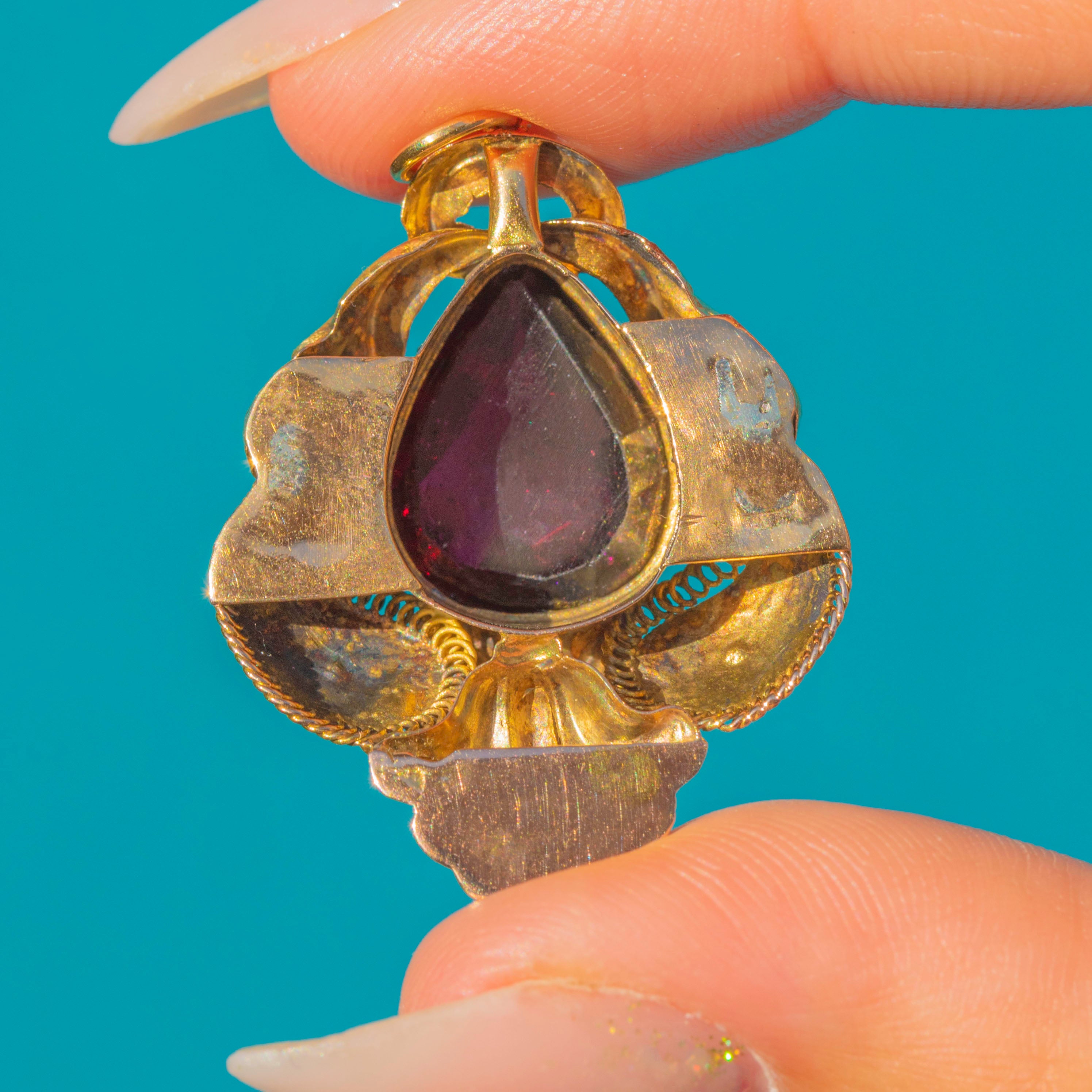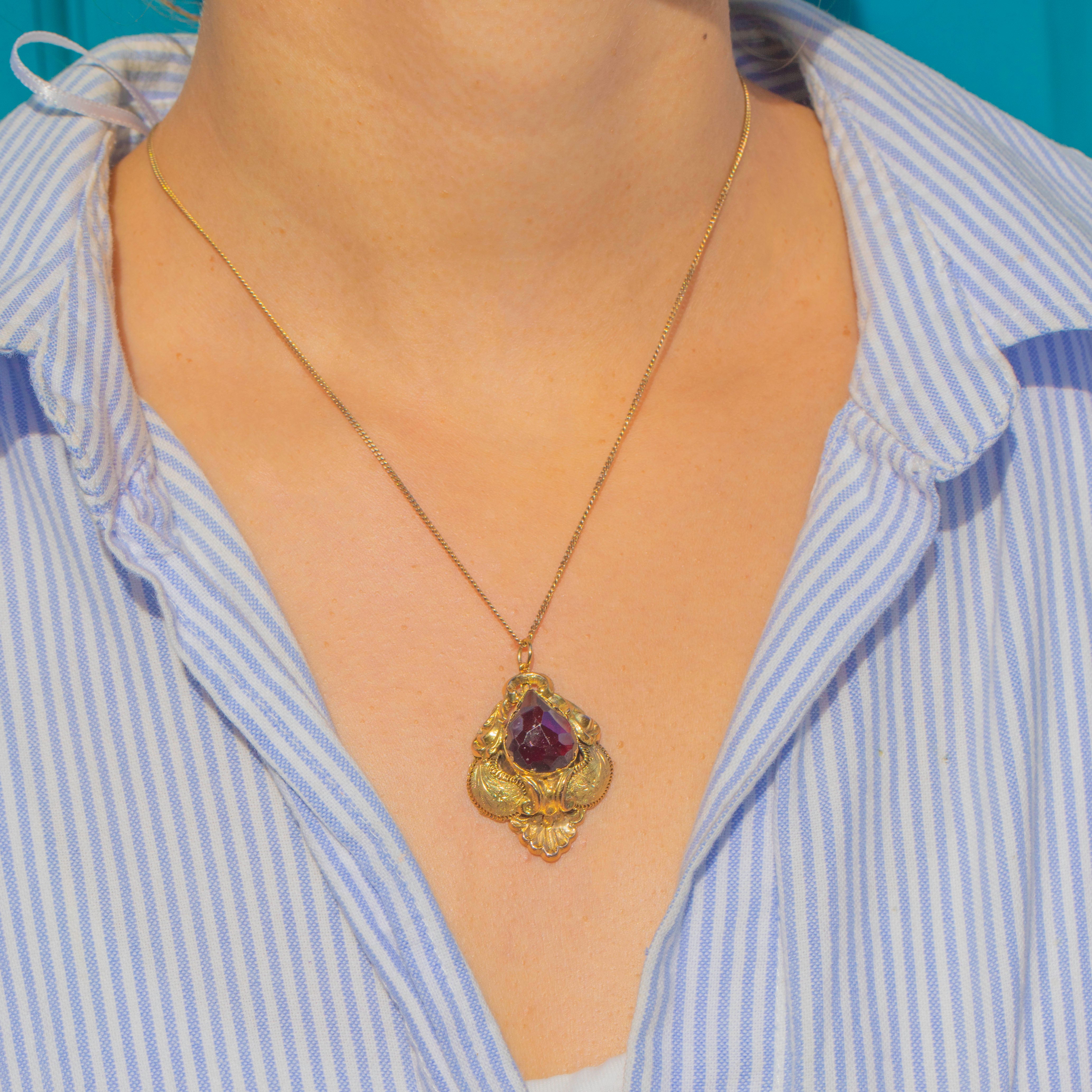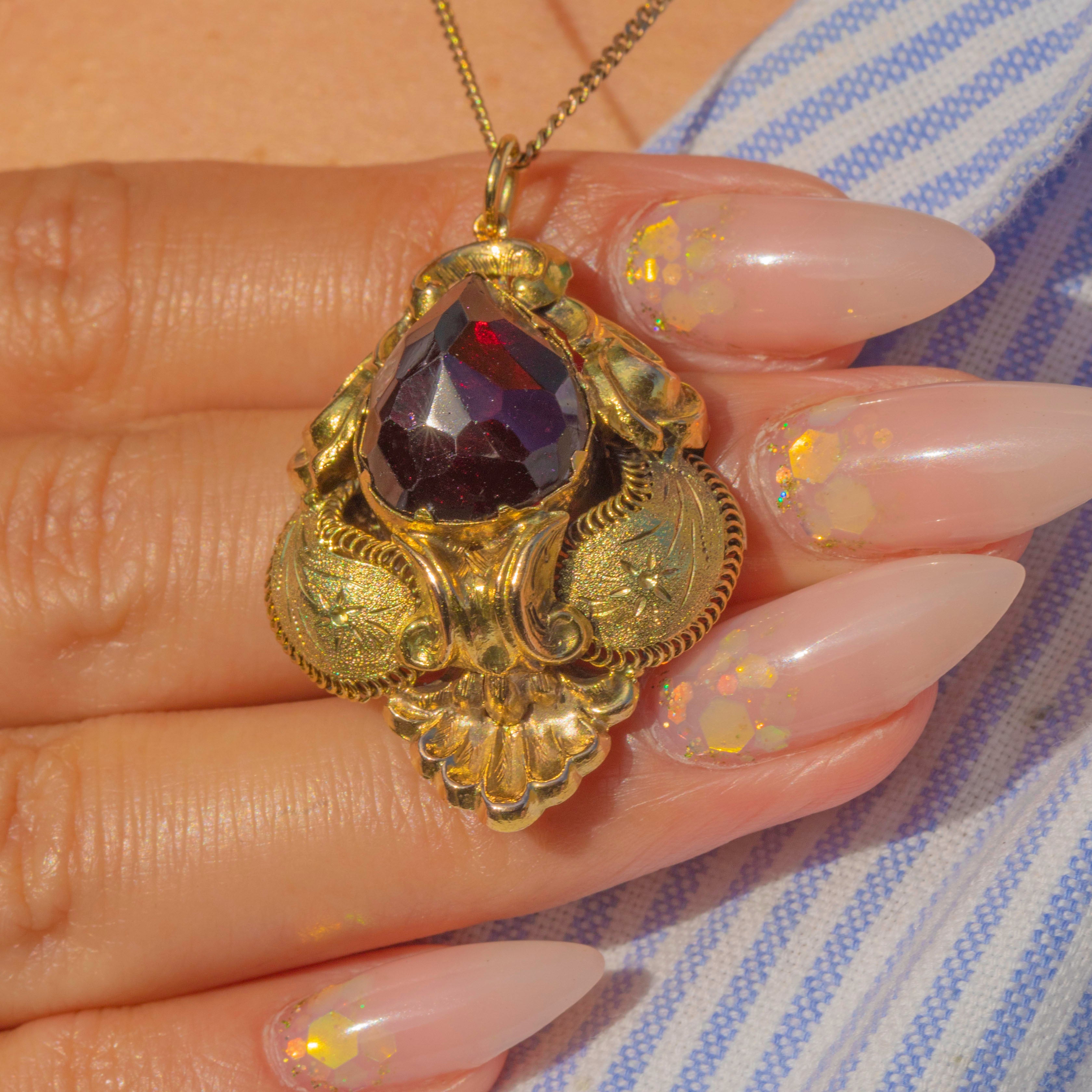 VERY GOOD: The Garnet presents beautifully with rich colour; under magnification there are a few minor flea-bites to the surface, not distracting in wear. The 15ct Gold work is crisp with strong detail and the setting is secure. Light wear to the back of the pendant commensurate with age, not visible when worn.