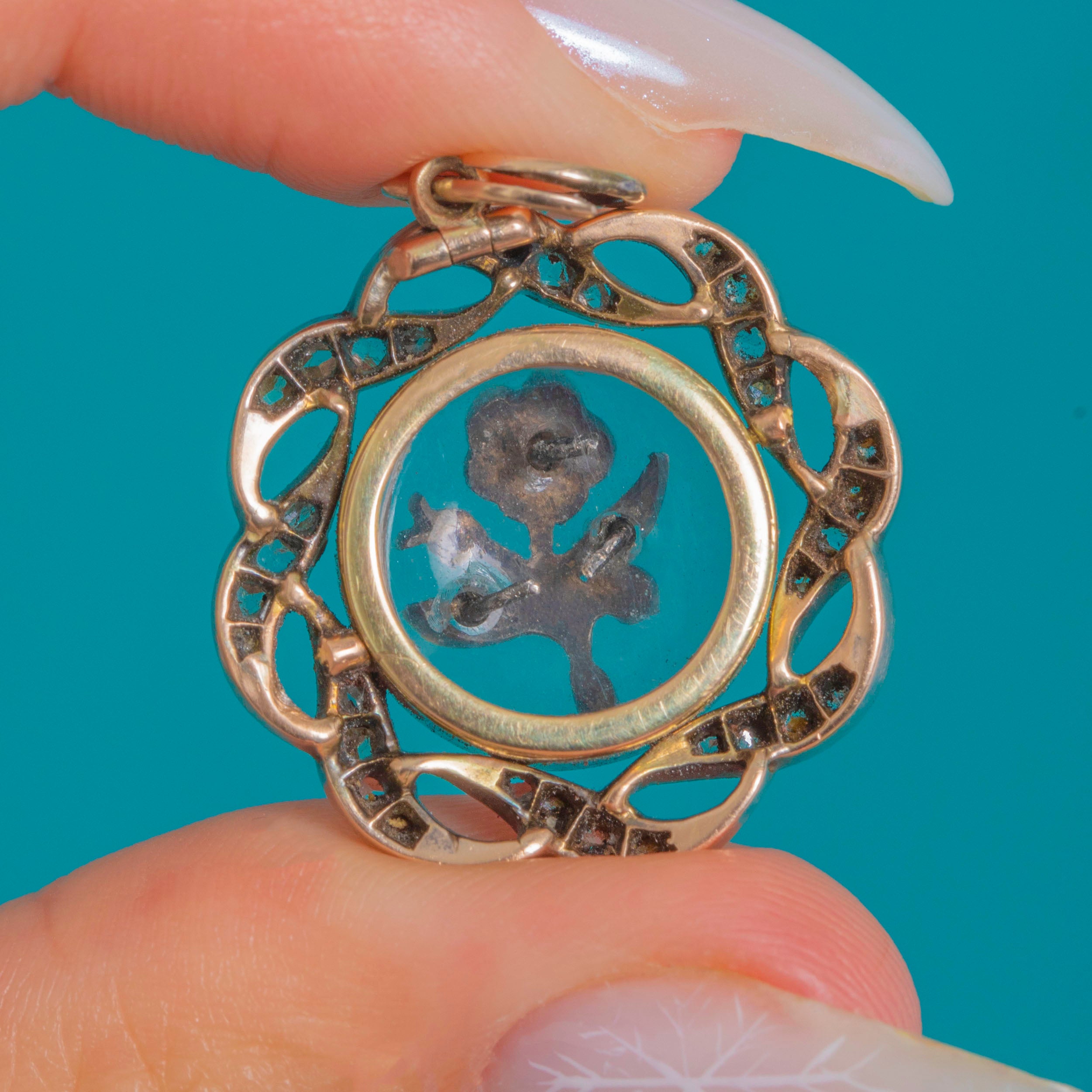 The outer border is crafted in 9ct Gold and Silver, intricately pierced and set with Rose-Cut Diamonds that dance in the light. Perfectly sized and wonderfully intricate, this antique locket makes a standout pendant on any chain – full of sparkle, craftsmanship, and Victorian charm.