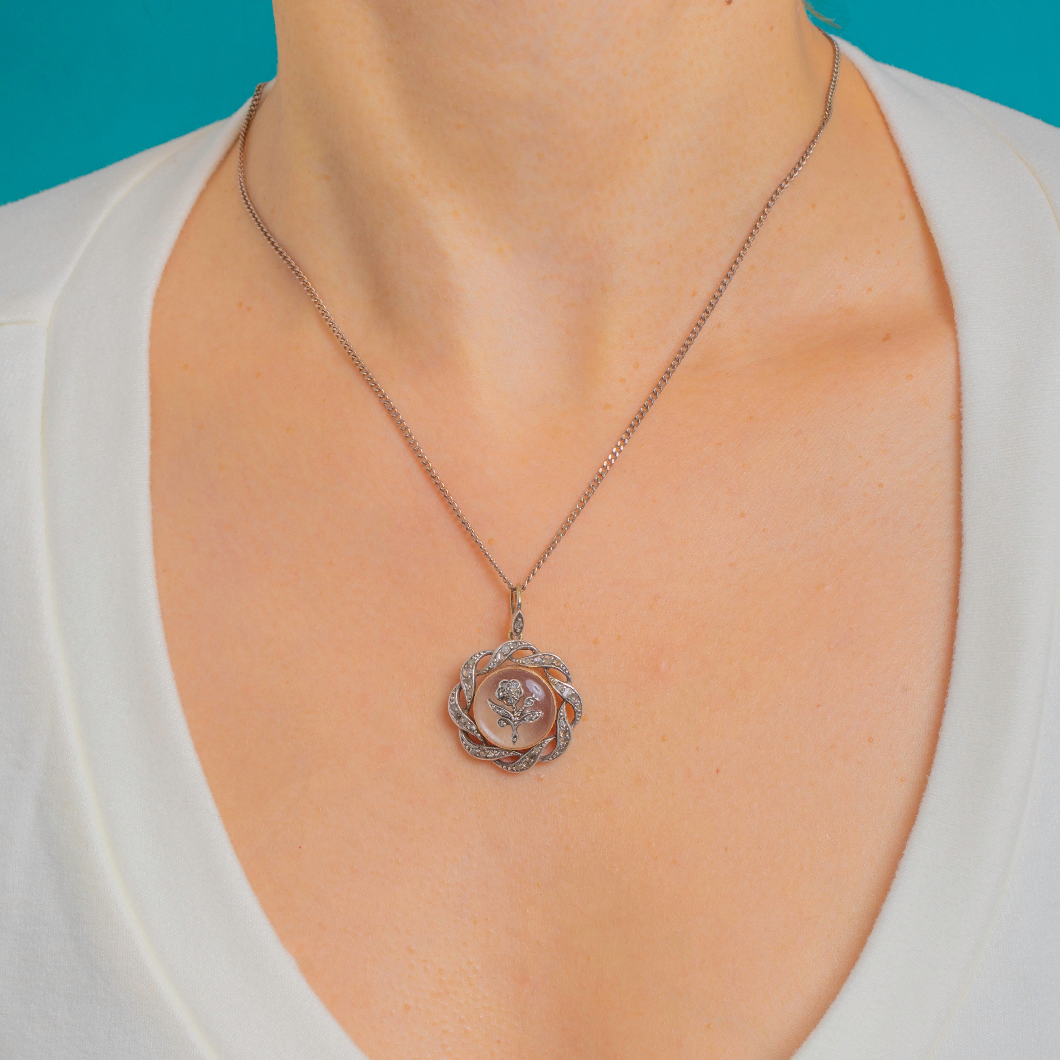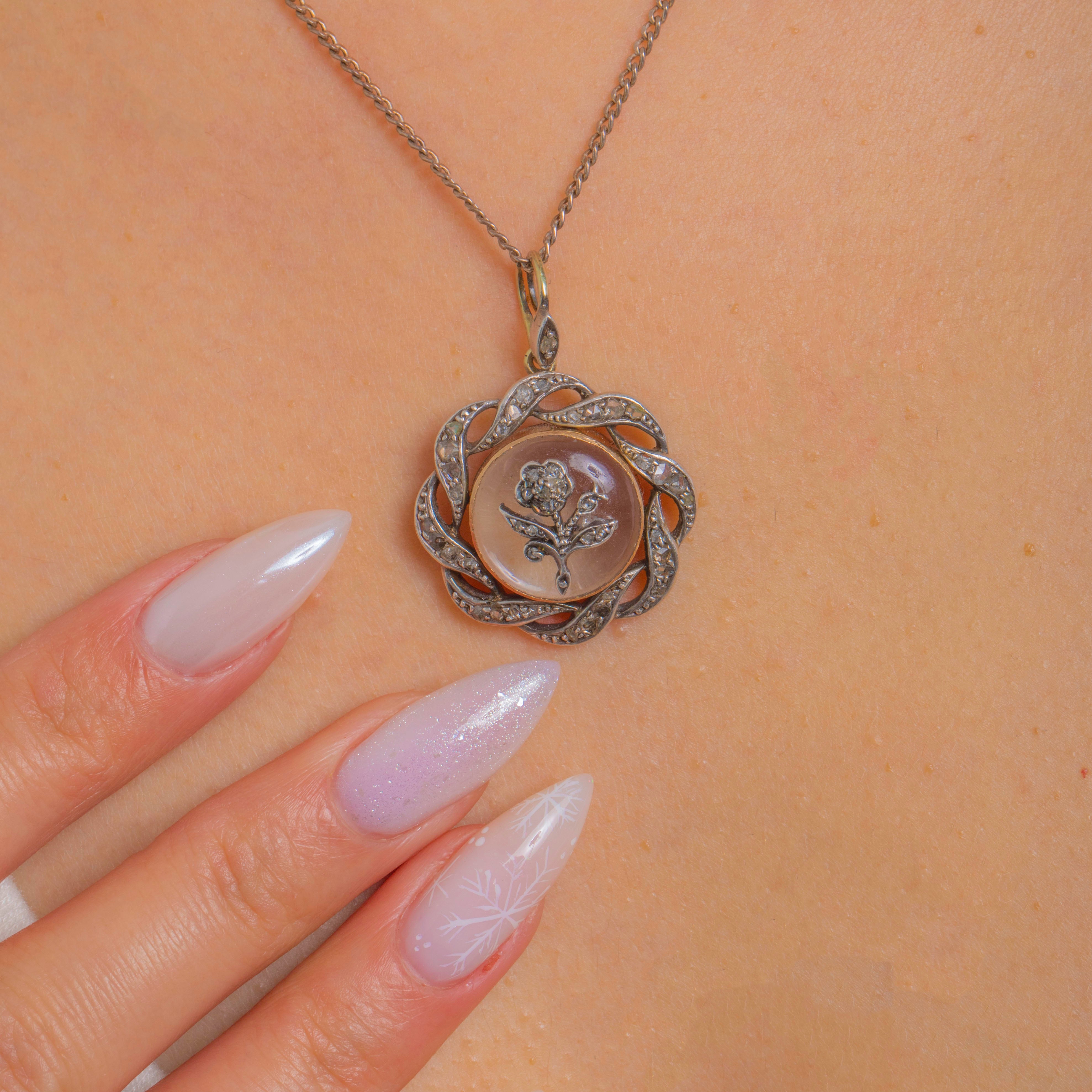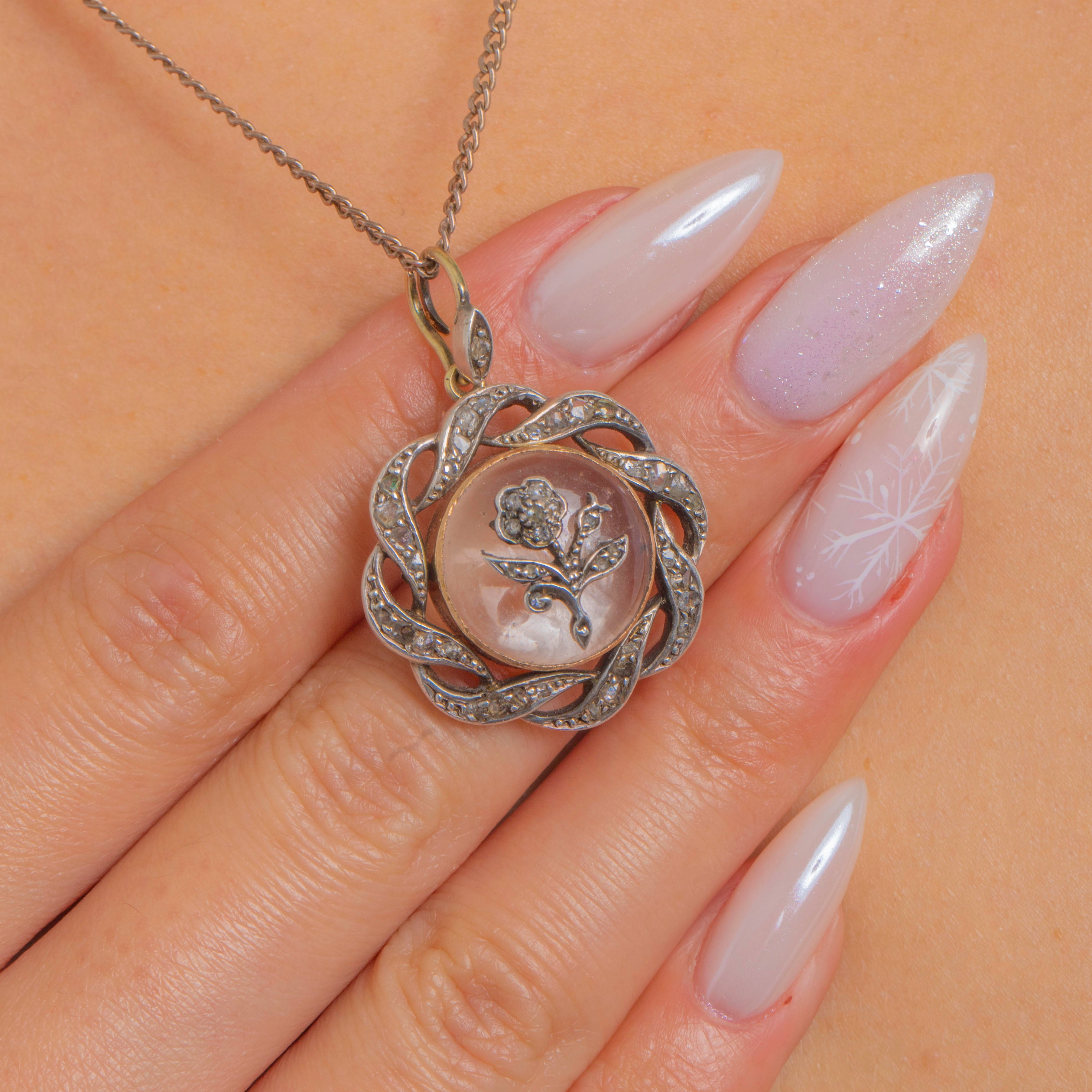 This charming antique locket brings together all the romance of the Victorian era with the sparkle of Rose-Cut Diamonds and a beautifully detailed floral motif. At its heart sits a Diamond-set trefoil beneath a domed Rock Crystal, creating a dreamy, almost ethereal effect as it floats within the round frame.