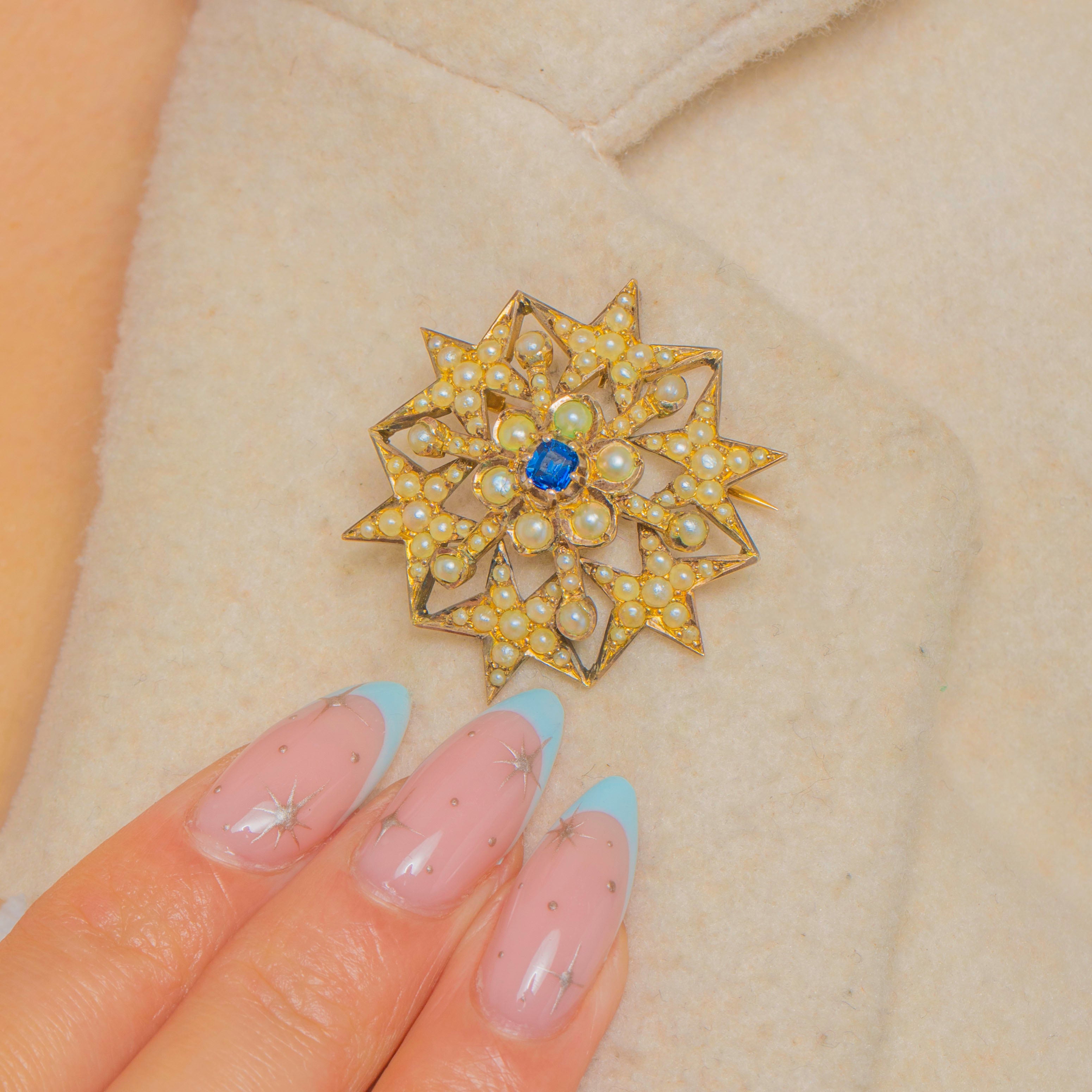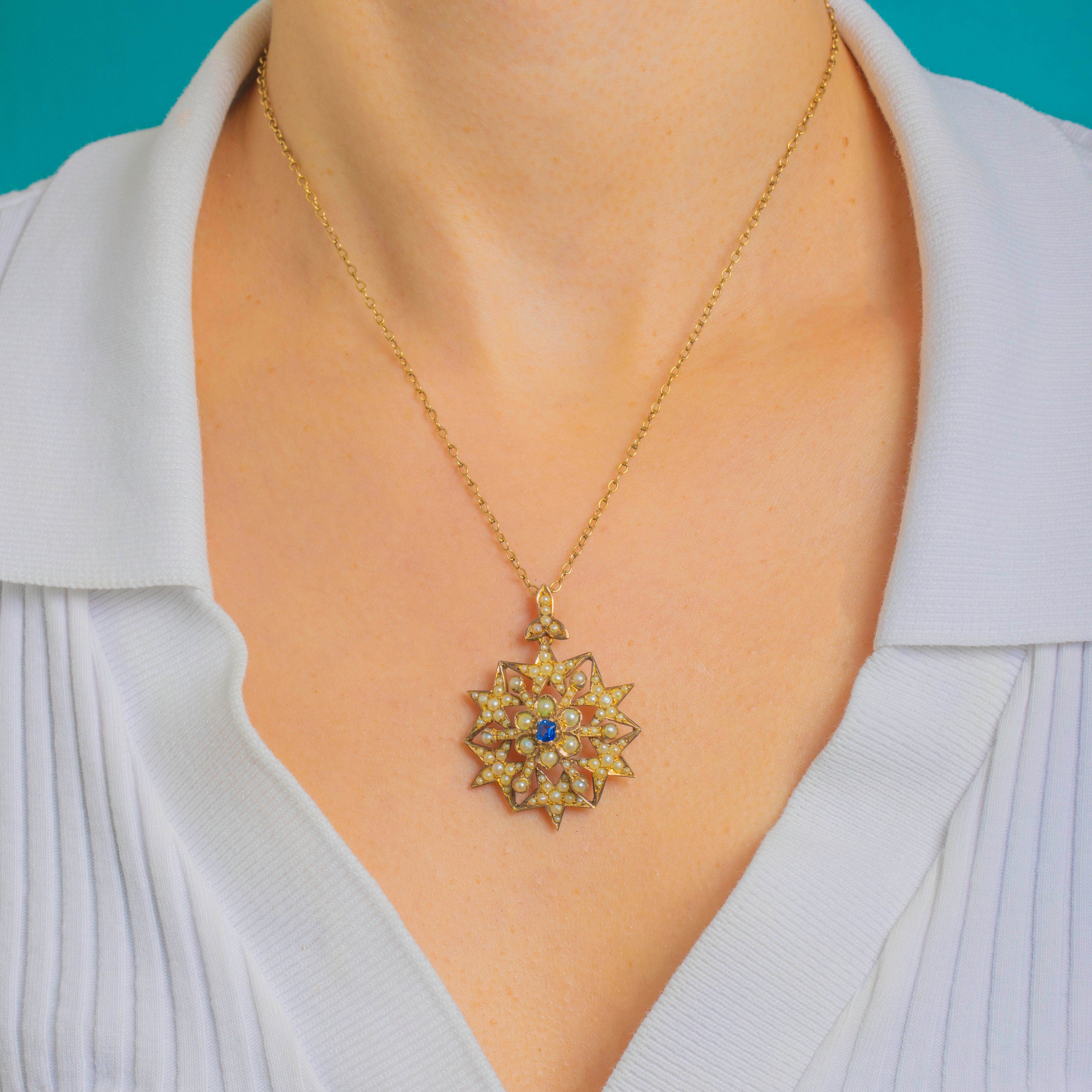 A luminous Victorian starburst, this exquisite convertible pendant-brooch radiates celestial charm. Crafted in warm 9ct Gold with an 18ct Gold-gilded finish for added brilliance, the lacy openwork rays are densely adorned with creamy Pearls that shimmer with a soft, even glow. At the heart sits a vivid royal-blue cushion-cut Sapphire, its saturated hue adding a striking focal point against the Pearly halo.