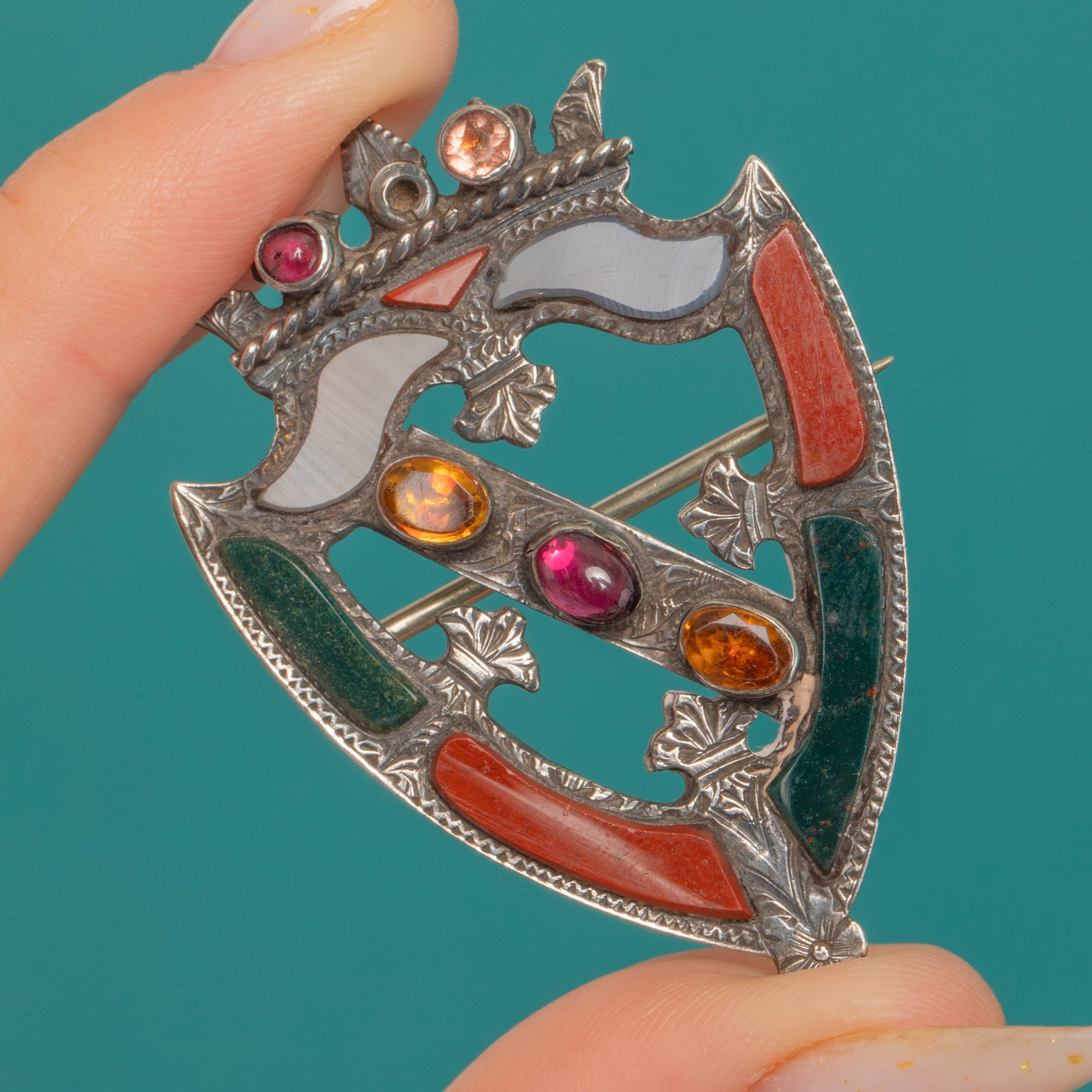 A striking Victorian Scottish “pebble” shield brooch, this crowned heraldic design is richly detailed in Sterling Silver with crisp engraving, thistle-like flourishes and beaded borders. Segmental inlays of Agate, Bloodstone and Carnelian trace the perimeter with beautiful natural colour, while a diagonal band is set with gleaming Citrines and a central Garnet for a bold pop of jewel tones.