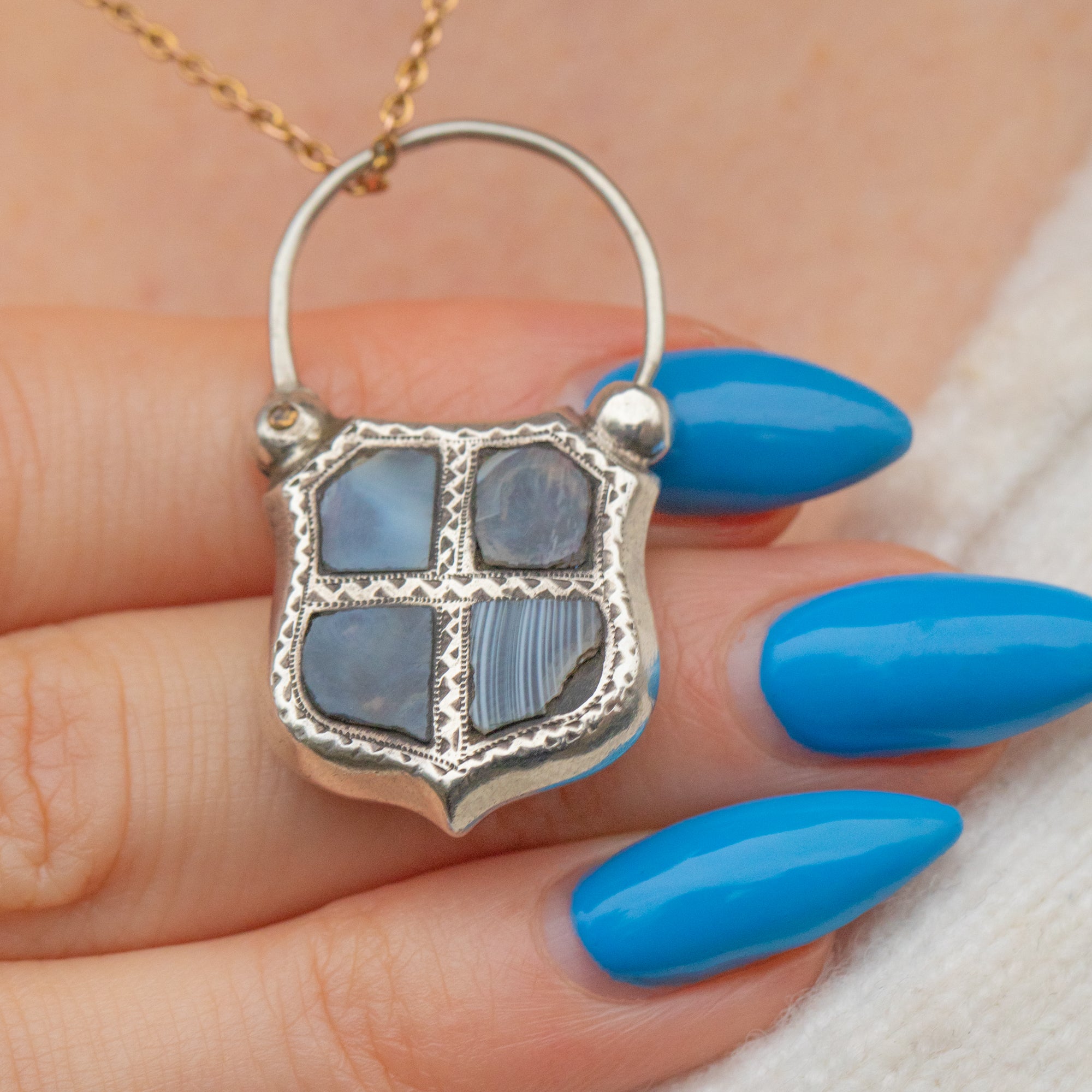 GOOD-VERY GOOD. This Victorian Silver Agate padlock pendant is in lovely antique condition. The Agate have all been hand-cut, and as such aren't a perfect fit for the settings, but they remain secure and we feel this gives the pendant a little extra antique character. The bottom right stone has a chip, but this is only visible under close inspection and the other three are free from signs of wear. The padlock has retained its form remarkably well over the years, with only some minor surface wear on the back, and the Silver is bright with a light patina emphasising the engraved details. The padlock arm works perfectly allowing you to style this piece however you choose and wear it with the utmost confidence!