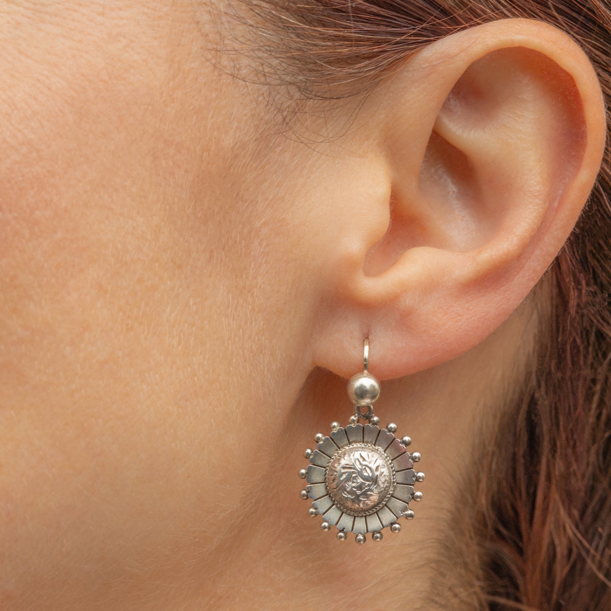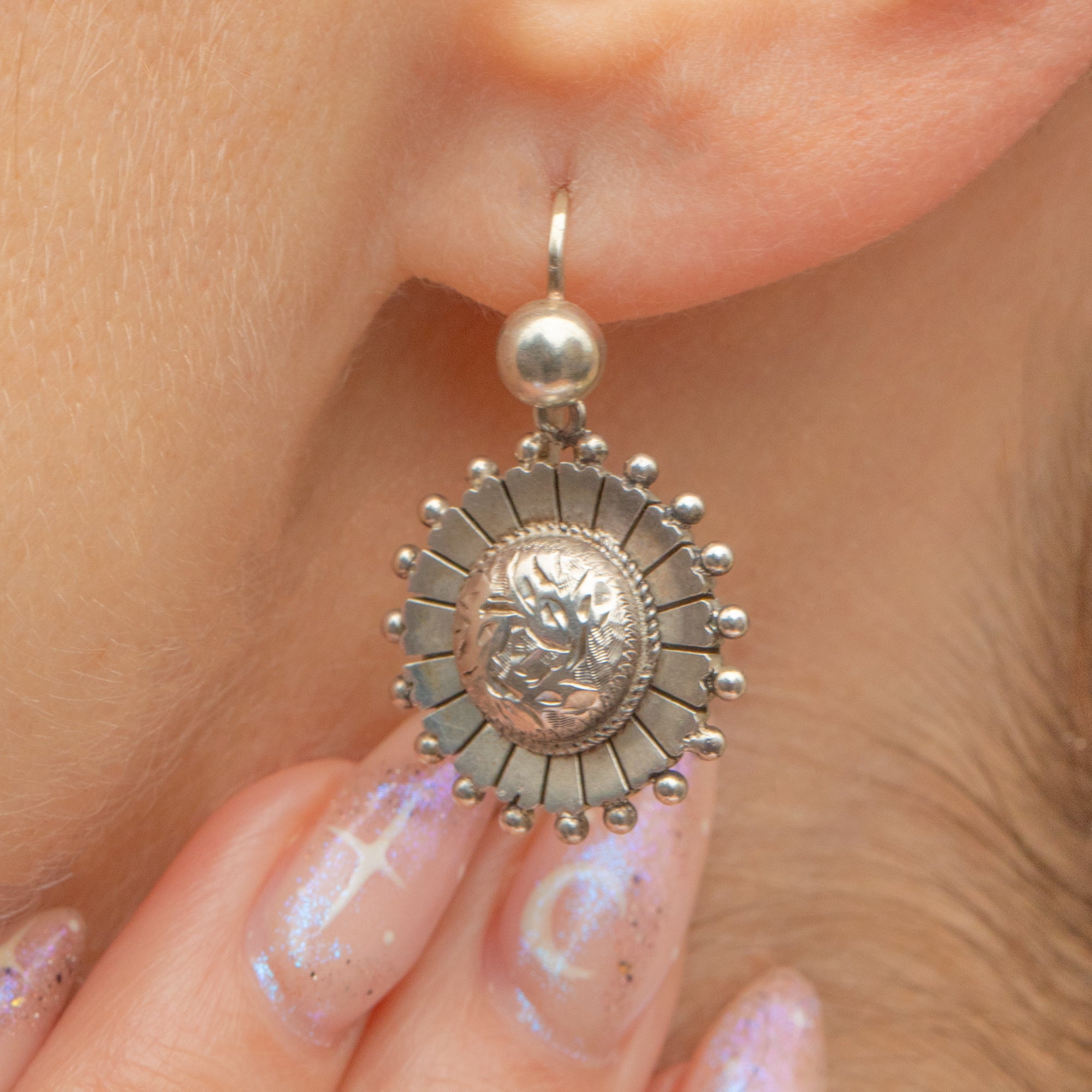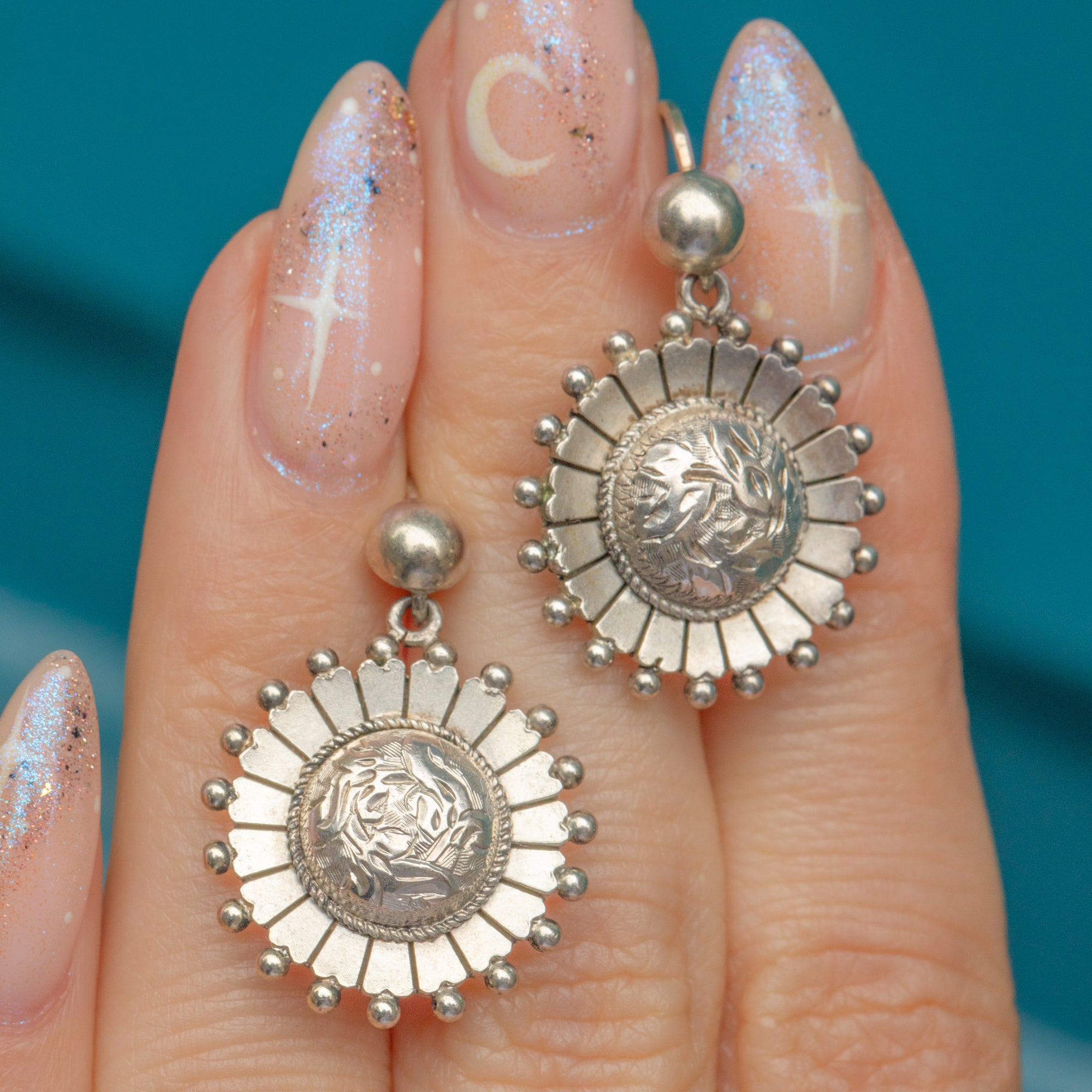 These Victorian Silver engraved earrings are like a breath of fresh air! Akin to bursting sunflowers, their plump centres are inlaid with foliate engravings and a petal-like design running around their circumference.