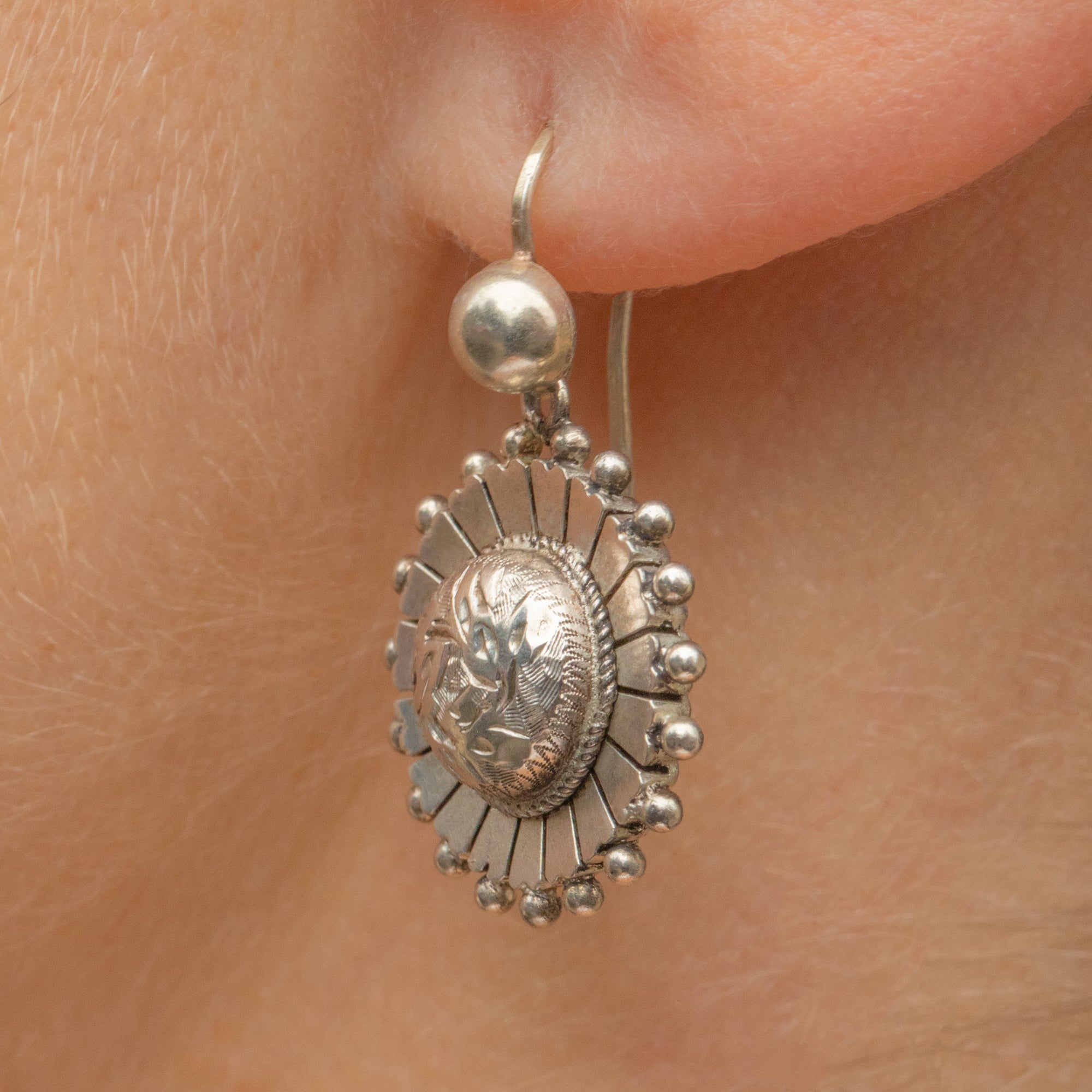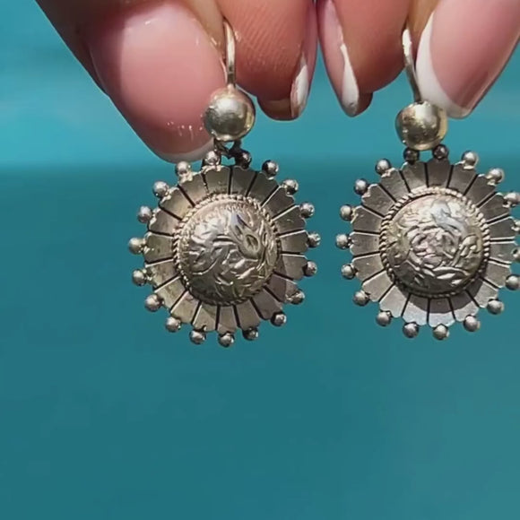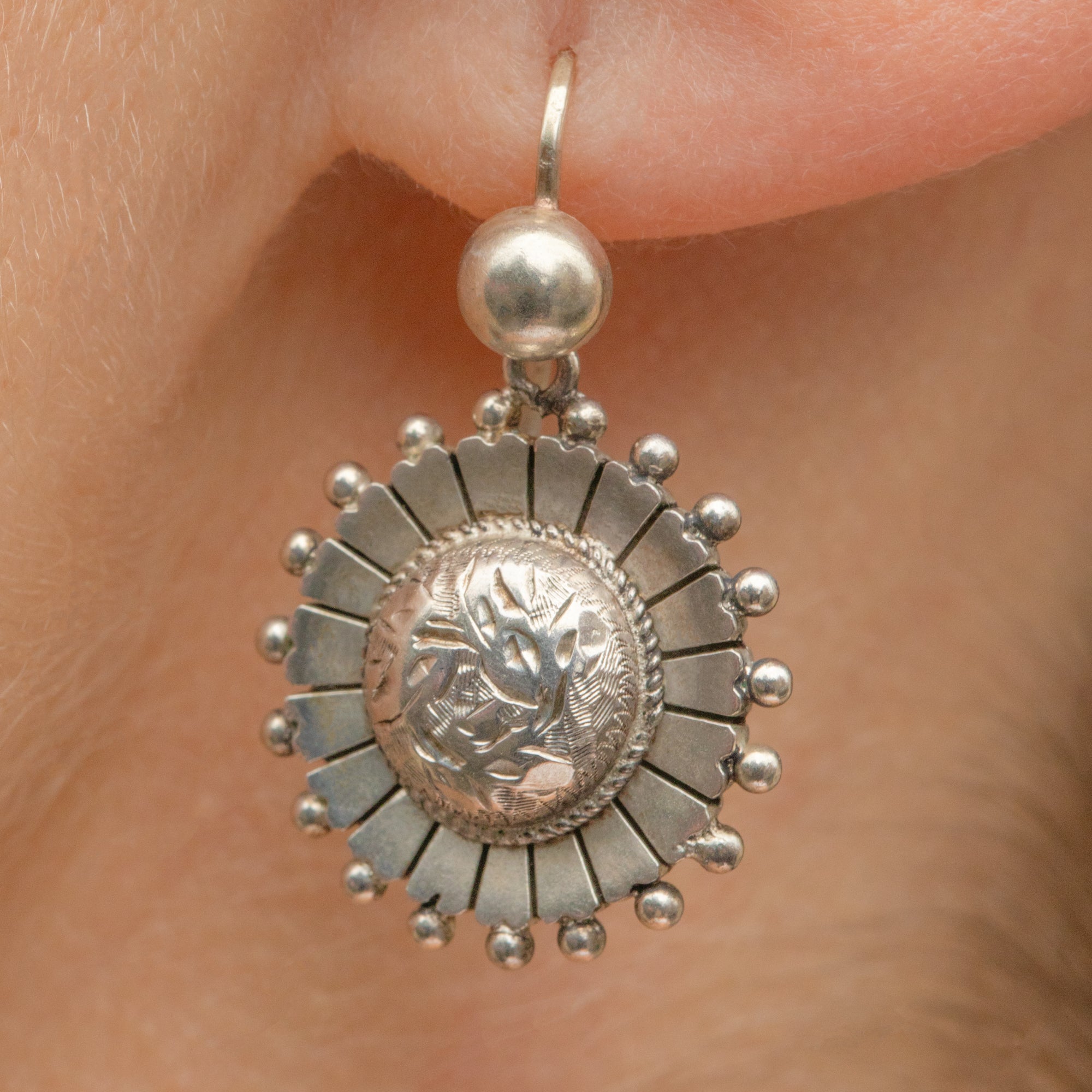 These Victorian Silver engraved earrings are like a breath of fresh air! Akin to bursting sunflowers, their plump centres are inlaid with foliate engravings and a petal-like design running around their circumference.