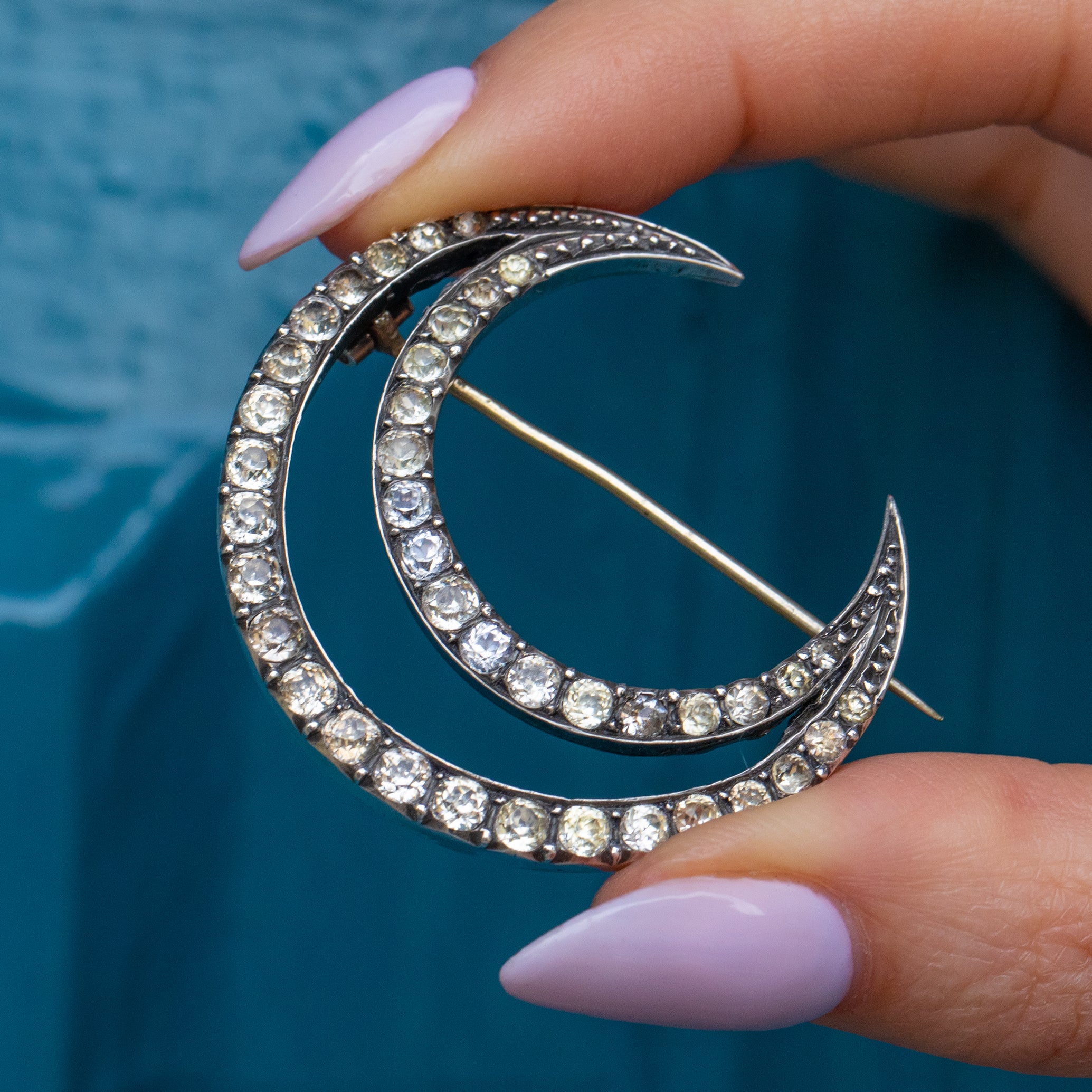 VERY GOOD. This Victorian Silver Paste double row crescent moon brooch is in very good condition. Each Paste gemstone is present and securely set, there is some natural variation in tone but they have retained a brilliant sparkle. The Silver is lustrous with a patina having accrued within the settings creating a wonderful contrast. Under close inspection, there are a few dings around the edge of the settings, commensurate with age, but this does not affect the integrity of the piece. With a fully and securely functioning metal pin and c clasp, you can wear this sublime Victorian crescent brooch with utmost confidence!
