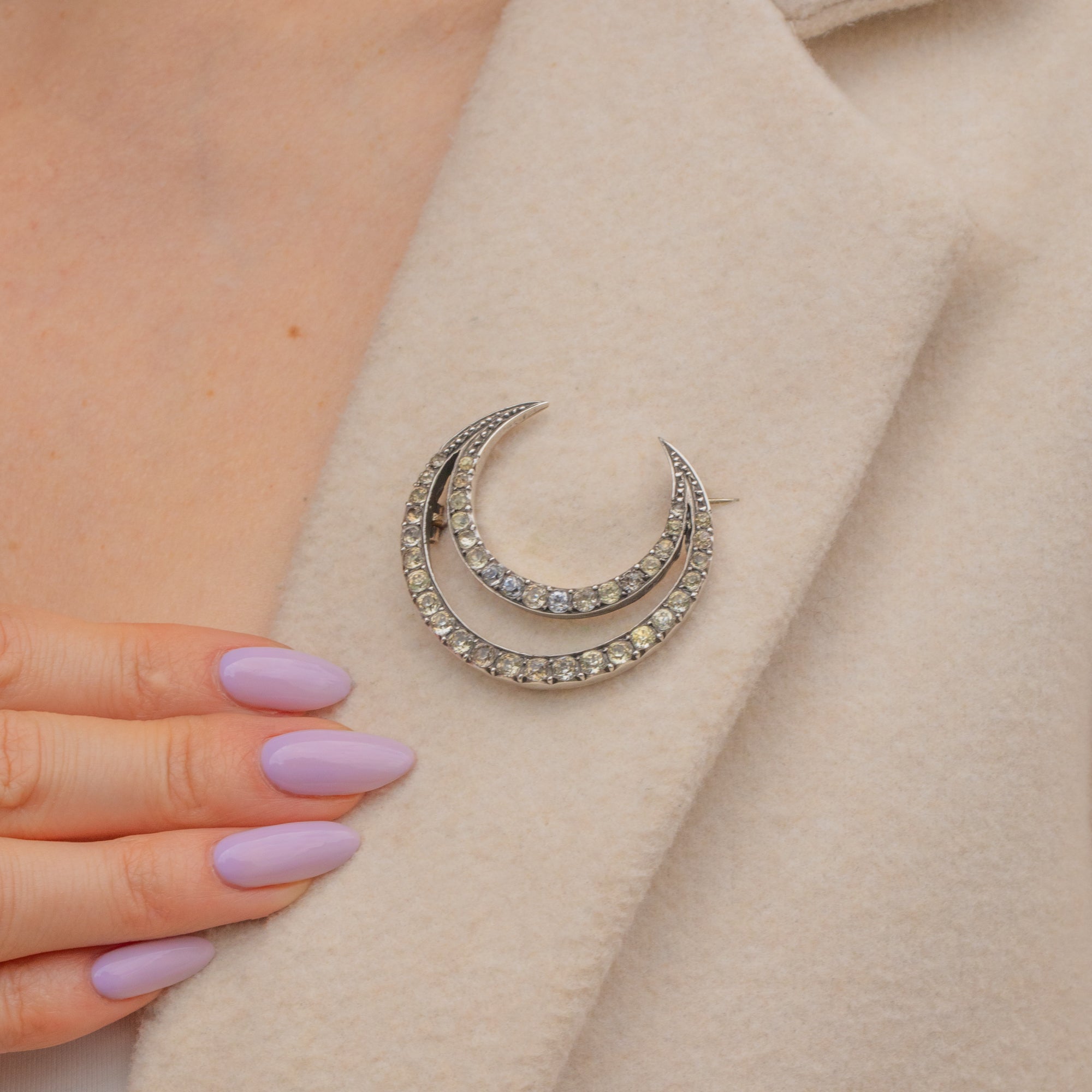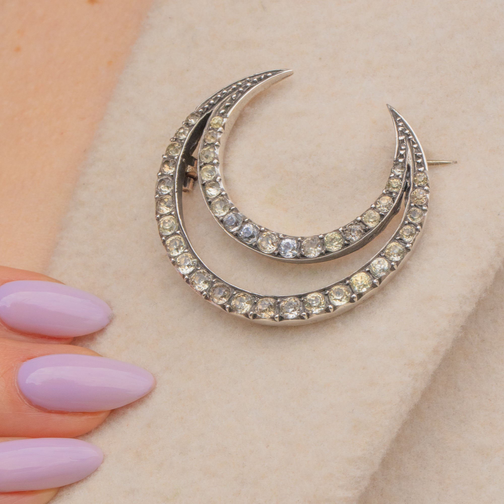 Add a glittering accent to any attire with this striking Victorian Silver Paste double row crescent moon brooch! Crafted from Sterling Silver, the curvaceous form of this crescent is inlaid with a plethora of hand-cut Paste gems that scintillate in all lighting conditions.