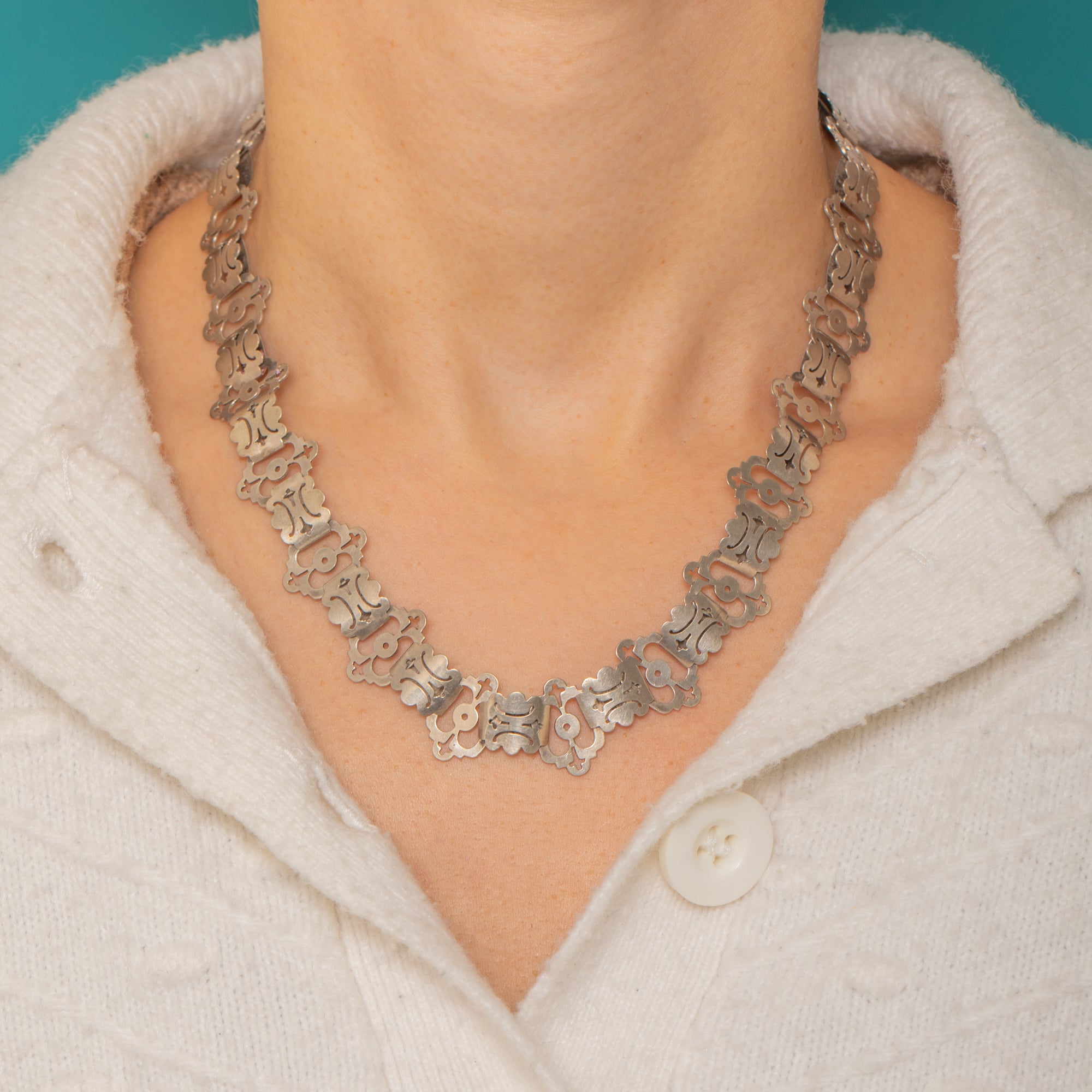 A beautifully ornate Victorian Silver book chain collar, pierced with gothic quatrefoils and tiny crosslet details across a procession of scalloped plaques. The articulated panels sit close to the neckline, with raised ribbon-like strips and domed stud accents catching the light against a soft, even patina.