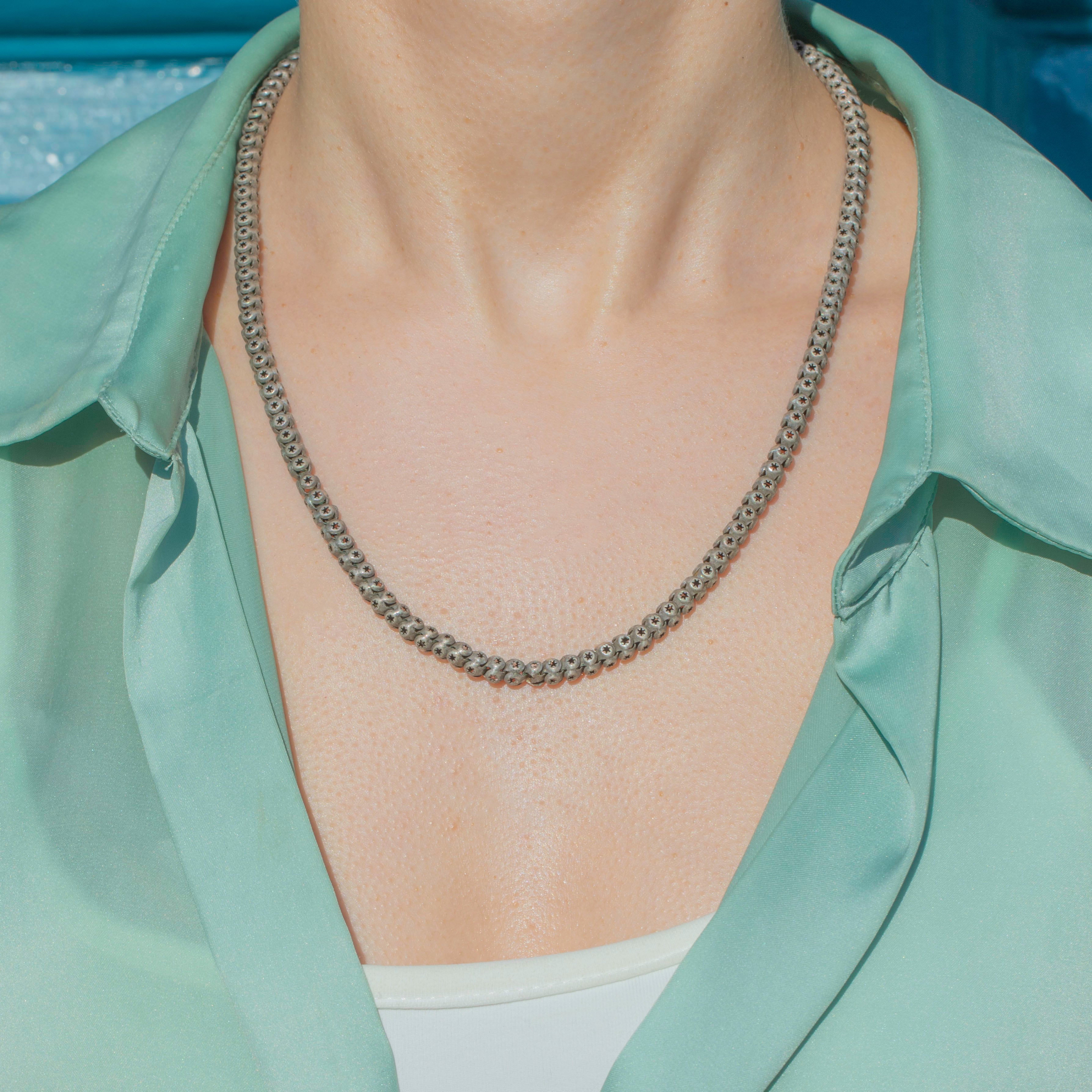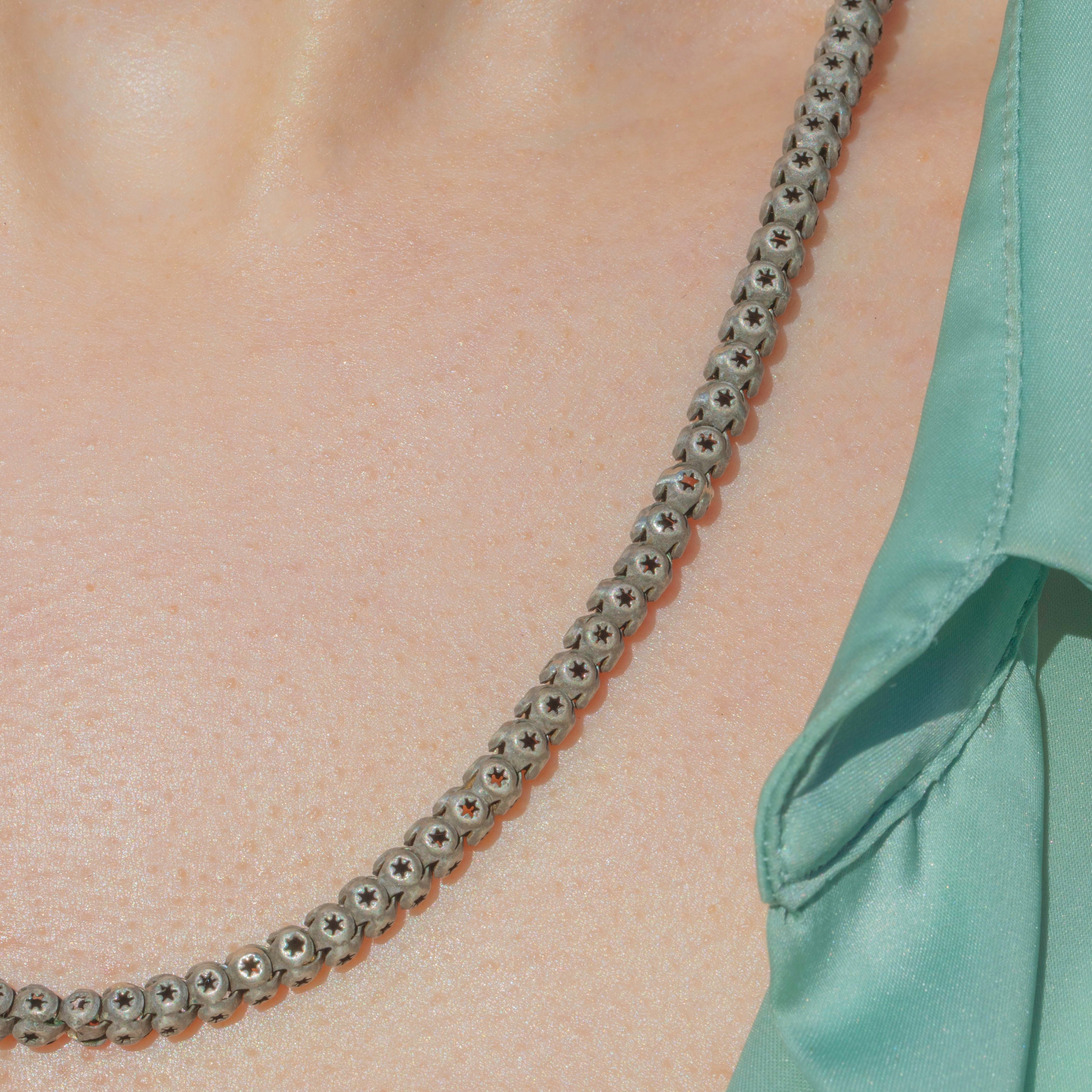 This Victorian Silver pierced star link chain is a chunky delight and will make an impact adorning your décolletage! The rounded box links have been exquisitely crafted, each one displaying an intricately pierced star on every side.