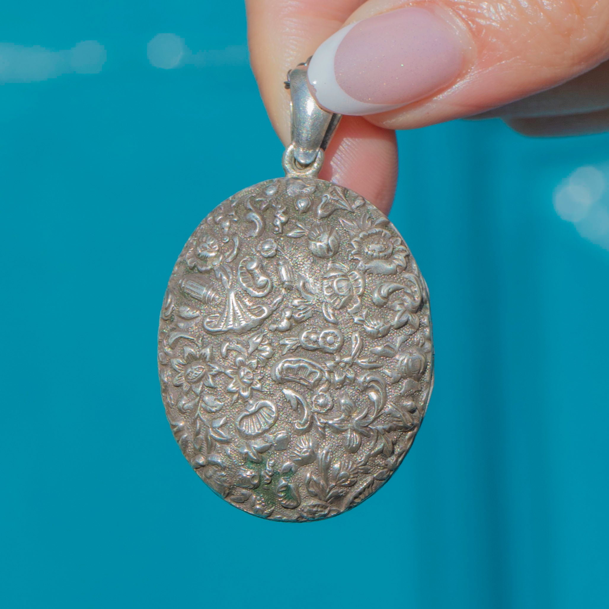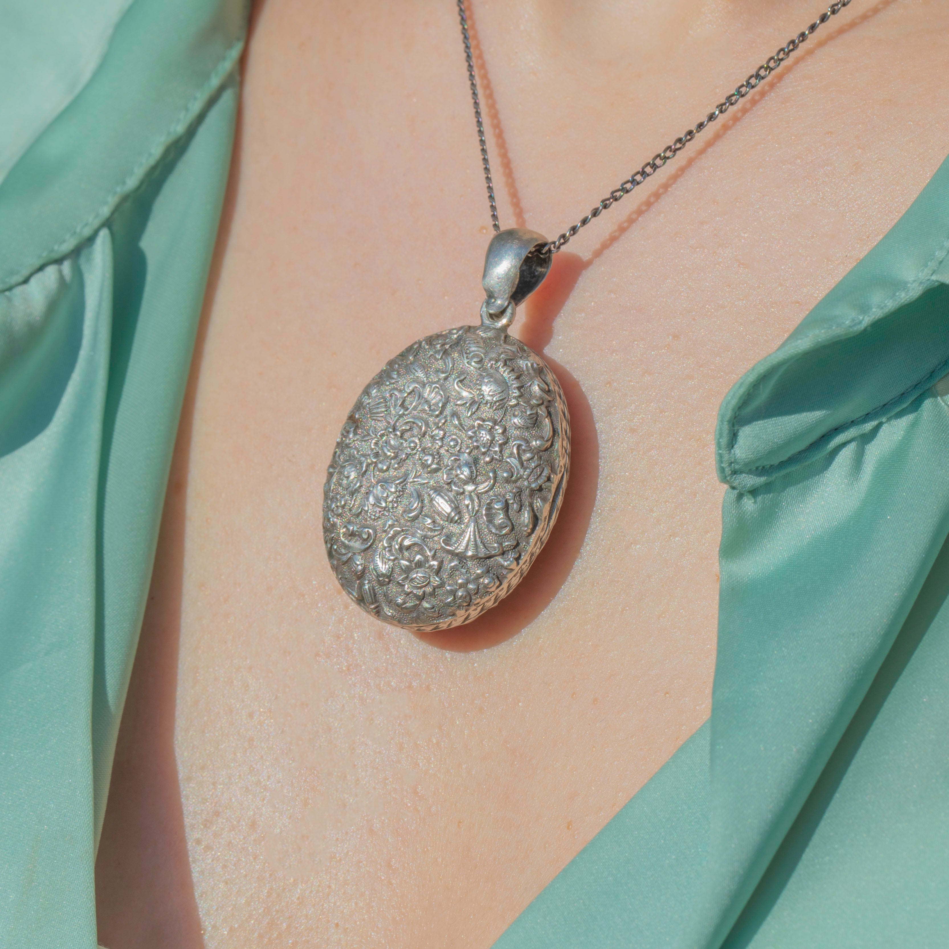 From thistles to forget-me-nots and dainty shells, this Victorian Silver locket is steeped in romantic sentiment! The impressive size of this repoussé locket makes it the ultimate statement piece, and with space for you to place a cherished photograph inside, she will make a sentimental addition to your collection.