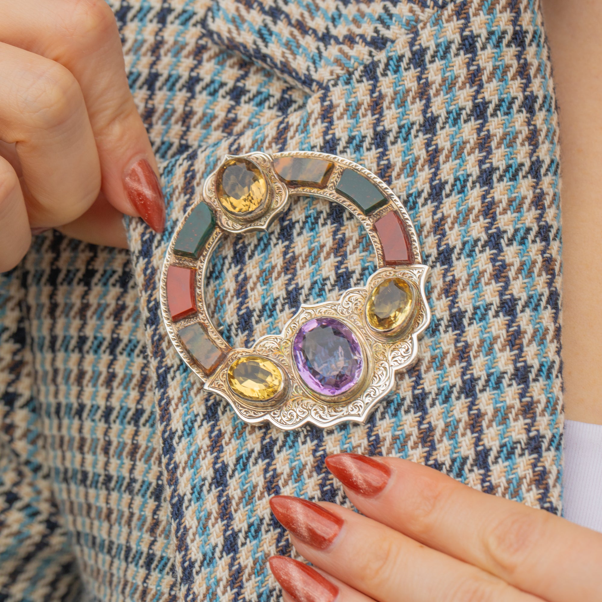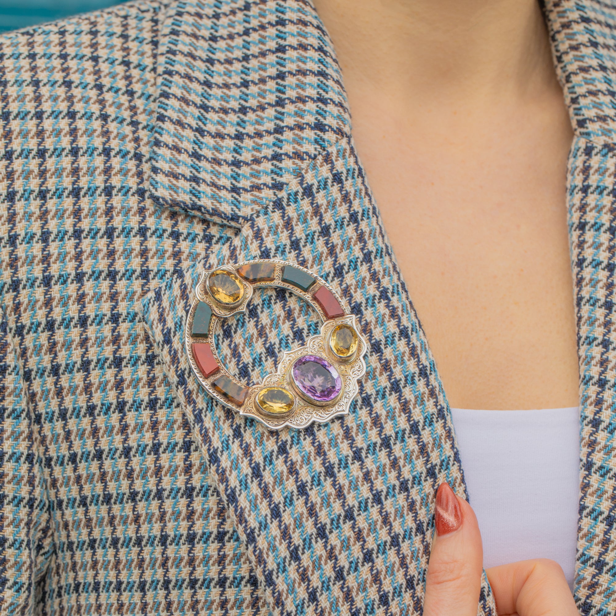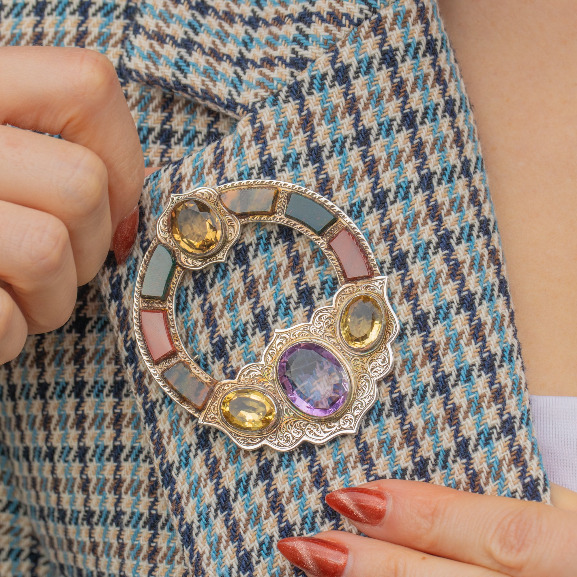 At the bottom of the brooch sits a plump 6.60ct Amethyst, adorned by three lemon-hued Citrine stones, the soft yellows and lilac tones complementing each other wonderfully. She is complete with six earthy Agate stones, each saturated with earthy tones.