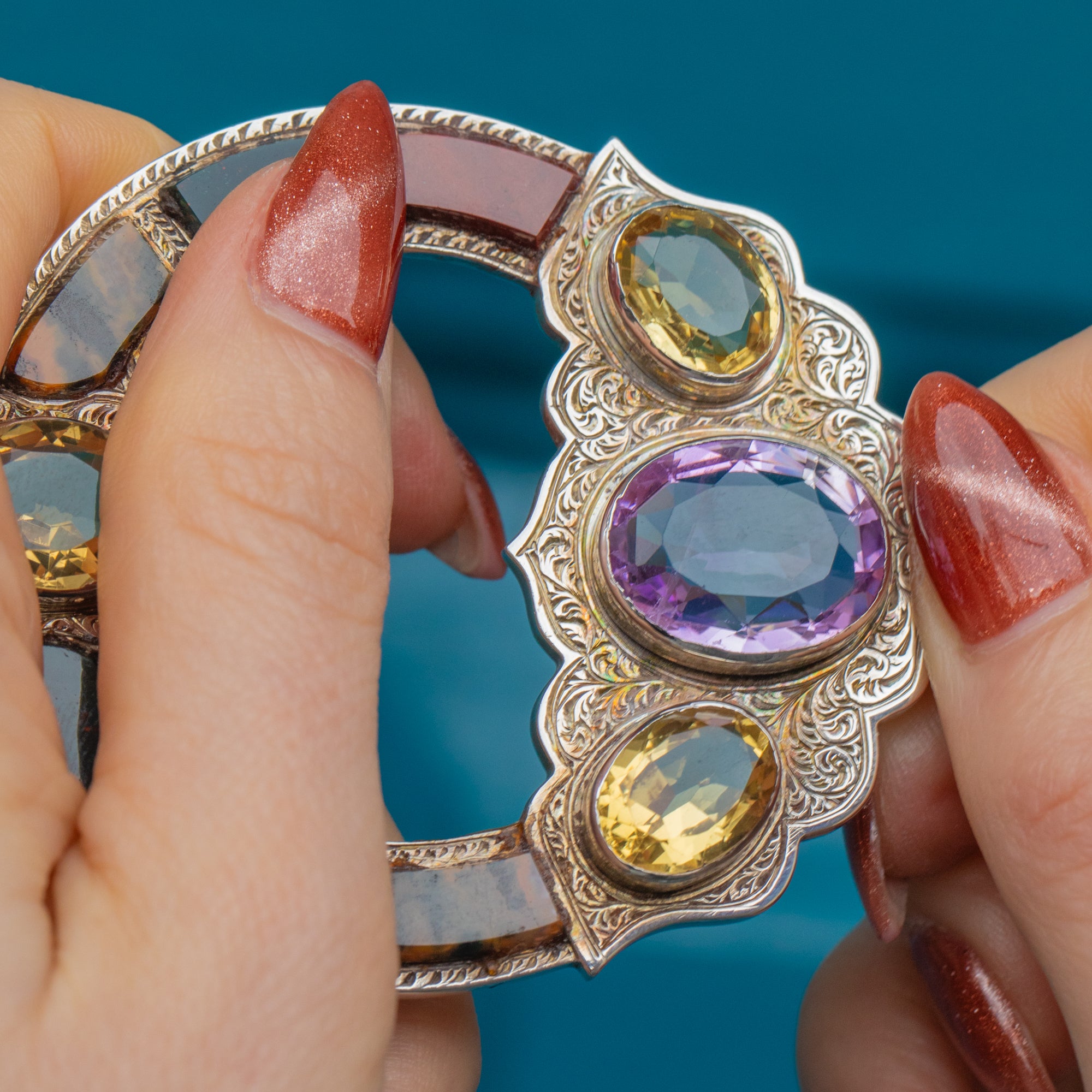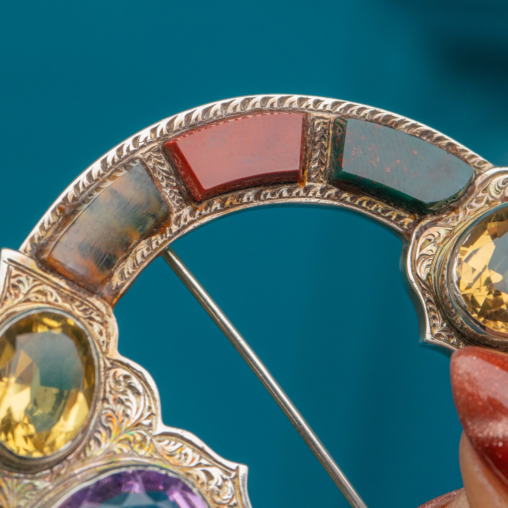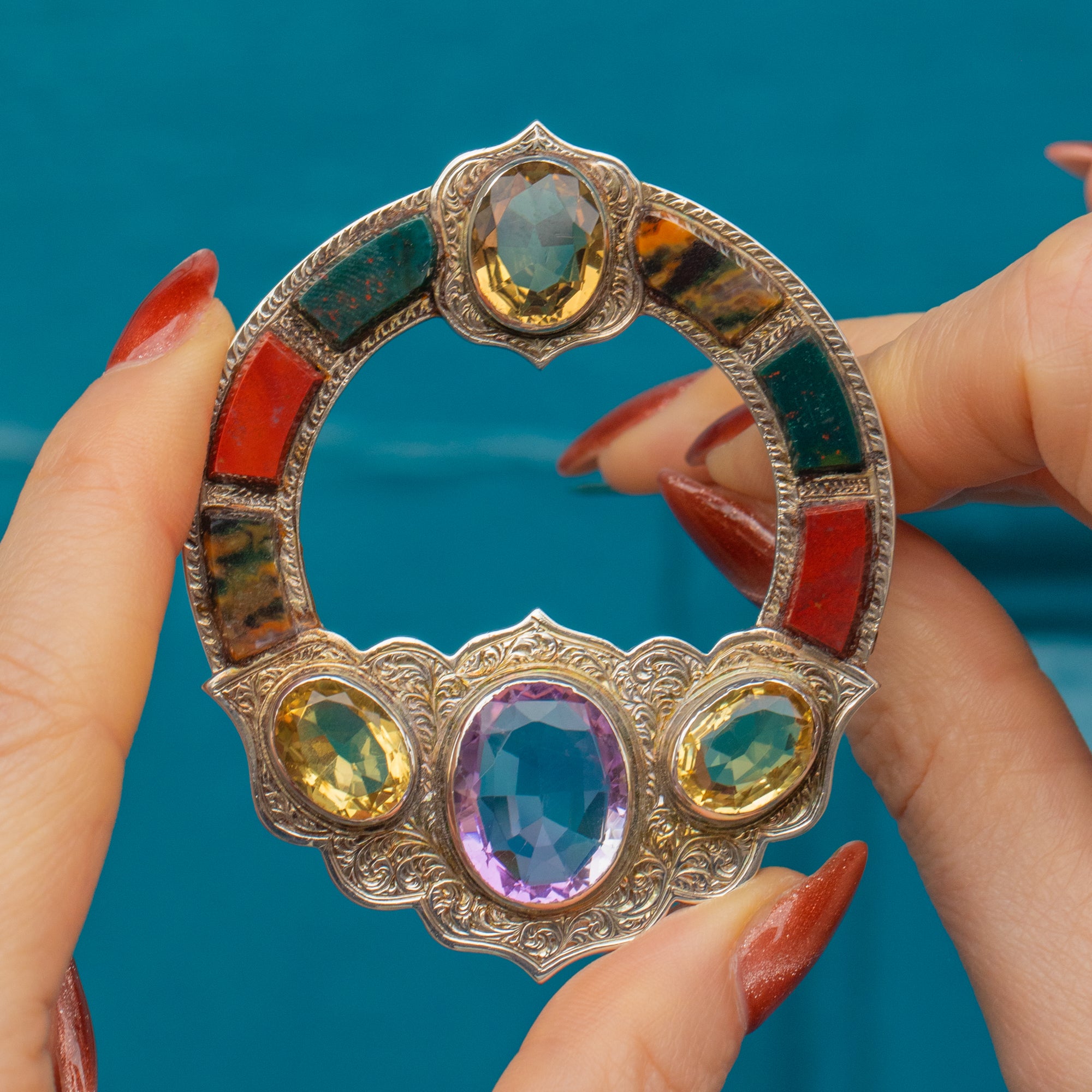 At the bottom of the brooch sits a plump 6.60ct Amethyst, adorned by three lemon-hued Citrine stones, the soft yellows and lilac tones complementing each other wonderfully. She is complete with six earthy Agate stones, each saturated with earthy tones.