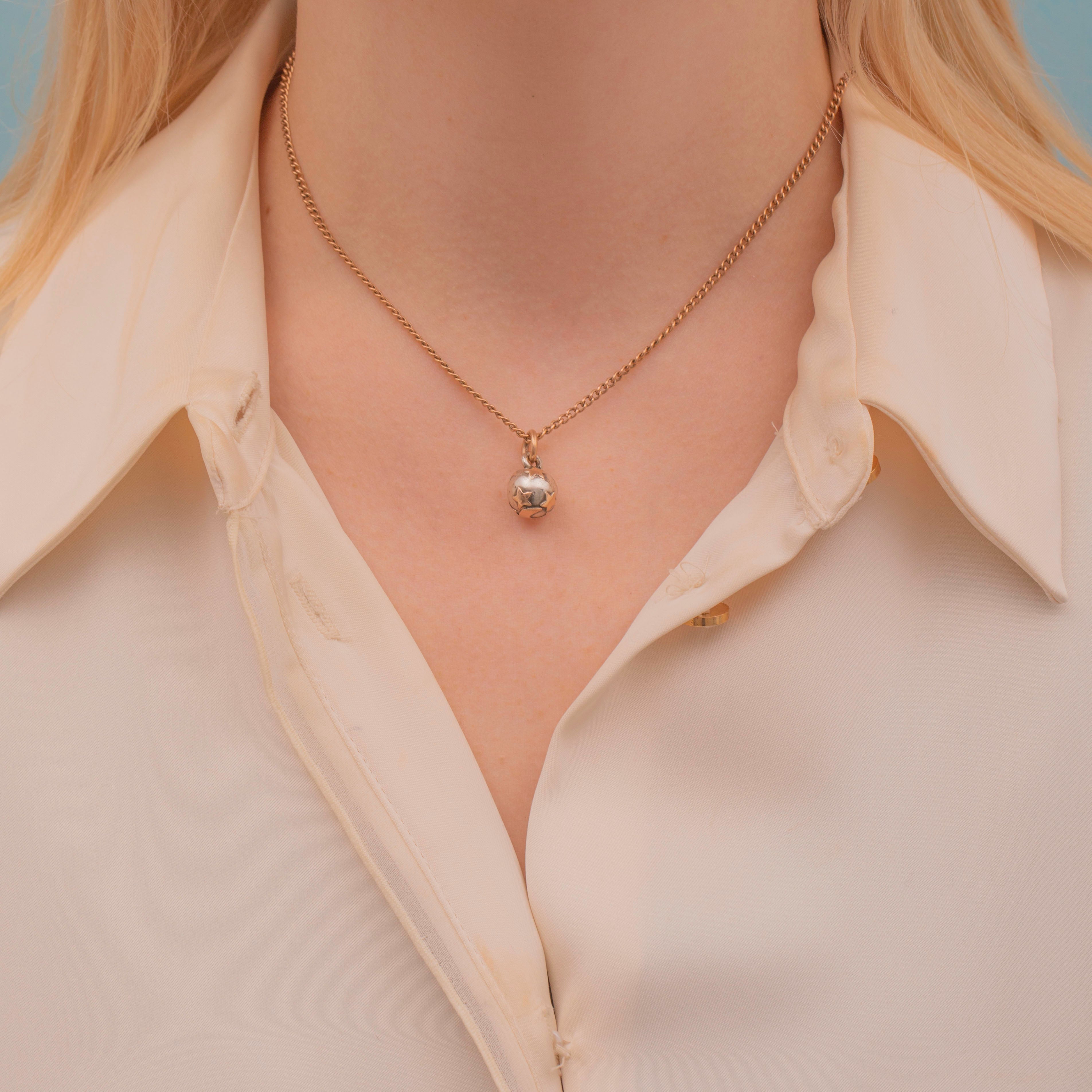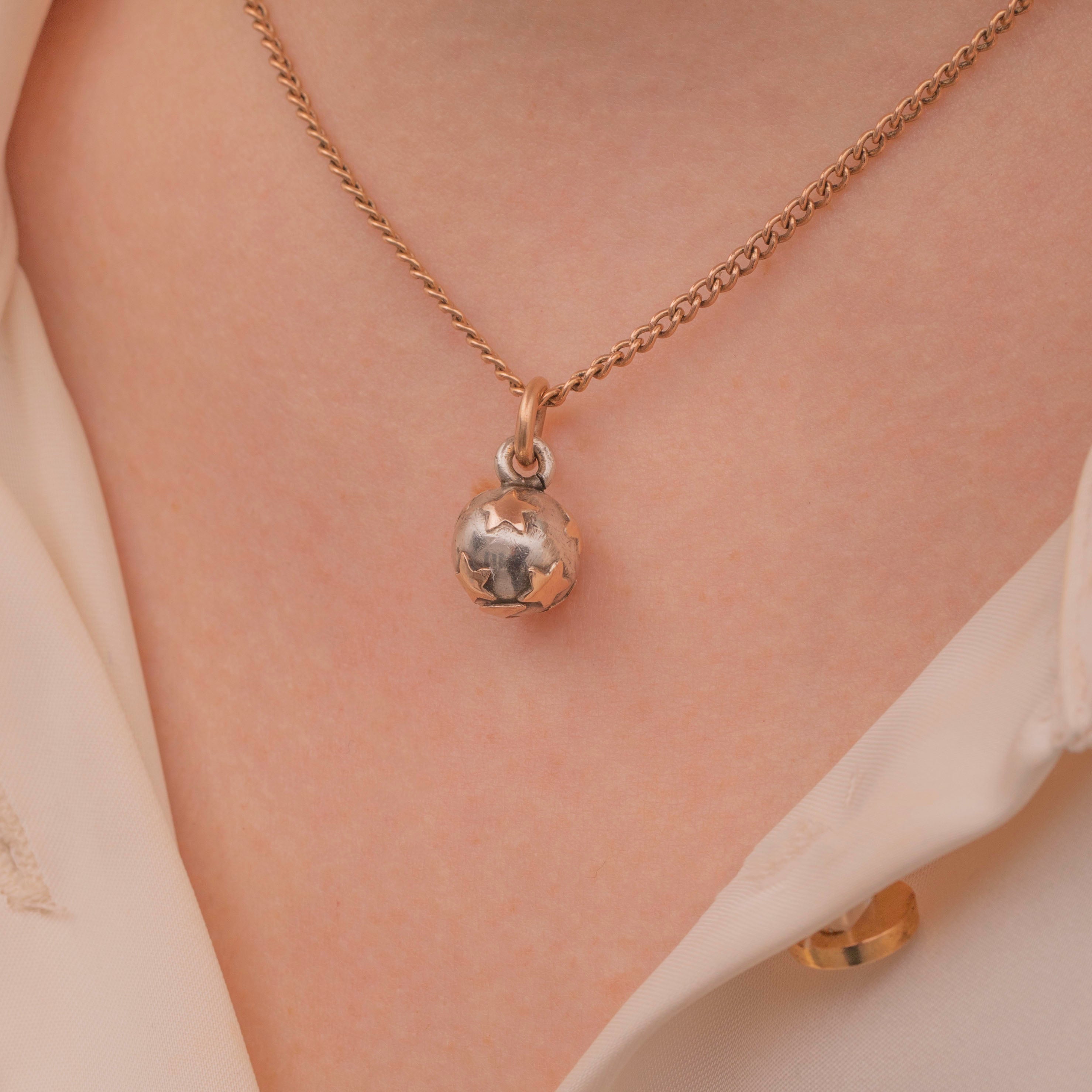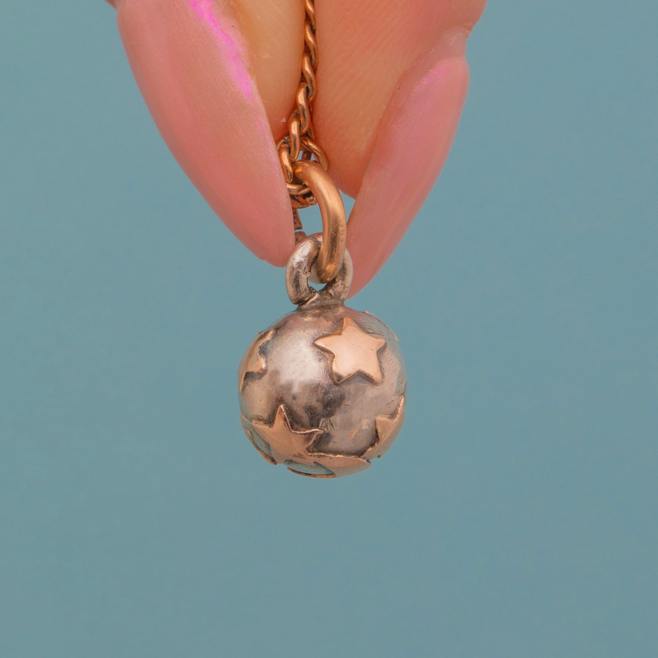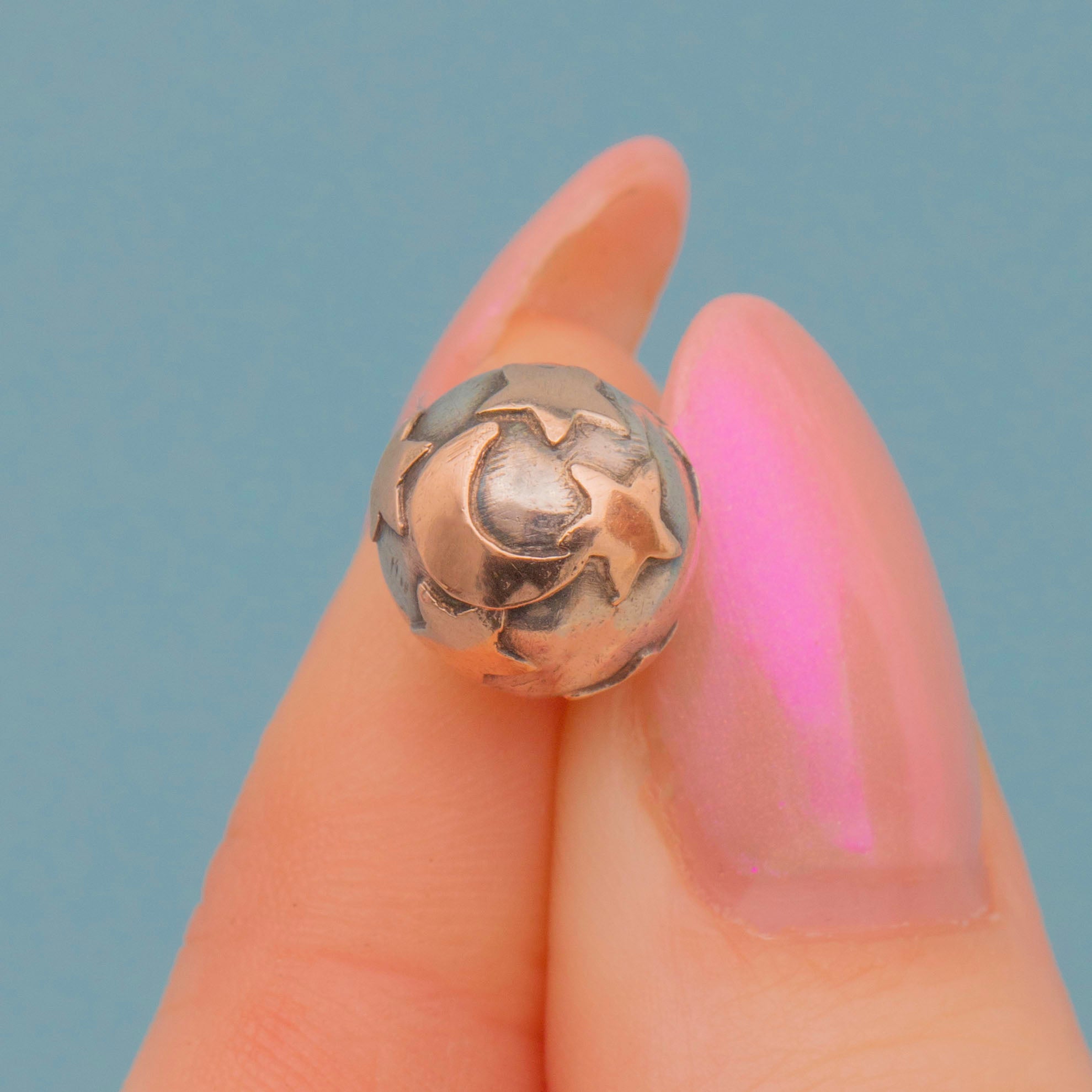 We have fallen in love with this Victorian Silver star & moon orb charm! The orb is crafted from solid Sterling Silver and its smooth surface has been adorned in 9ct Gold stars and a crescent moon.