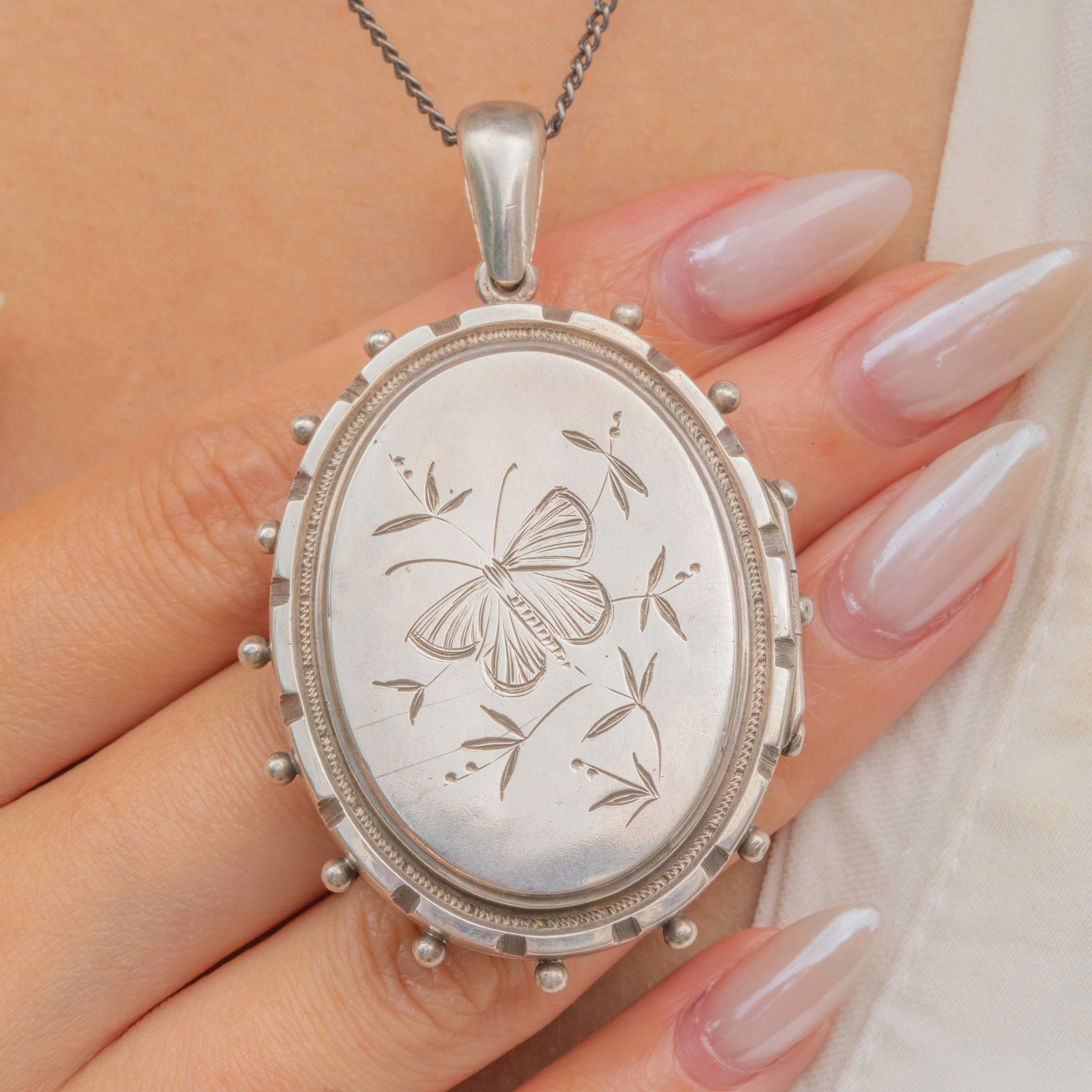 Victorian Sterling Silver Engraved Butterfly Oval Locket, c.1879 Item added
