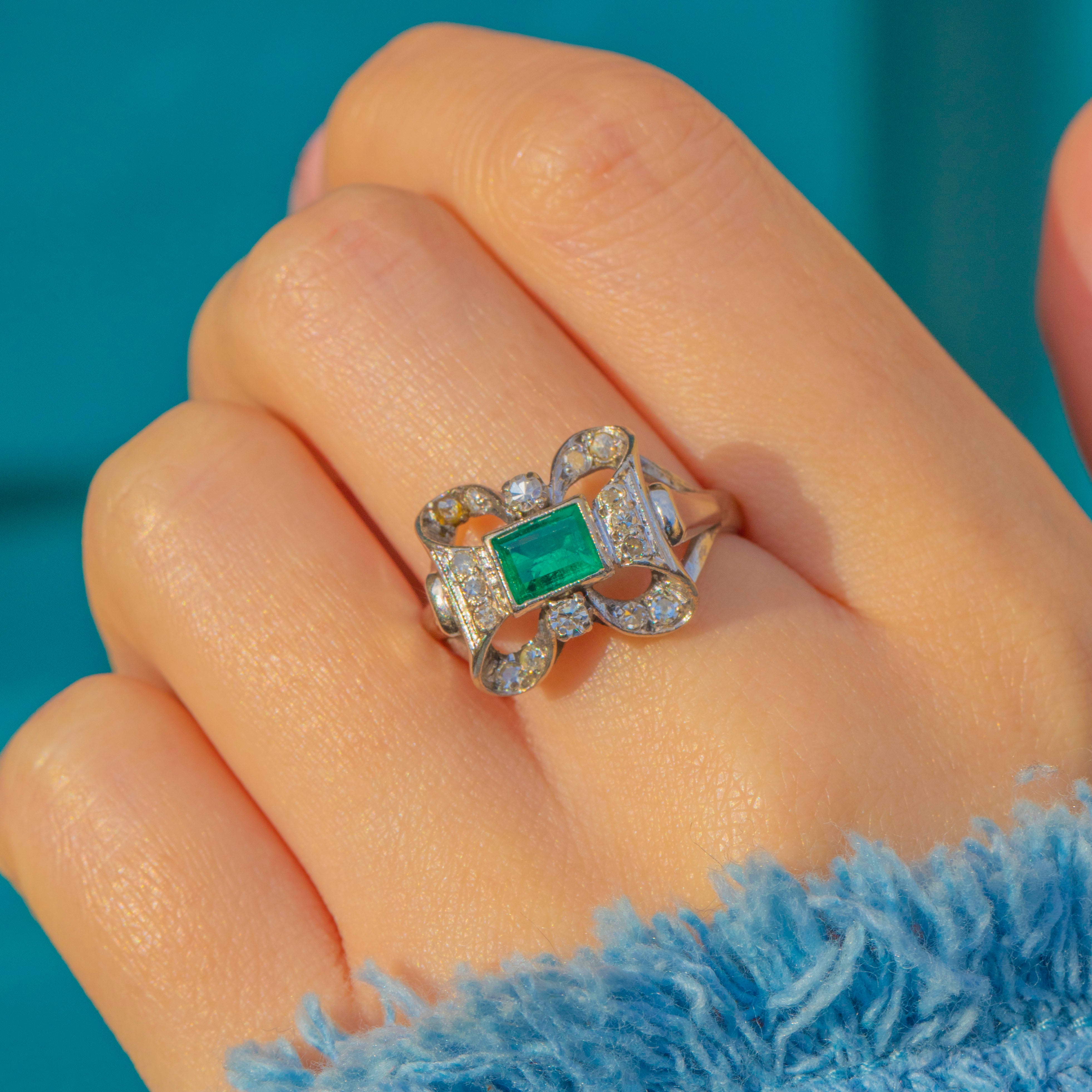 VERY GOOD: The Emerald shows natural inclusions, and the Diamonds are securely set with light wear commensurate with age. The band shows evidence of previous resizing with some minor discolouration, not visible during wear. Overall light surface wear to the metal consistent with careful vintage use.