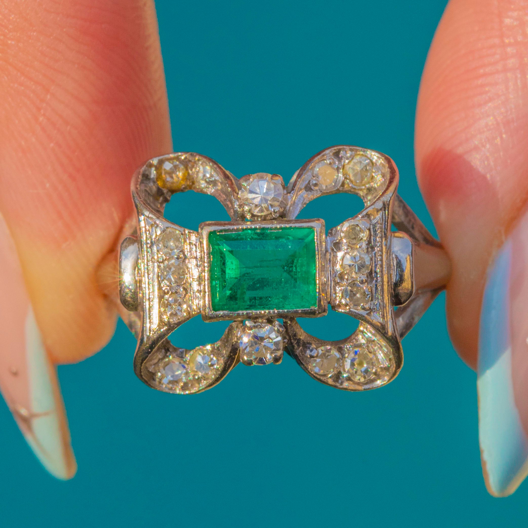 Vintage 18ct White Gold Emerald Diamond Bow Cocktail Ring