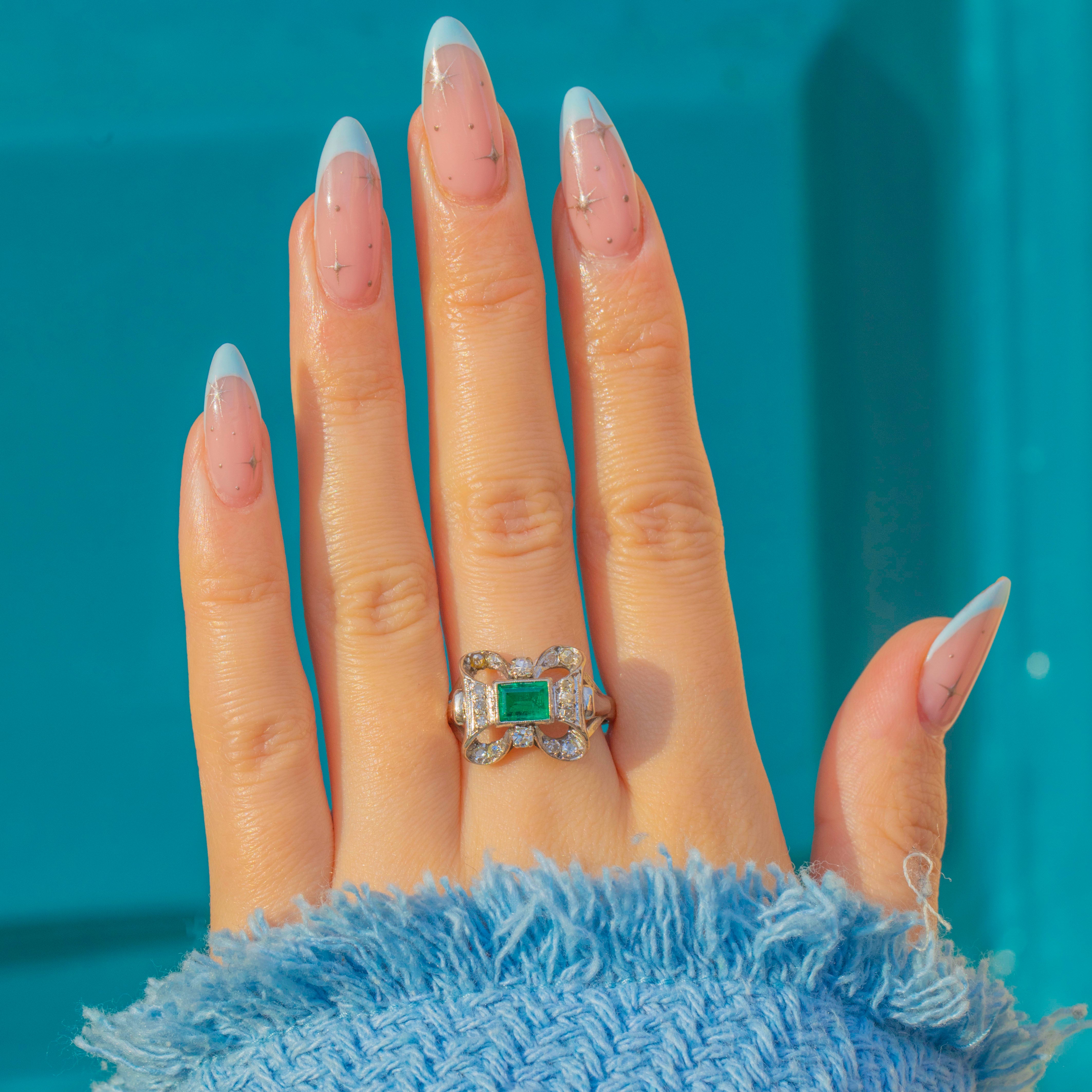 A glamorous mid-century cocktail ring, crafted in 18ct White Gold with a bold architectural bow silhouette. At its heart sits a rectangular step-cut Emerald in a fine milgrained bezel, its vibrant green beautifully framed by pavé-set Diamonds that form an elegant bow-inspired openwork panel.