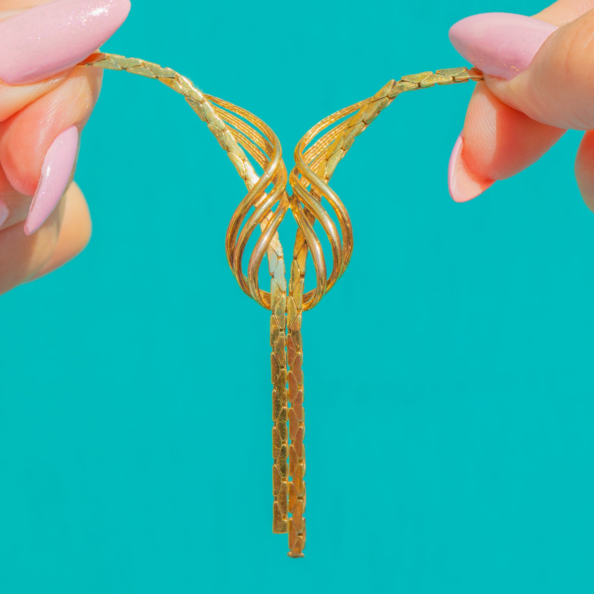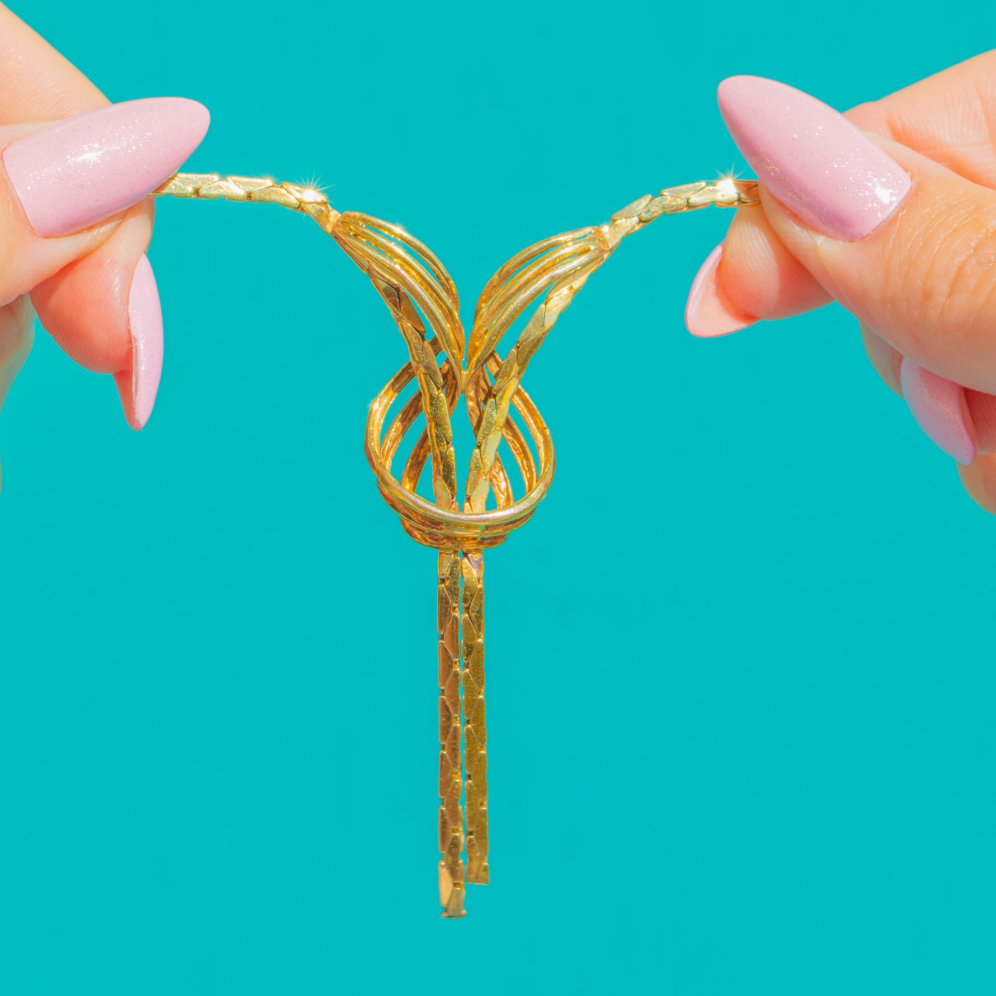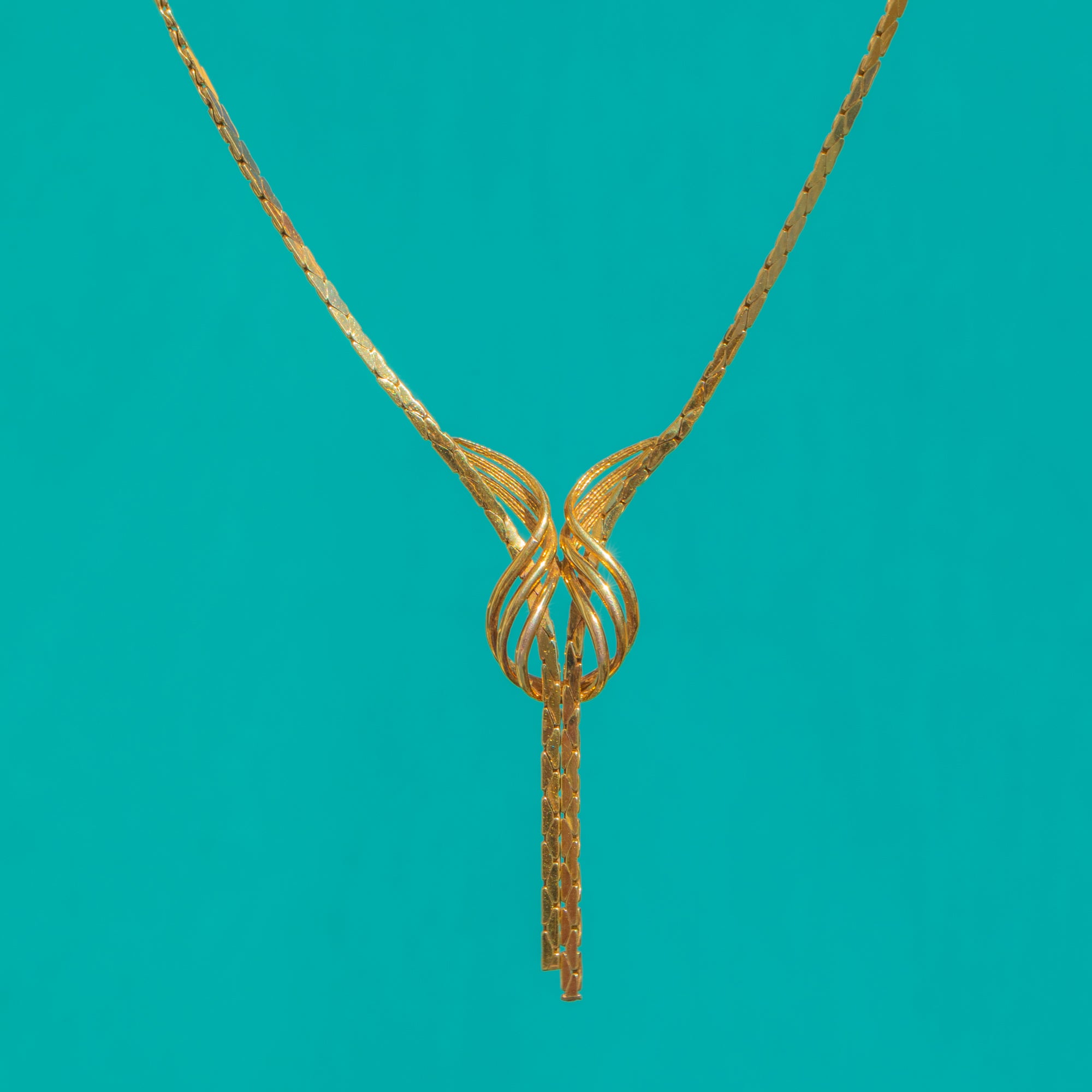 A glamorous 1970s statement in glowing 9ct Gold, this fancy Y‑style necklace centres on a sculptural ribbon‑knot with sleek tassel drops. The high‑polish, flat ribbon‑style links catch the light beautifully, giving that bold, retro allure the era is loved for.