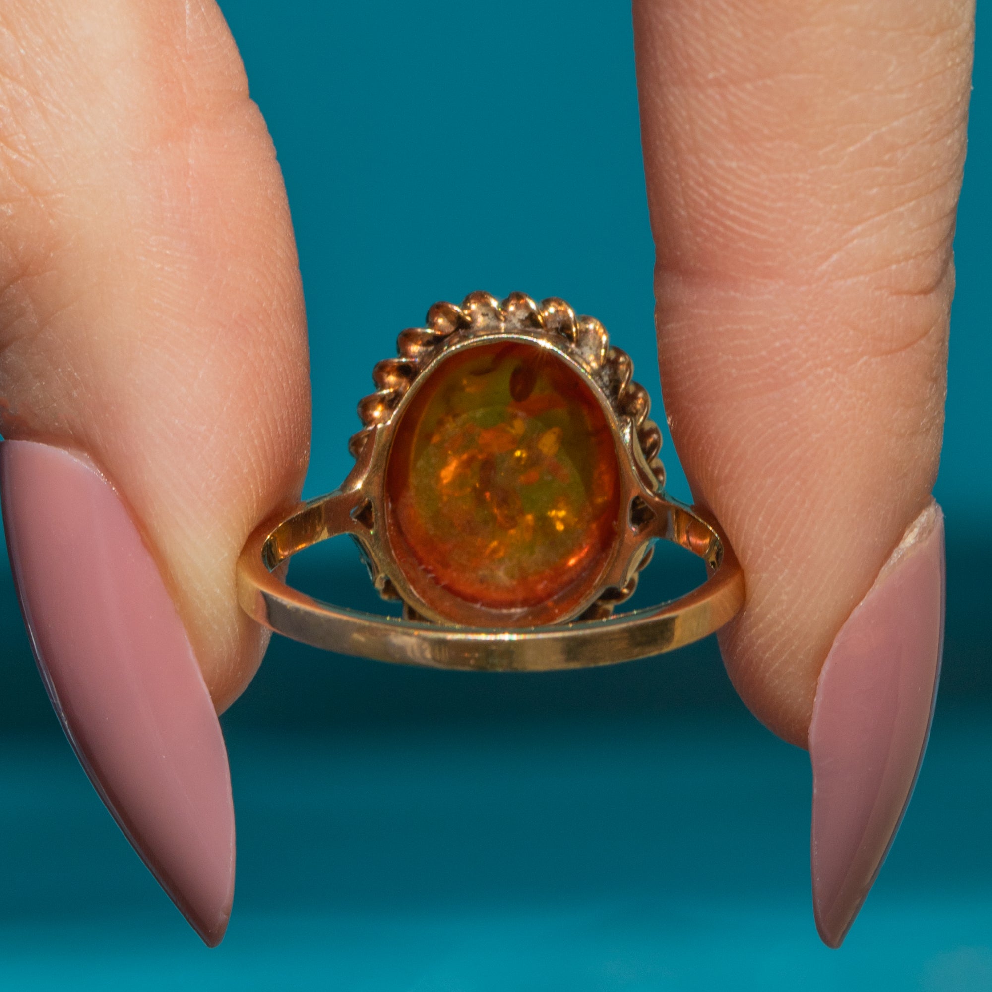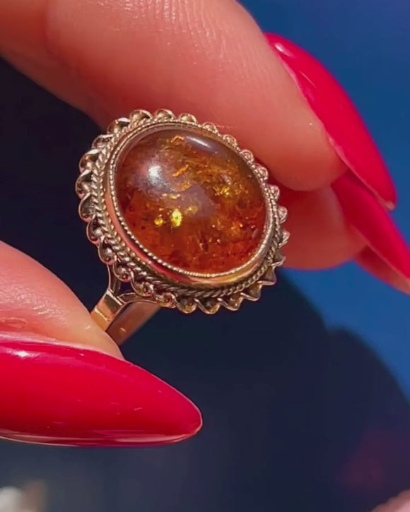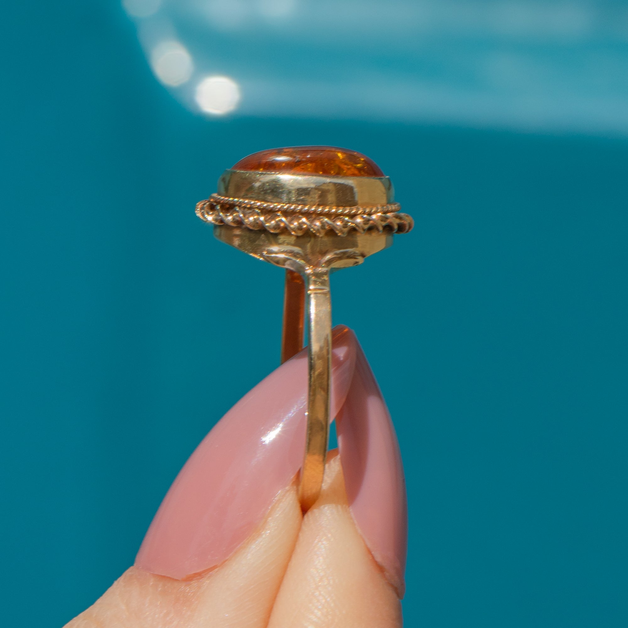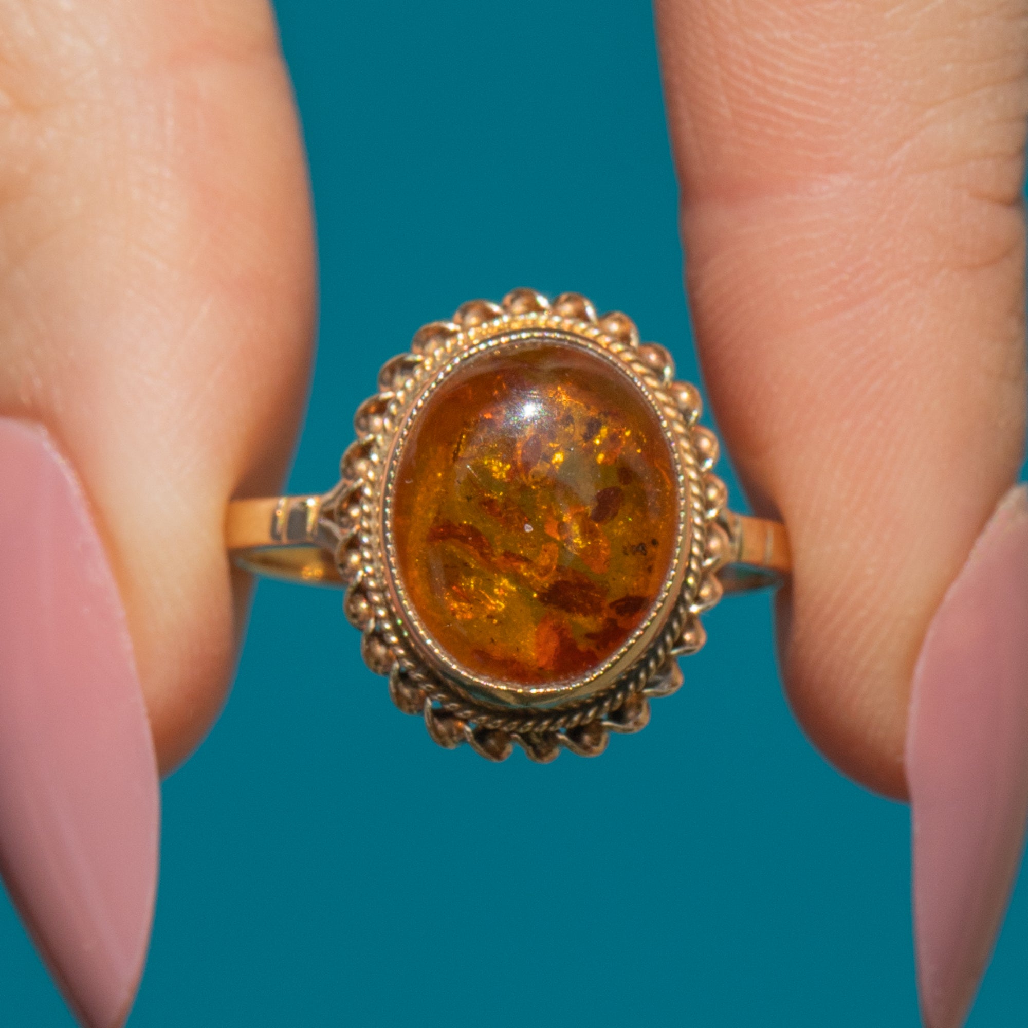 This Vintage 9ct Gold Amber ring is a tangerine dream! With a tangy marmalade core, her inclusions are akin to Gold confetti catching beneath the light beautifully.