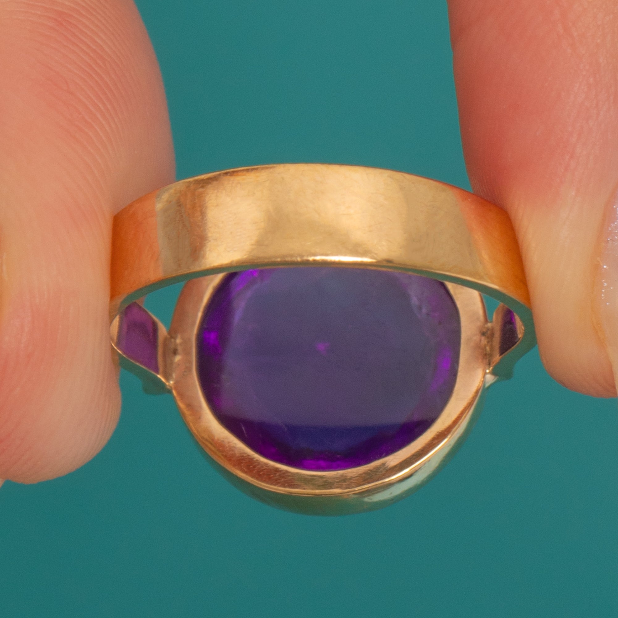 EXCELLENT: The Amethyst presents beautifully with surface wear commensurate with age visible under magnification, retaining strong colour and gloss. The 9ct Gold bezel and shank show light surface wear from gentle past use and remain sturdy. No visible resizing or restoration.
