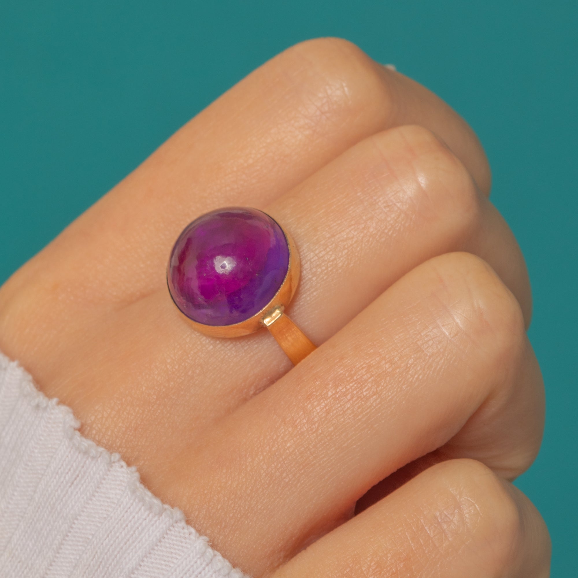 Irresistibly bold, this vintage Amethyst solitaire ring showcases a high-domed 'crystal ball' cabochon in a rub-over bezel of rich 9ct Gold, the ring's clean lines giving a modernist presence that feels effortlessly chic.