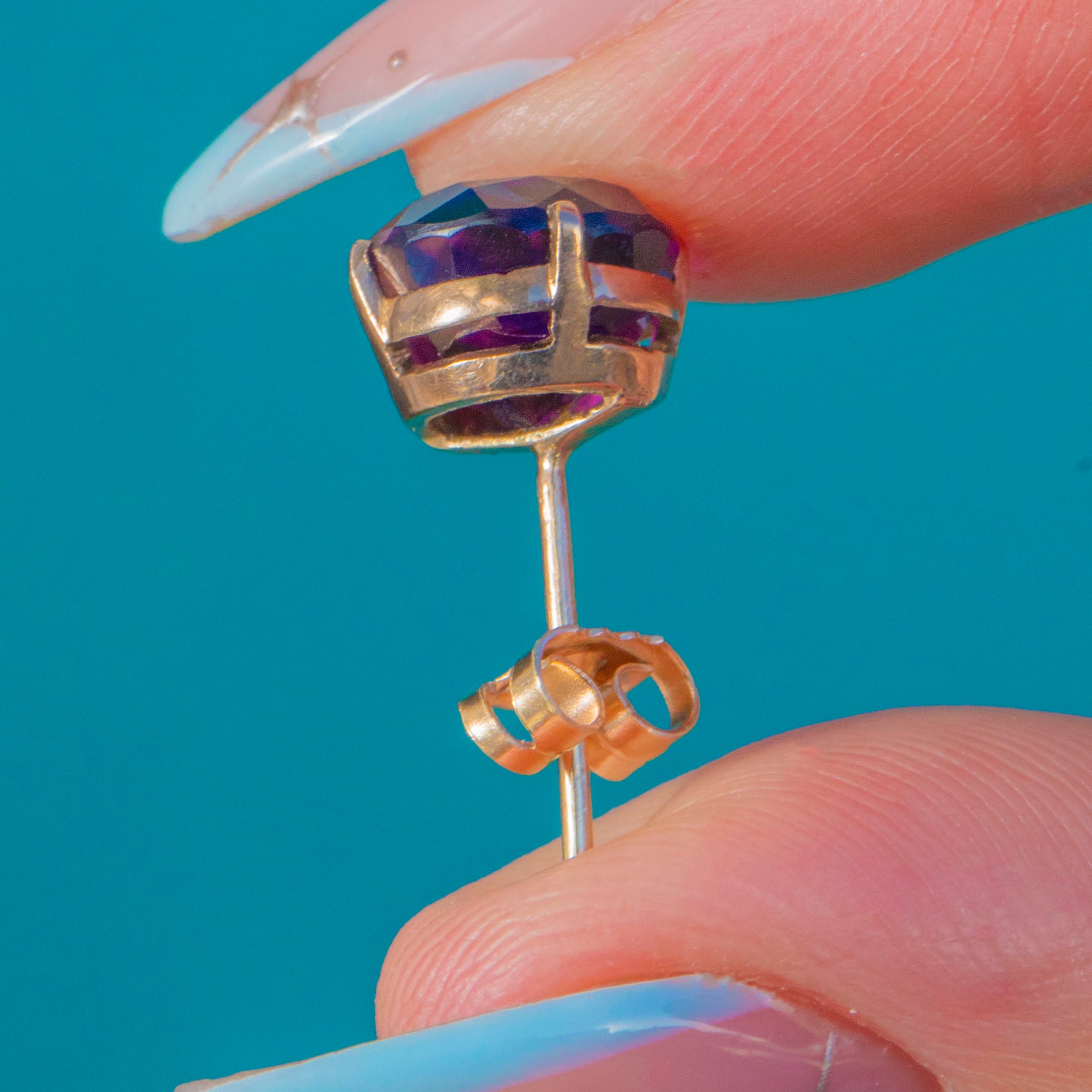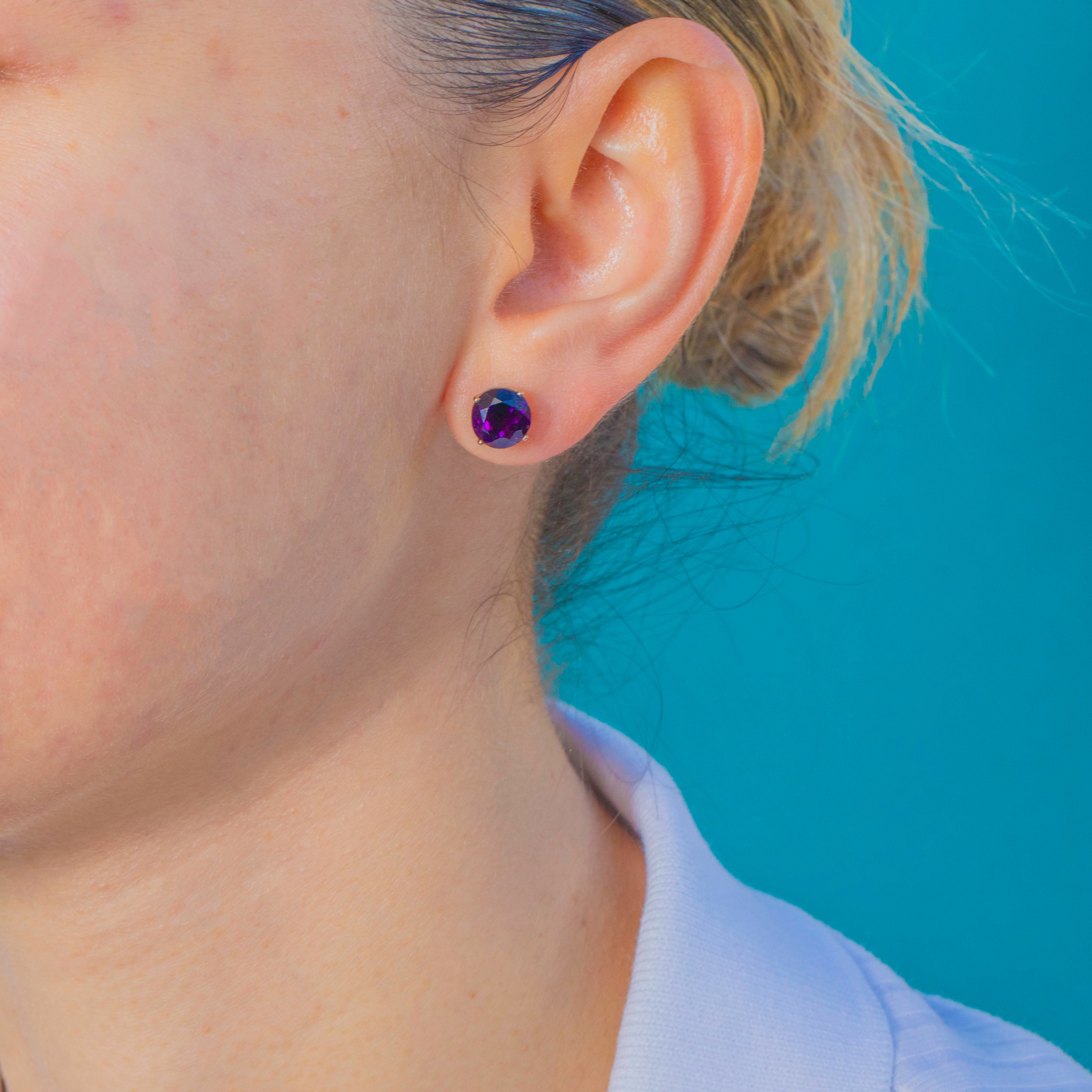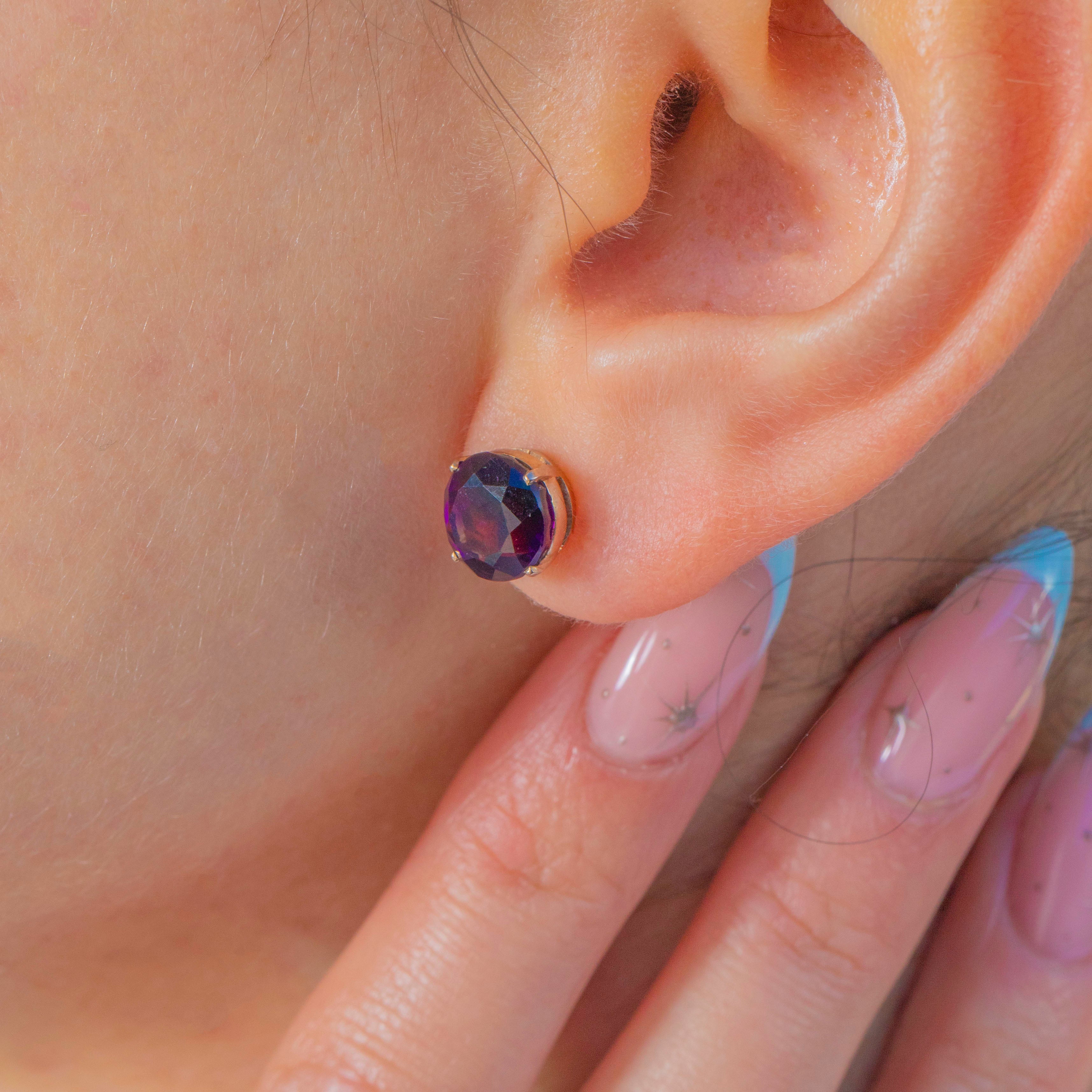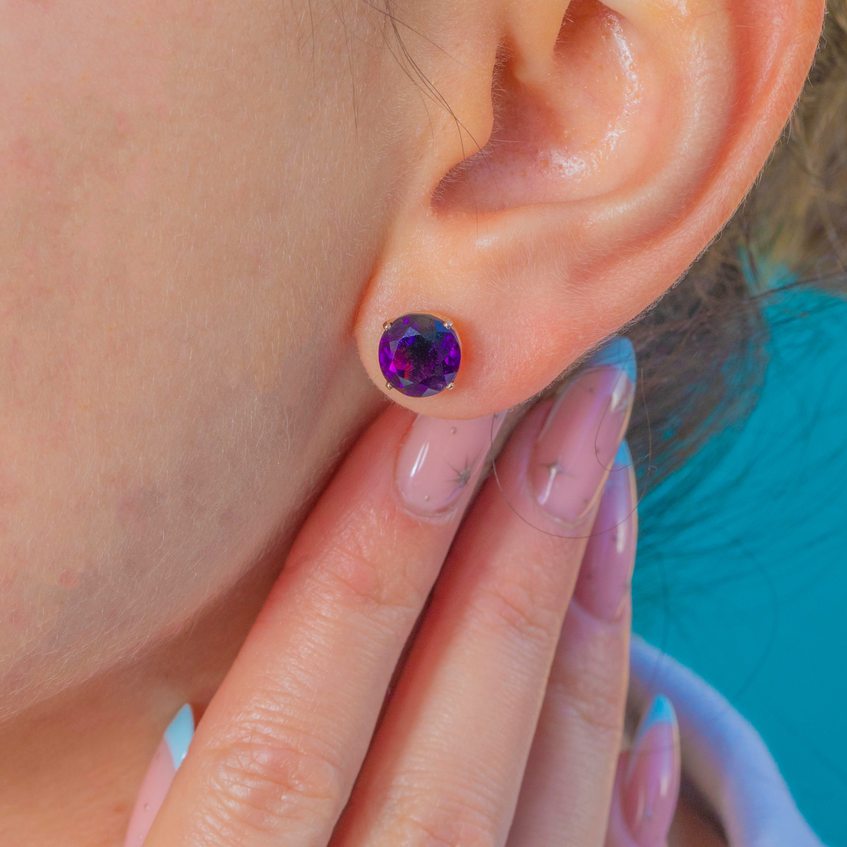 Classic and compelling, these Vintage stud earrings showcase two rich, deep plum Amethysts in timeless four-claw open basket mounts of 9ct Gold. The round brilliant cuts flash with vivid violet and magenta tones, offering luminous colour and elegant sparkle from every angle.