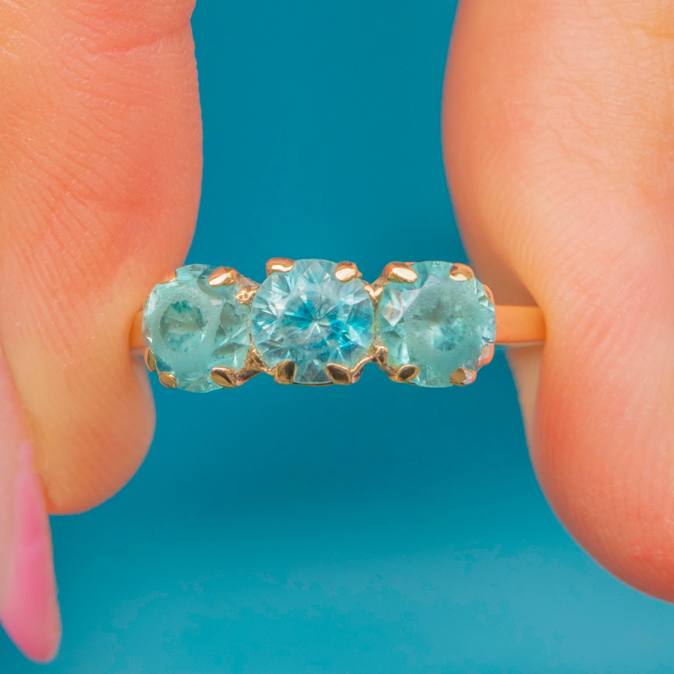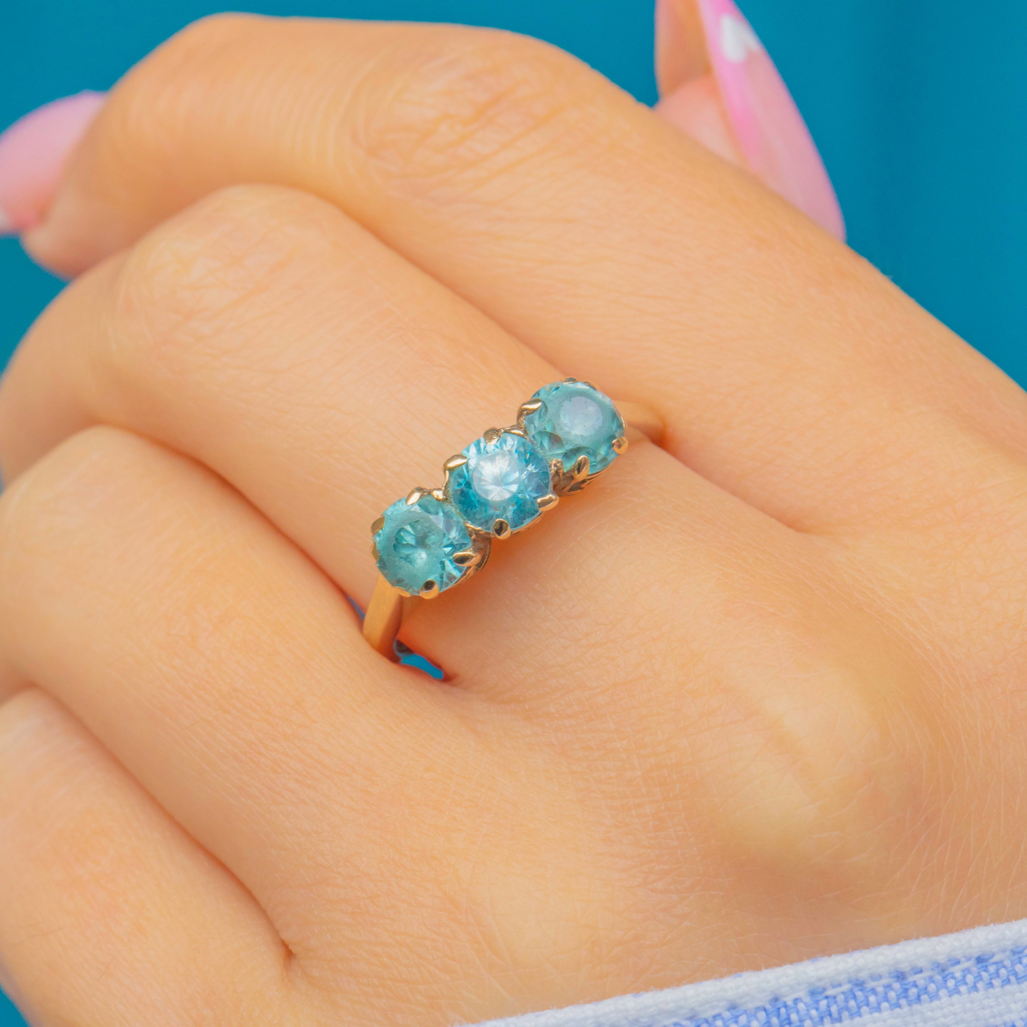 This charming Vintage trilogy ring showcases three vivid Blue Zircons, their bright turquoise hue sparkling beautifully in the light. Crafted in 9ct Yellow Gold, the stones are held in elegant claw settings with a pretty swirled open gallery beneath, a classic mid-century design still popular in the early 1970s.