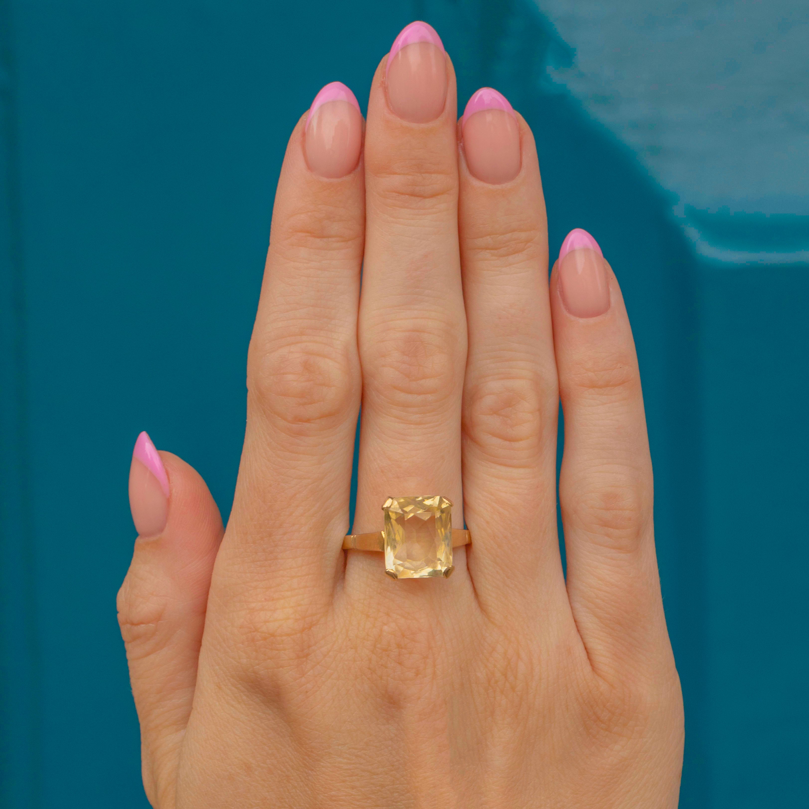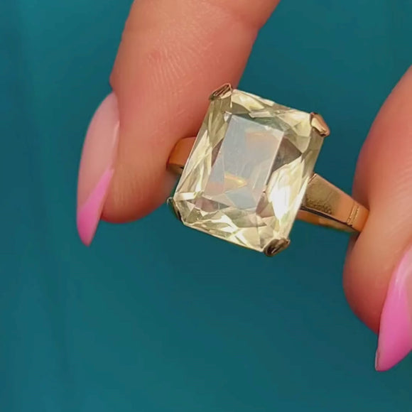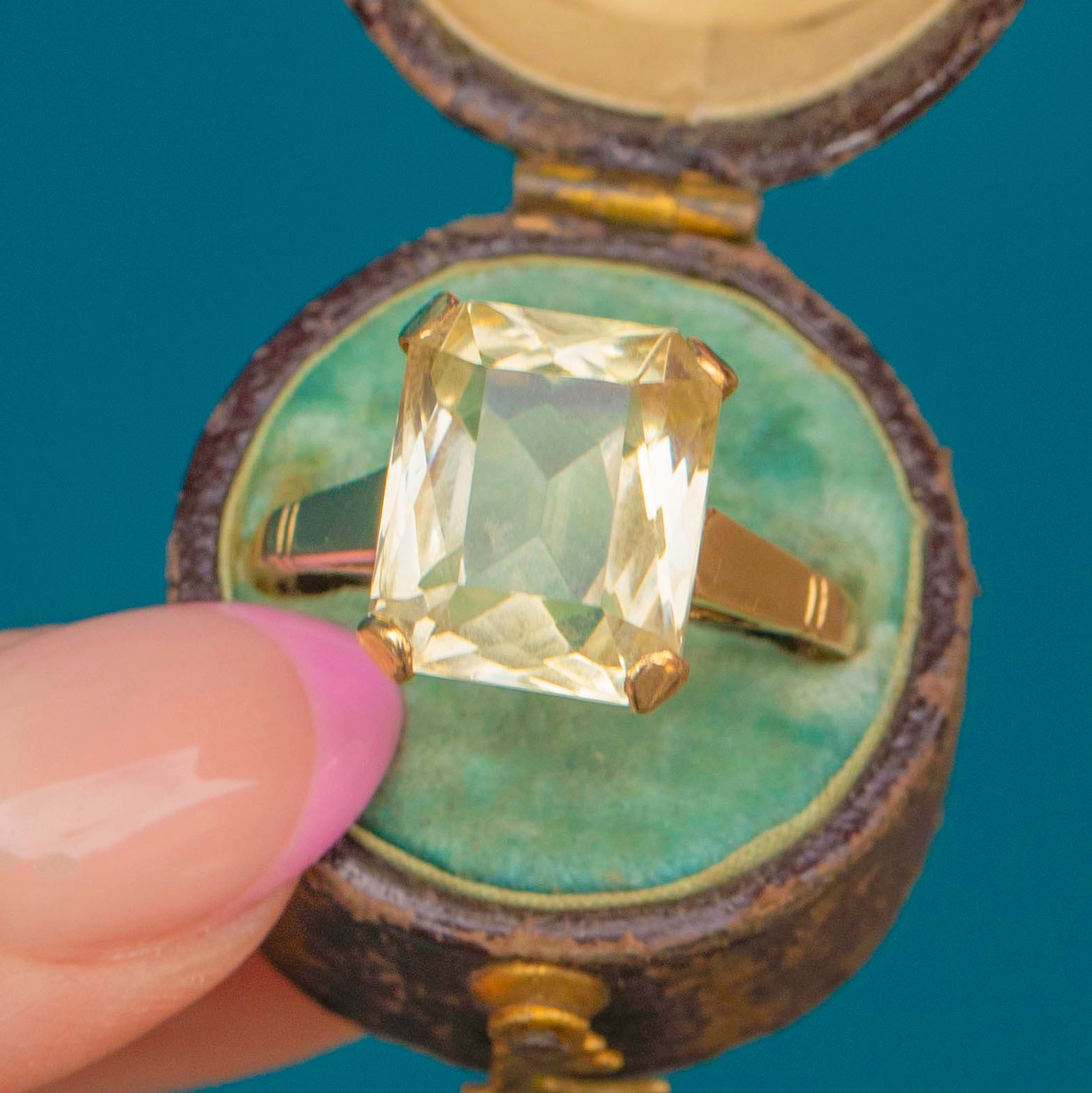 This Vintage 9ct Gold Citrine cocktail ring looks good enough to eat! Swoon over the soft, lemony hues that glisten across the fabulously faceted form of her 4.55ct, taking you back to fond memories of eating lemon sherbets.