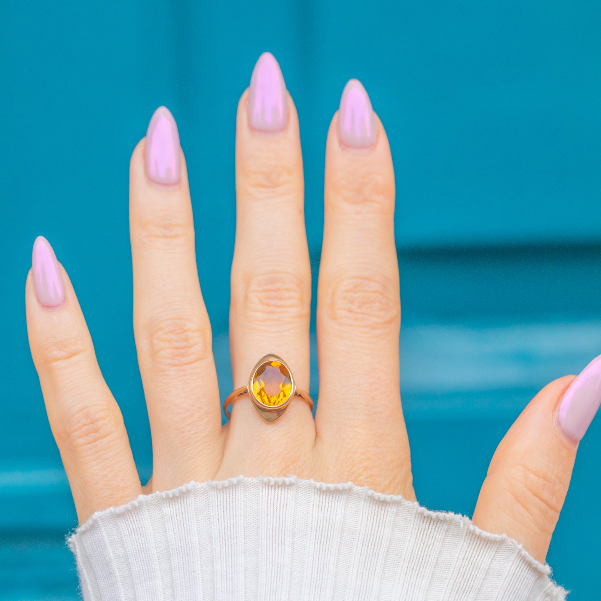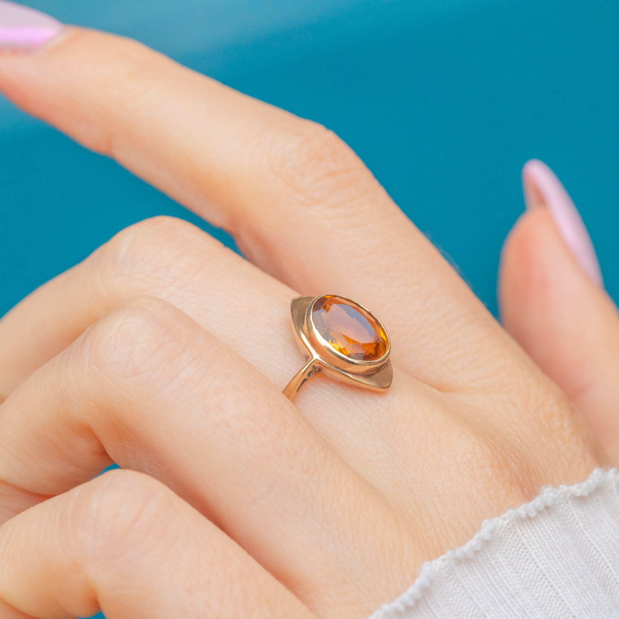 EXCELLENT: The Citrine is bright and eye-clean with no chips or abrasions. The Gold band is smooth and well-shaped with minimal wear, retaining a lovely vintage polish.