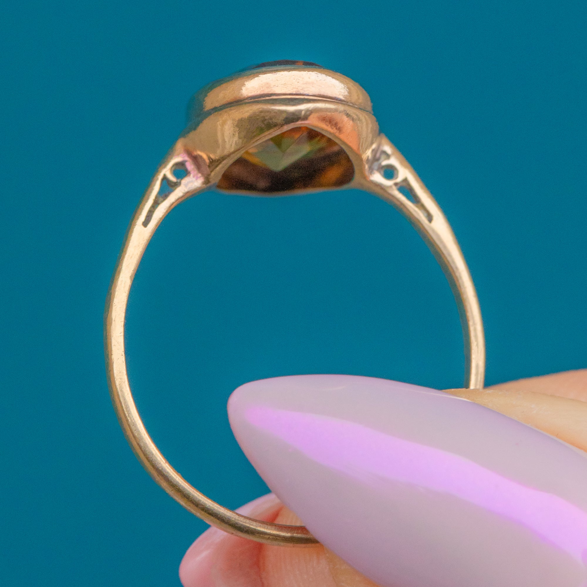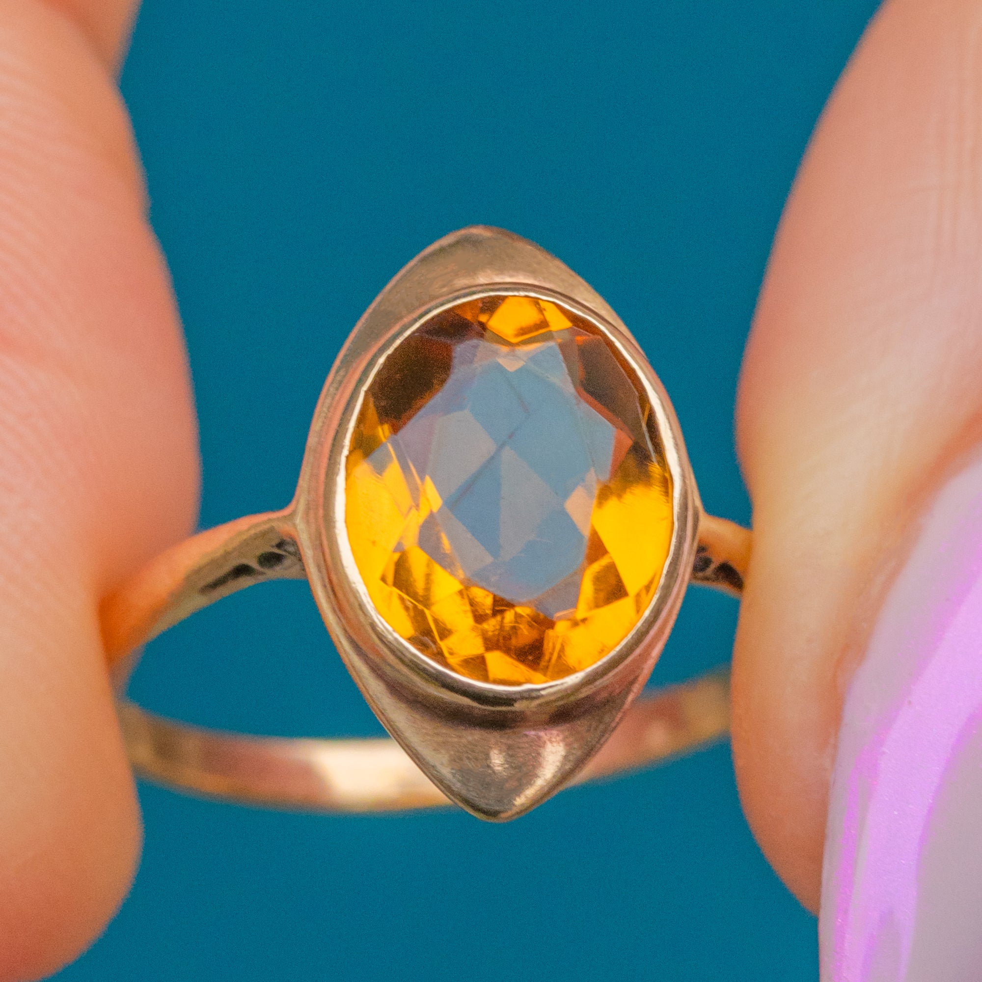This bold Mid-Century ring centres on a radiant golden Citrine of approximately 8.8 carats, its sunny glow and impressive size exuding vintage glamour. The beautifully faceted stone is claw-set in warm 9ct Gold, allowing light to flood through and enhance its natural brilliance.