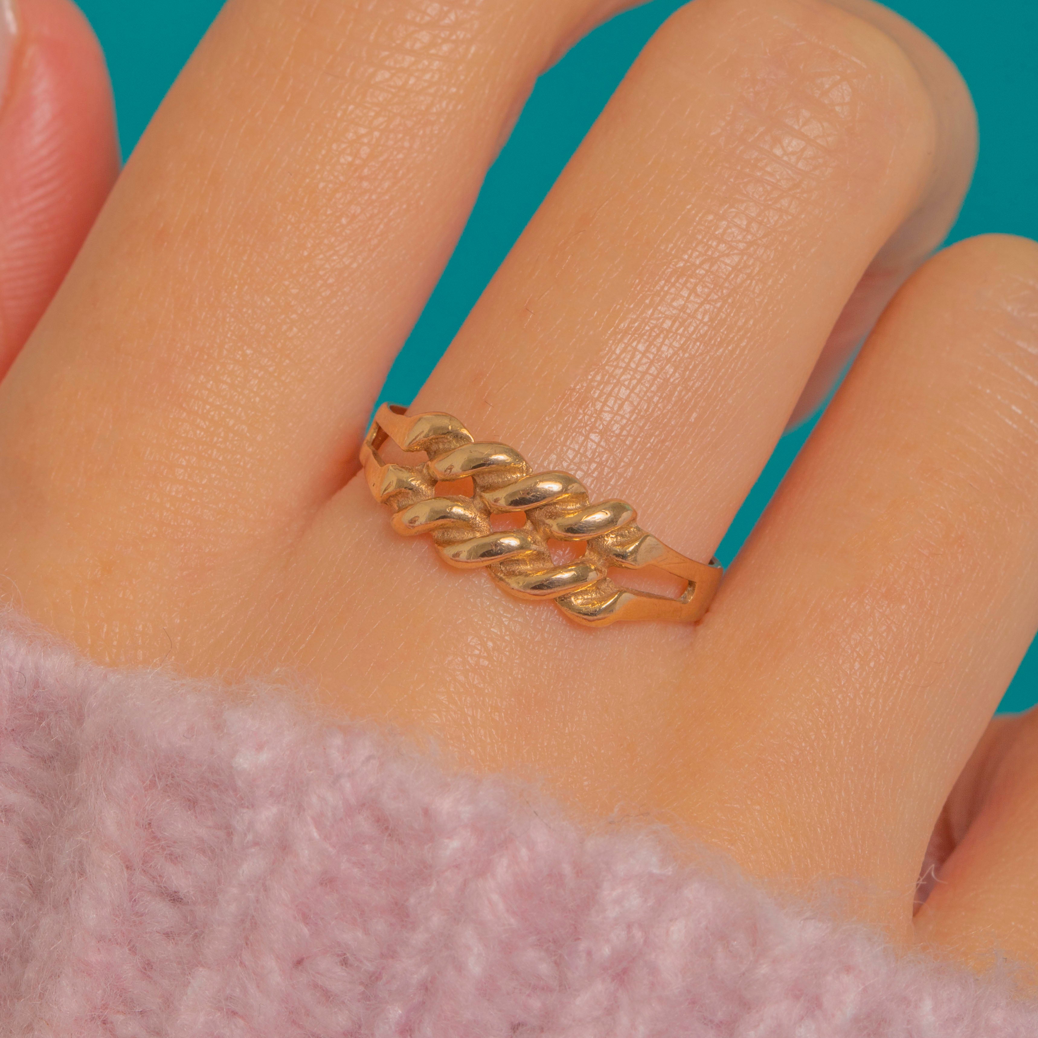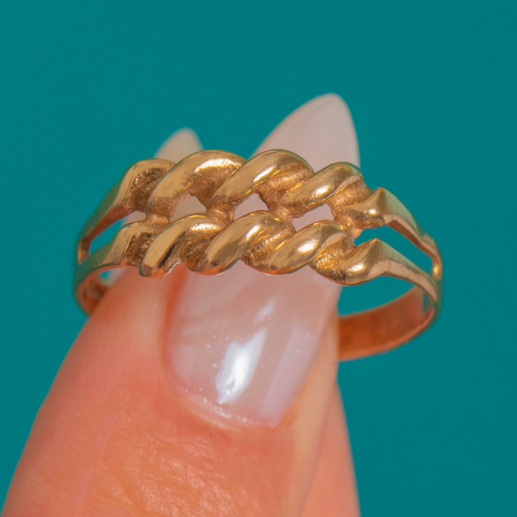 This Vintage 9ct Gold double row Keeper ring is all clean lines and tactile texture. The head is formed by two interlacing rows of domed curb links with elegant split shoulders tapering to a polished shank, creating a sleek, low-profile silhouette that stacks beautifully and wears effortlessly every day.