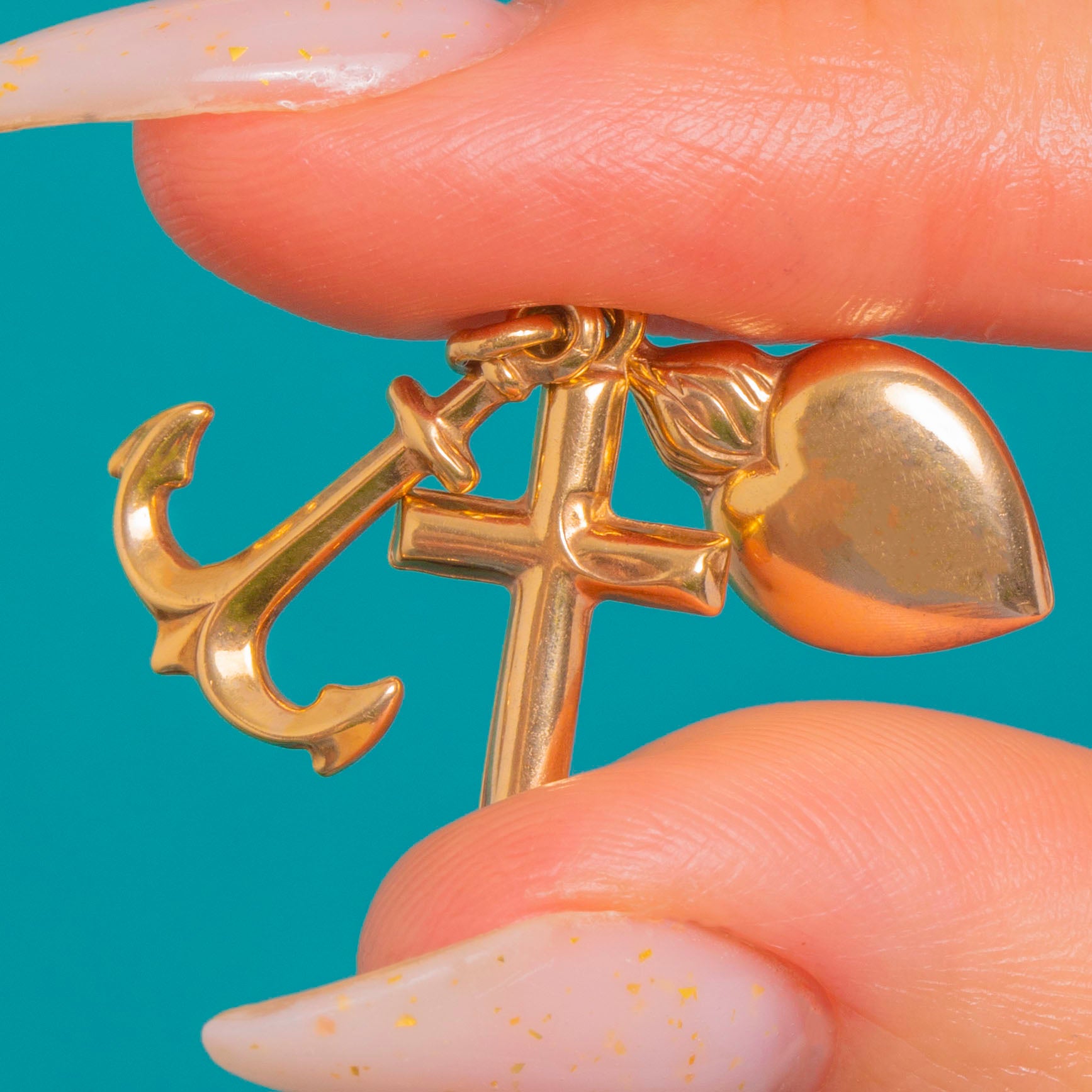 A sweet Faith, Hope & Charity charm pendant in 9ct Gold, this petite cluster brings together an anchor, a rounded Latin cross and a puffed heart for timeless sentiment in a sleek, minimalist form. Each charm gleams with a high polish, gathered on a shared jump ring for effortless movement and shine.