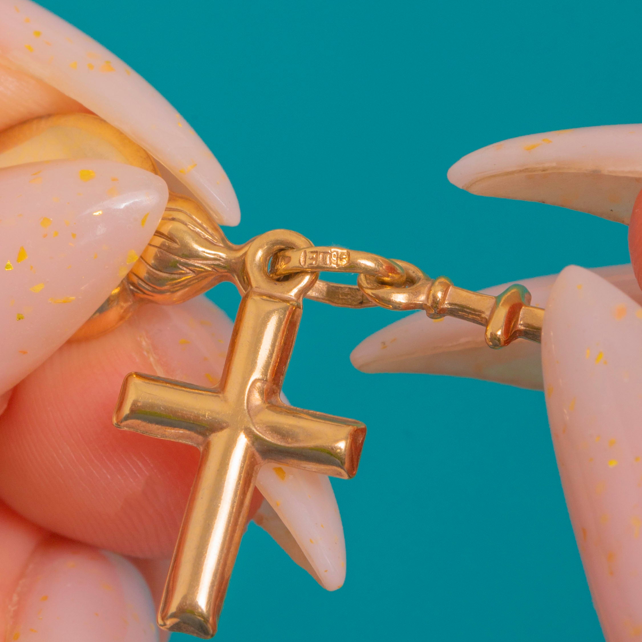 VERY GOOD: Bright, glossy surfaces with only light hairline scratches and a few tiny, shallow pressure marks to the heart and cross. Charms and jump ring are secure with no repairs observed. Well cared for and ready to wear.