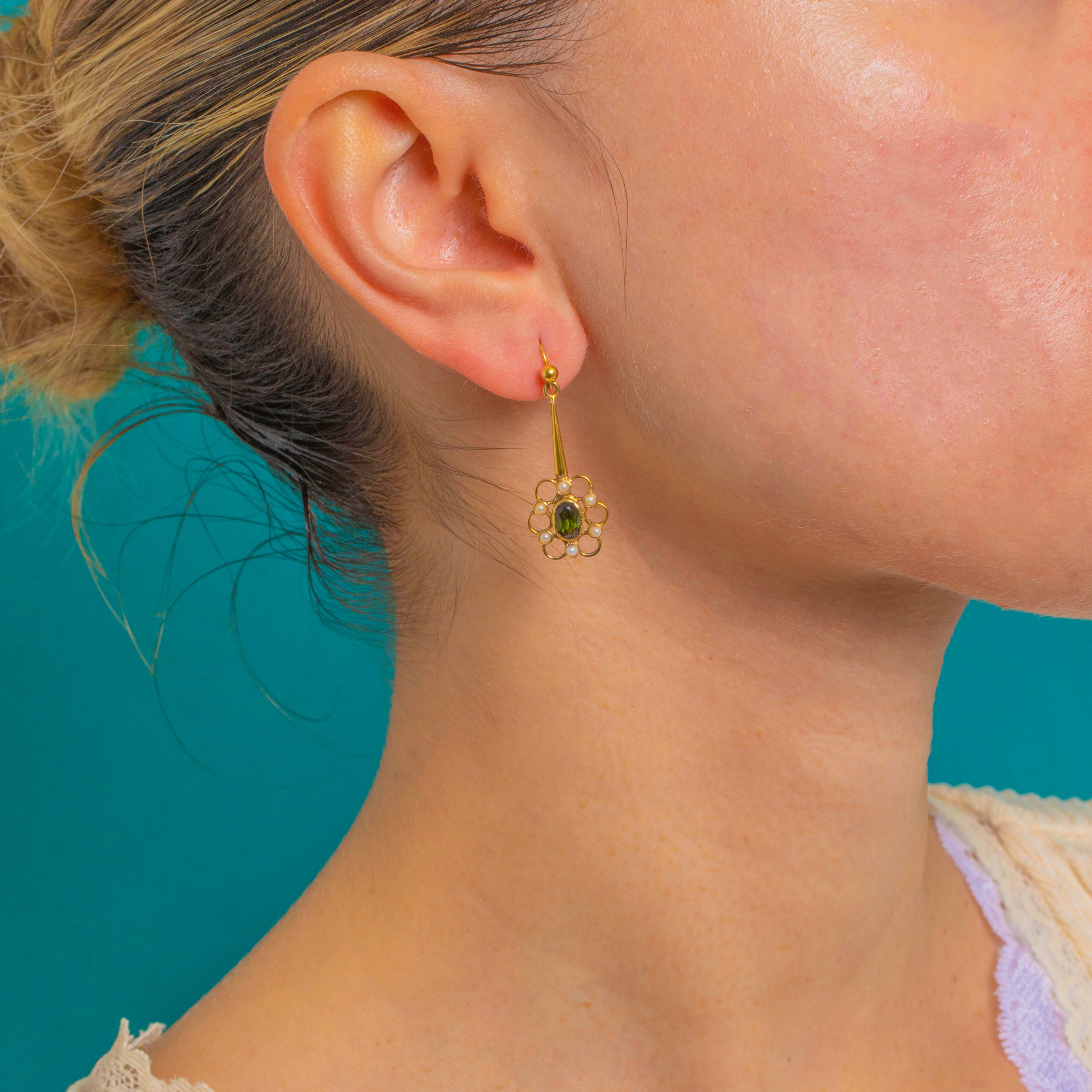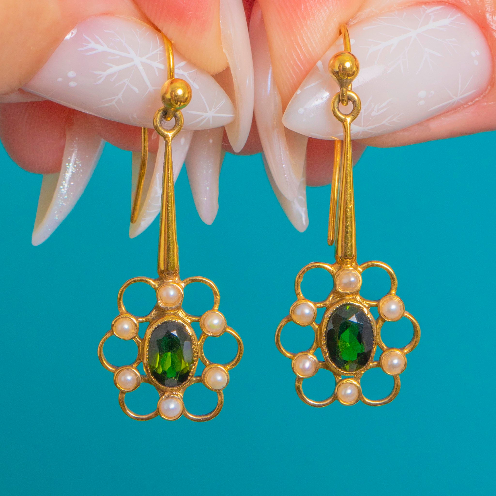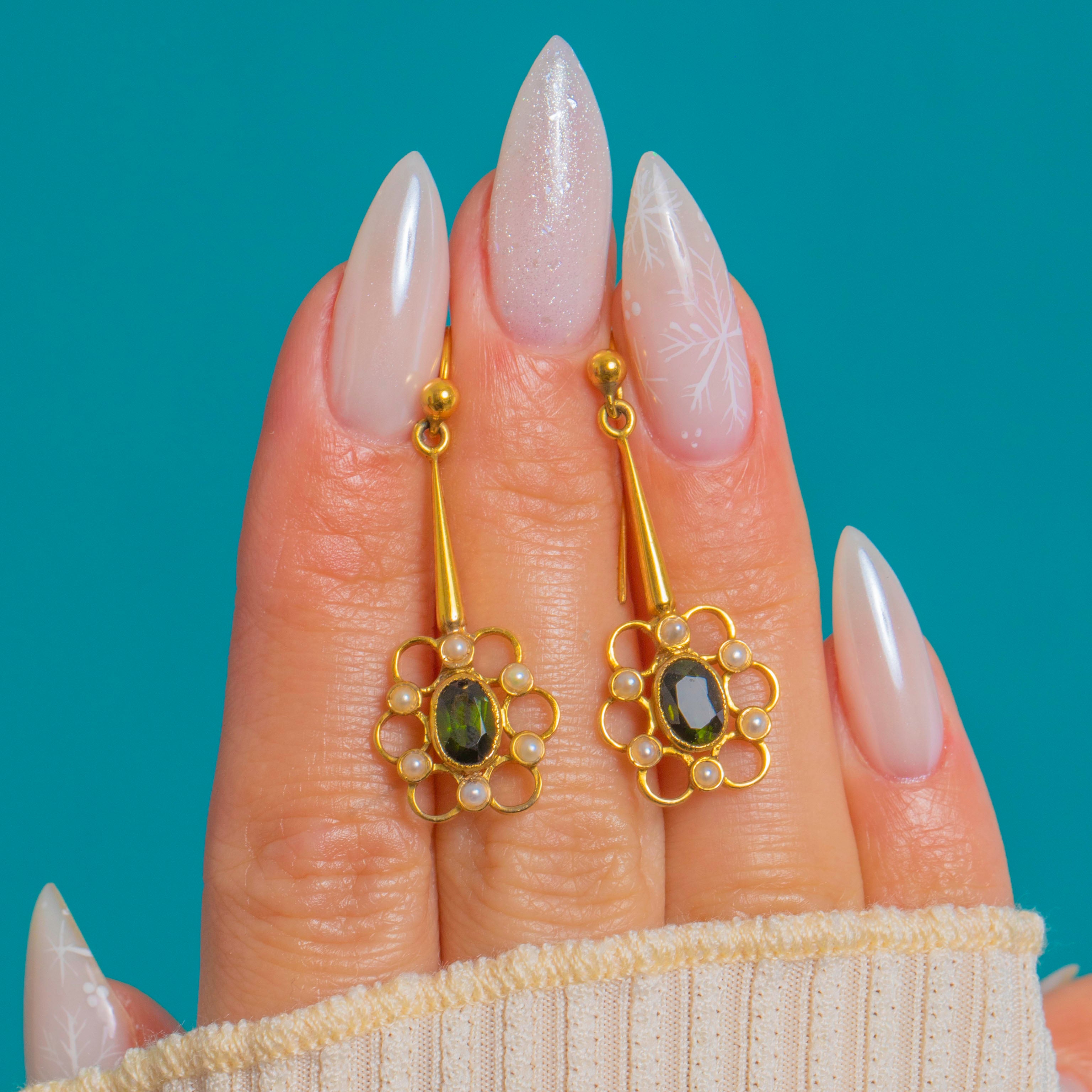 Elegantly articulated and beautifully balanced, these Vintage 9ct Gold drop earrings marry verdant Green Tourmaline ovals with a luminous halo of Pearls. Each earring suspends a delicate tapered bar to an openwork rosette, giving the design a refined, floral silhouette with graceful movement.
