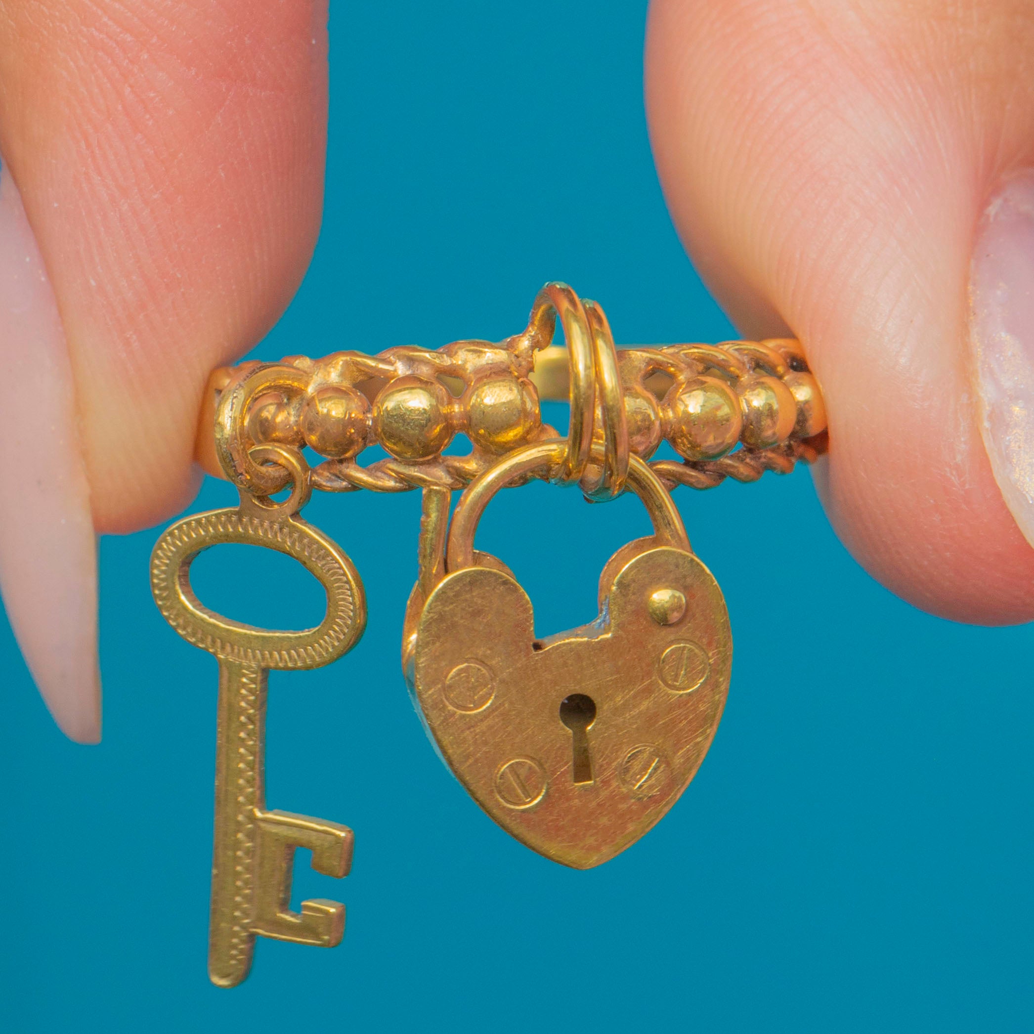 A charming Vintage 9ct Gold Heart Padlock & Key ring, c.1975, featuring a fully functioning heart padlock and a dangling key charm. The ring combines playful sentiment with elegant detailing, including rope and bead textures that catch the eye.