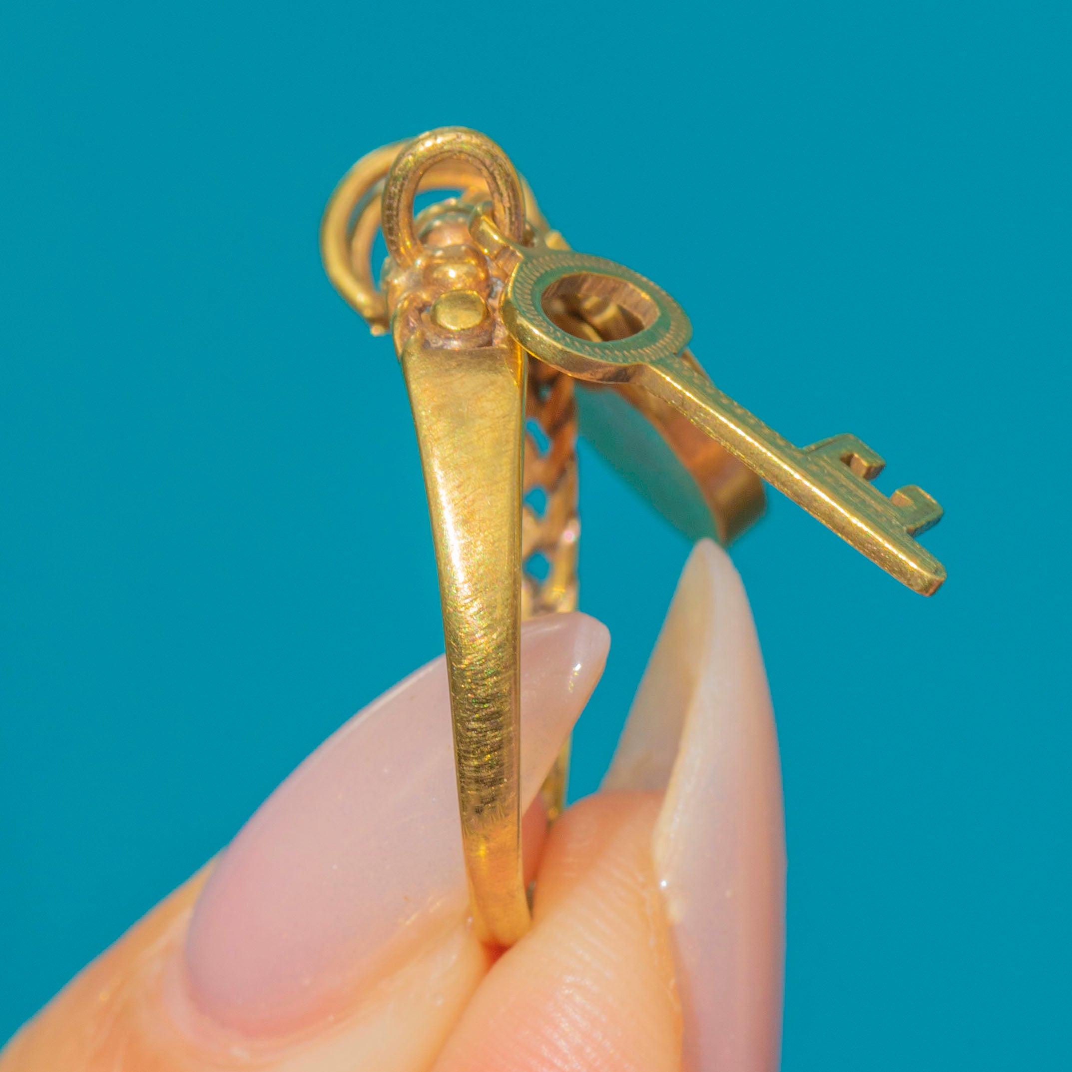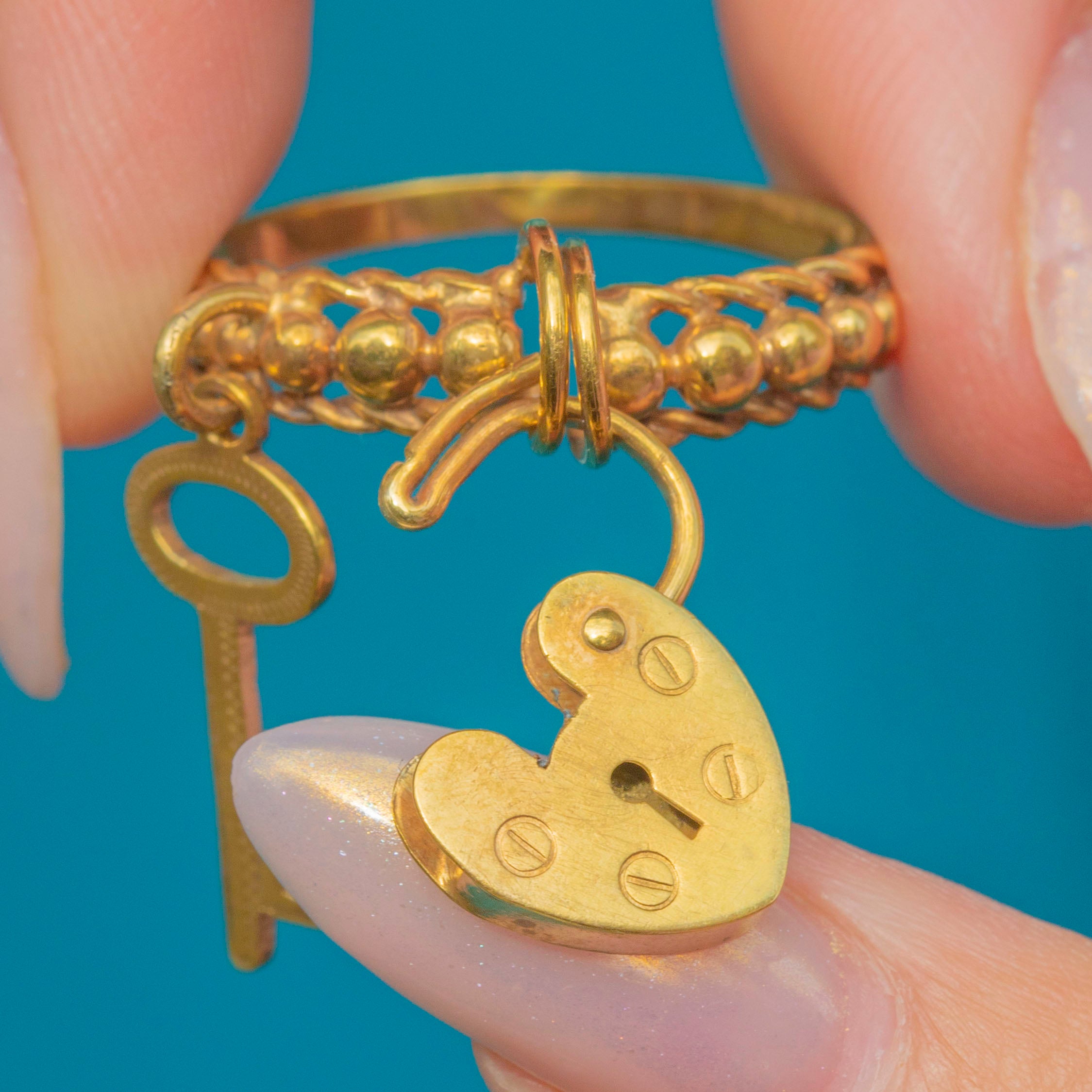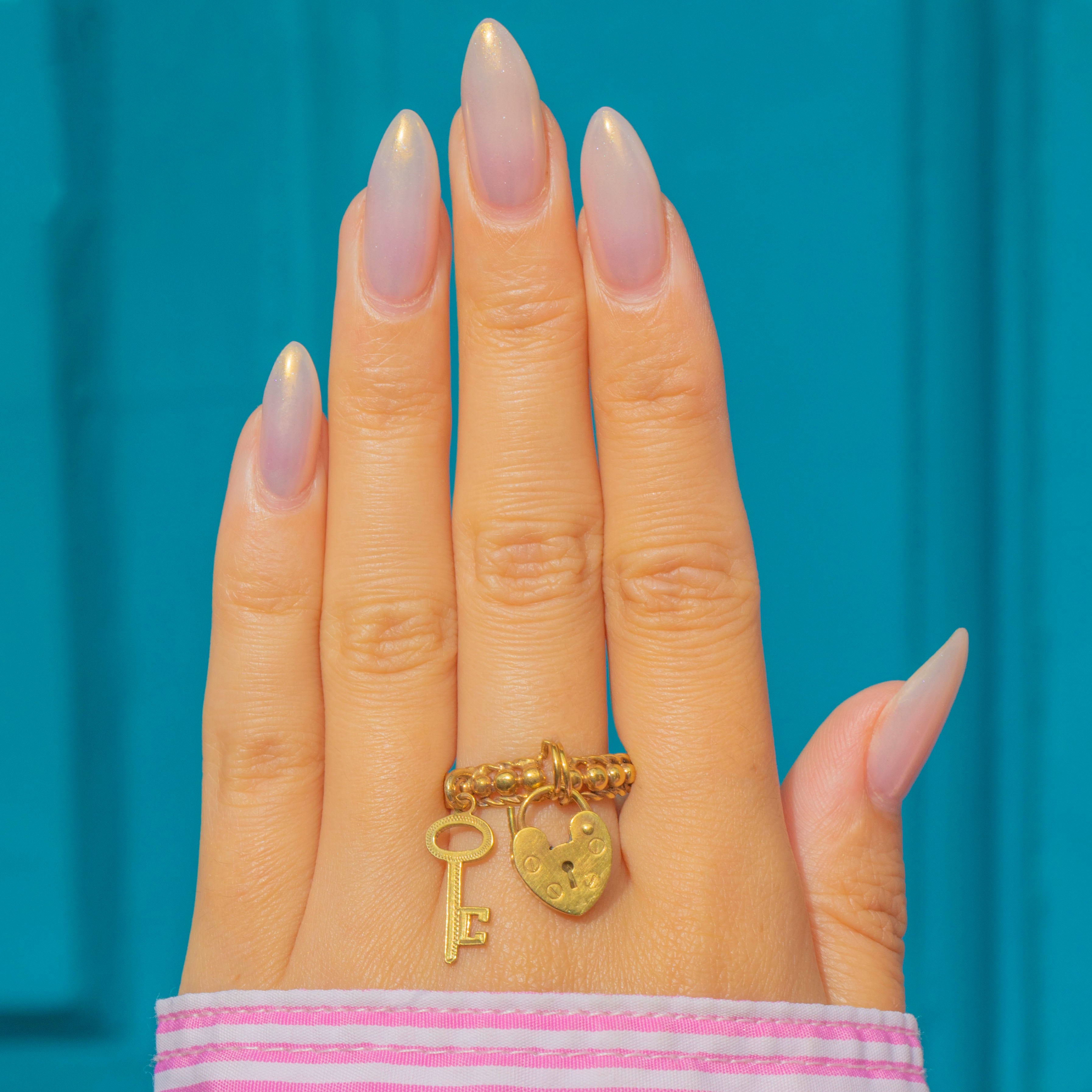 The padlock can be removed and worn on other items such as charm bracelets or as a pendant, making this a versatile and collectible piece. Crafted in 9ct Gold, this ring exemplifies vintage style and craftsmanship.