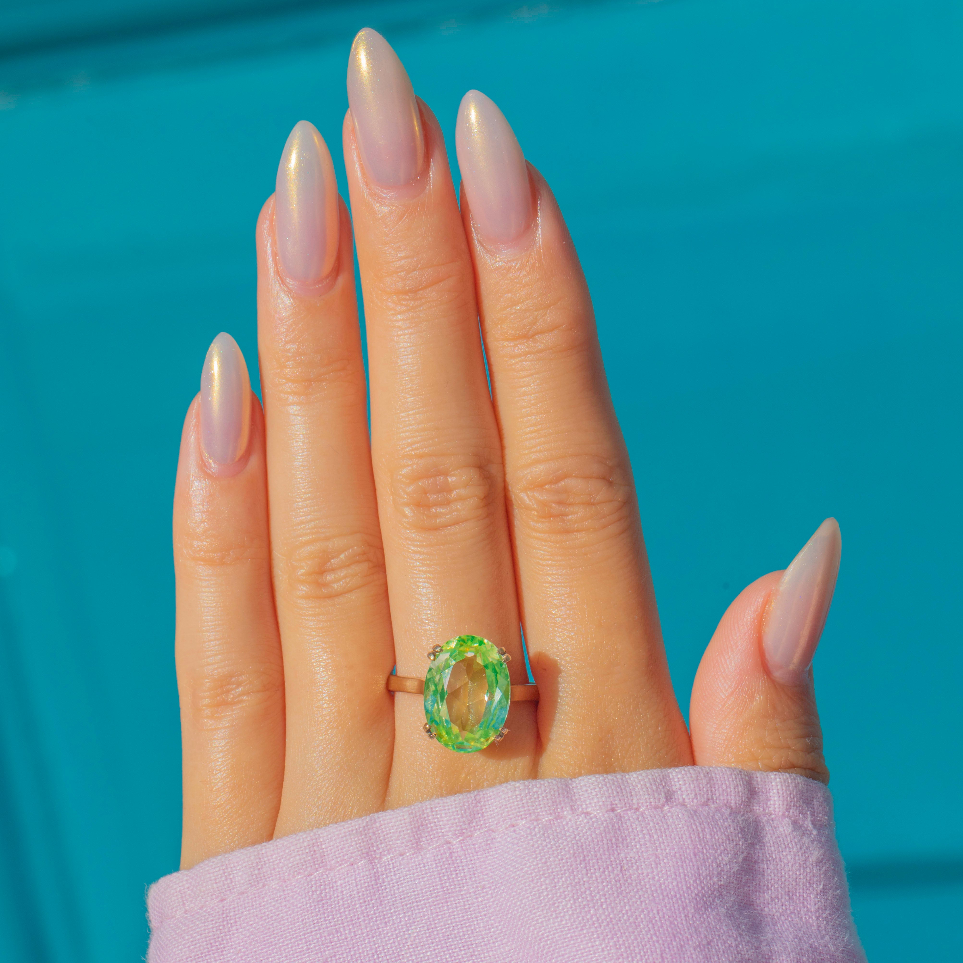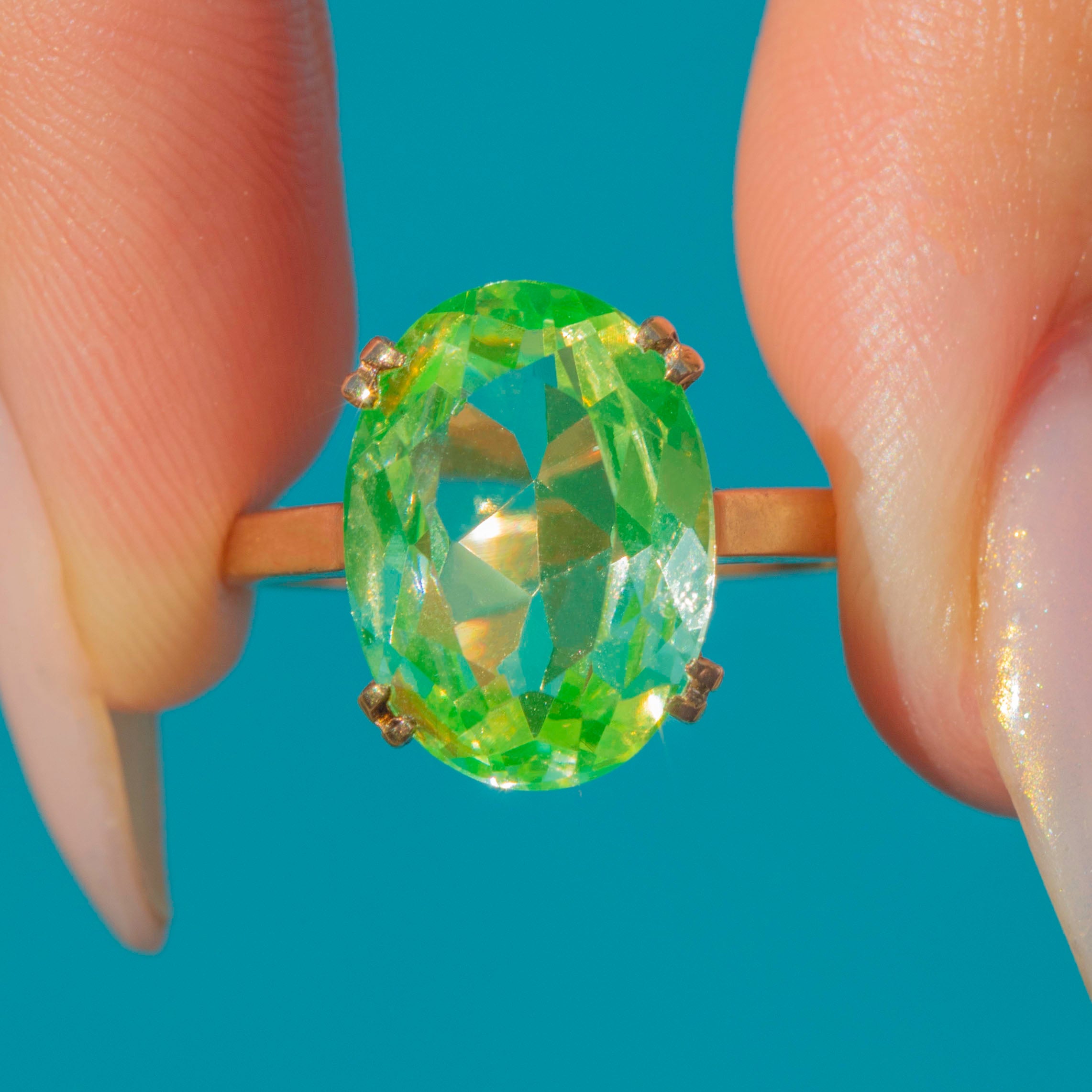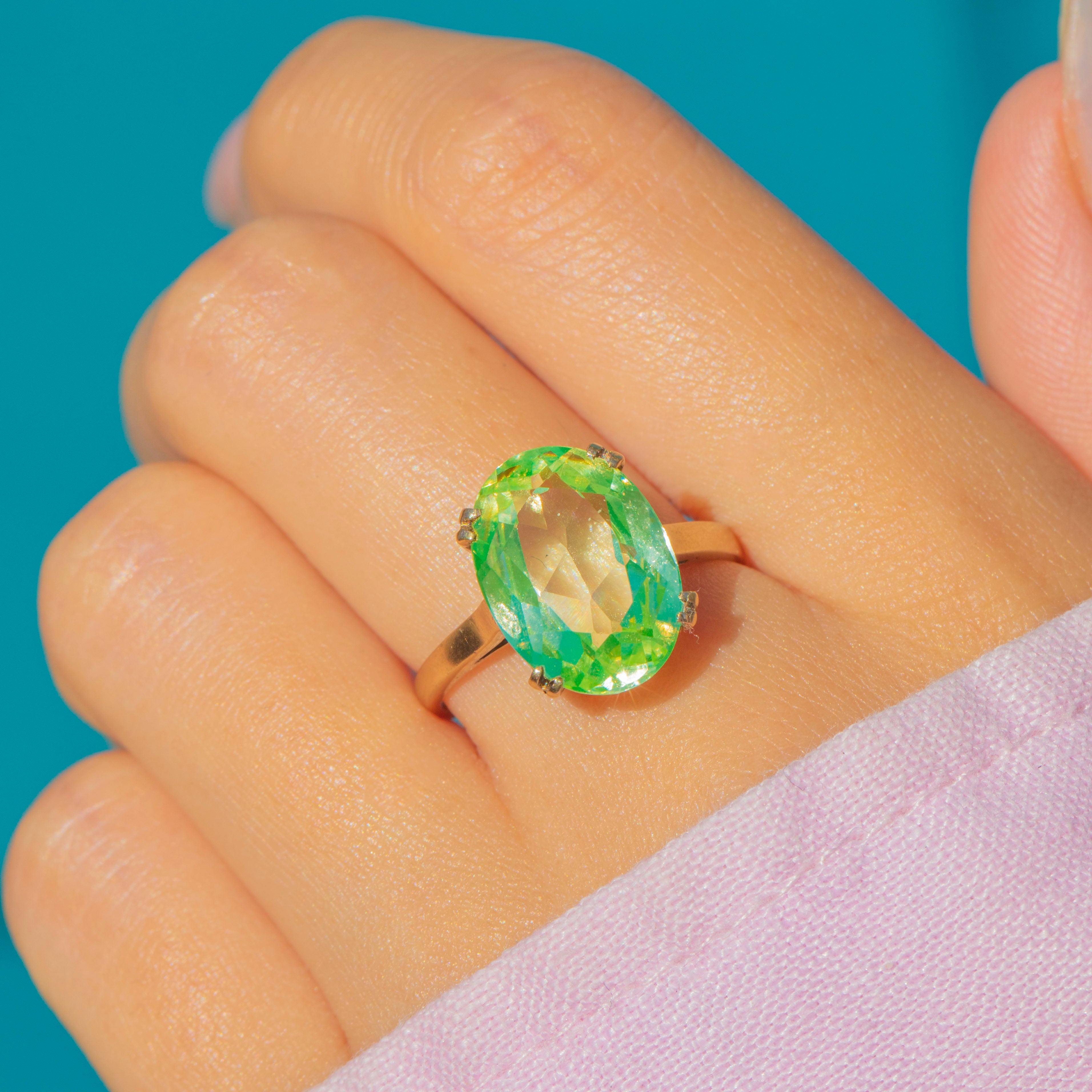 A bold and vibrant statement piece, this Vintage 9ct Gold ring features a dazzling neon green synthetic Spinel. The large oval-cut stone is lab-created, offering incredible clarity and vivid colour reminiscent of the bold 1990s aesthetic.