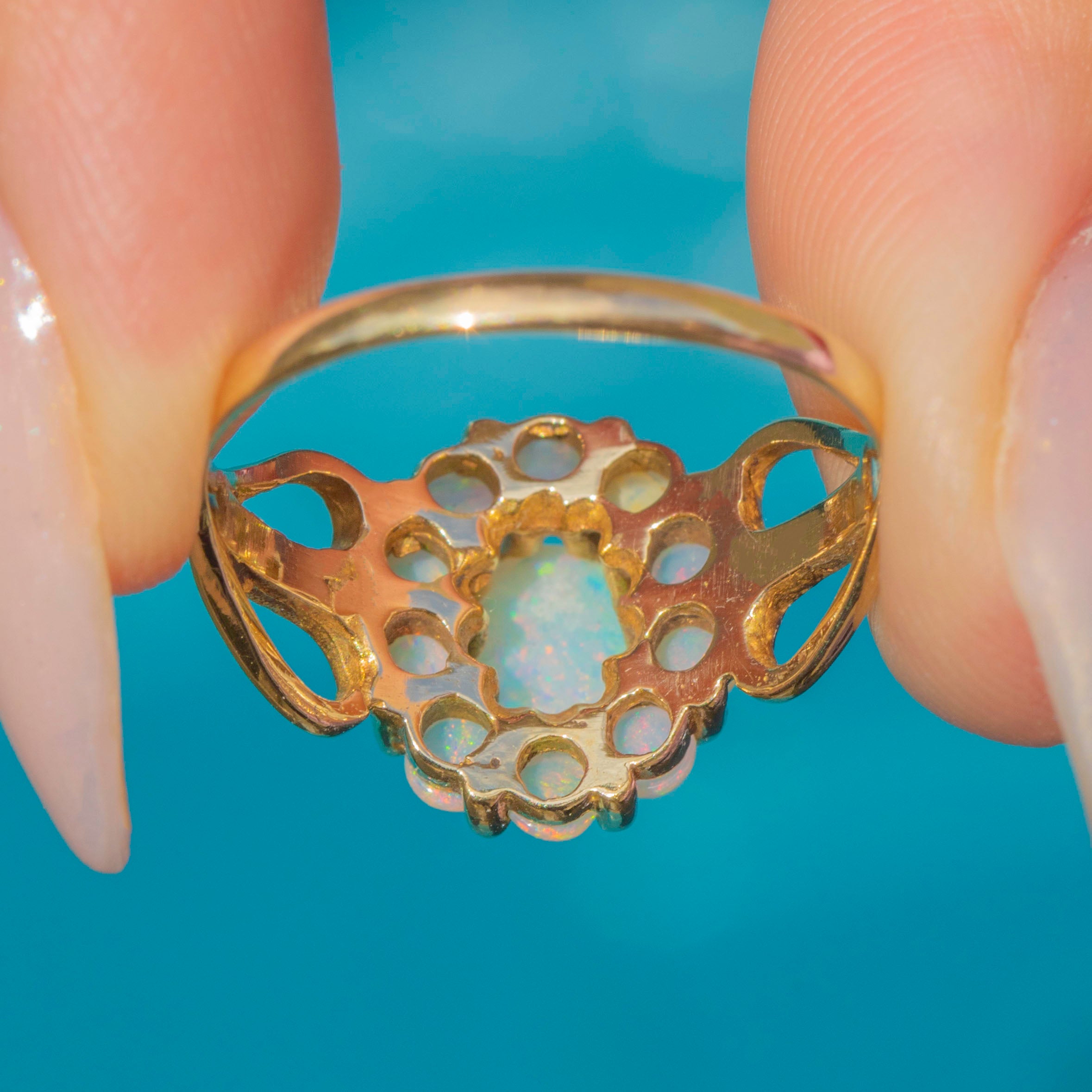 This Vintage 1990s cluster ring is set with a glowing array of natural Opals, shimmering with pastel pinks, blues, indigos and lively flashes of bright green. The oval centre stone is framed by a neat halo of ten smaller Opals, creating a colourful floral effect that’s both playful and elegant. The petal-shaped shoulders add extra detail to the design, while the warm 9ct Gold setting enhances the Opals’ rainbow play of colour.