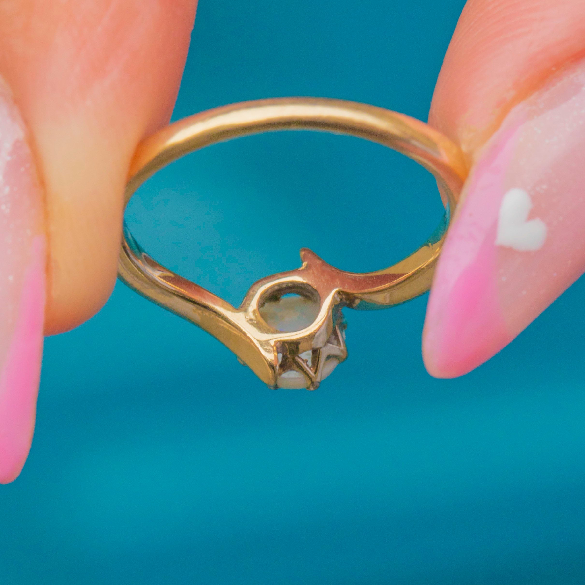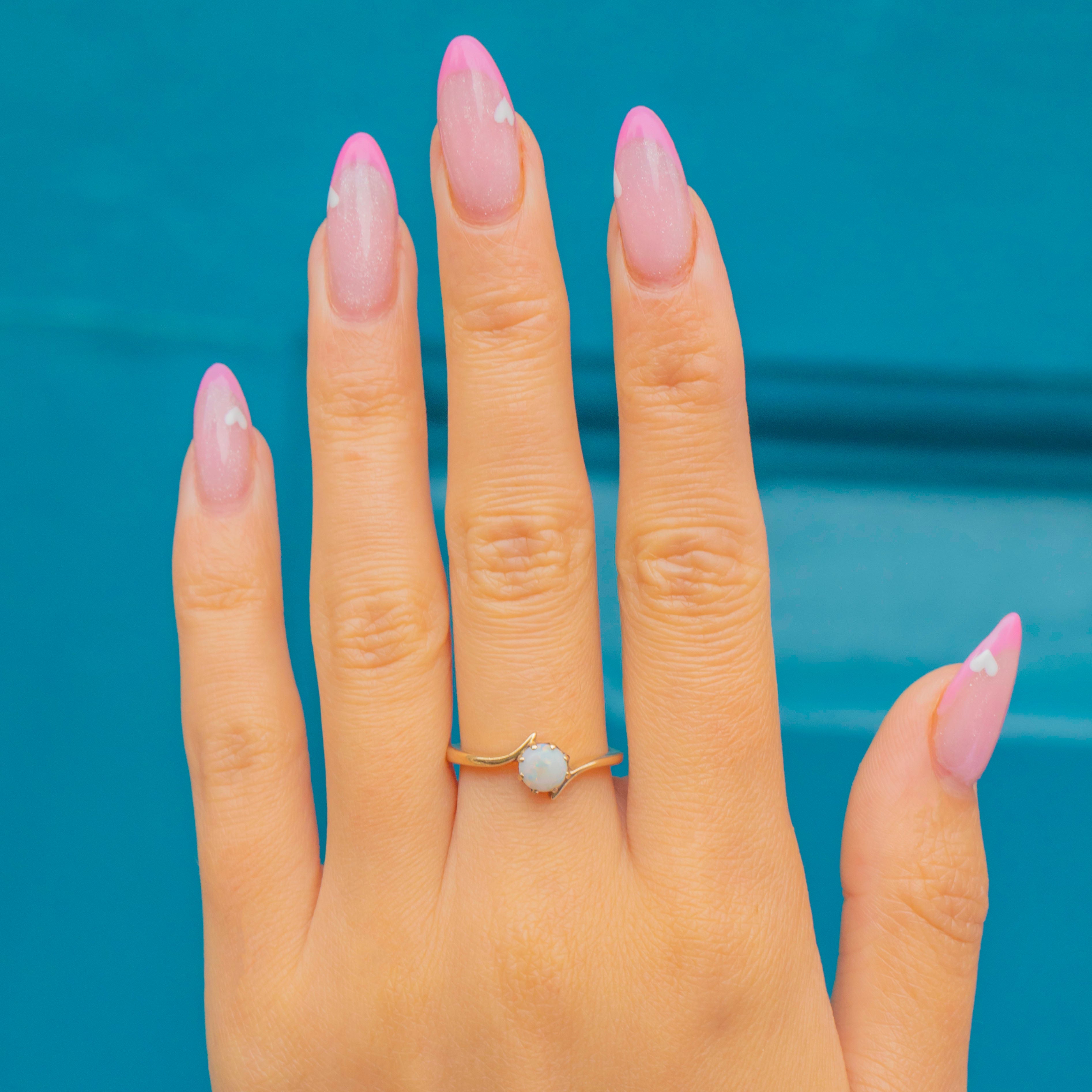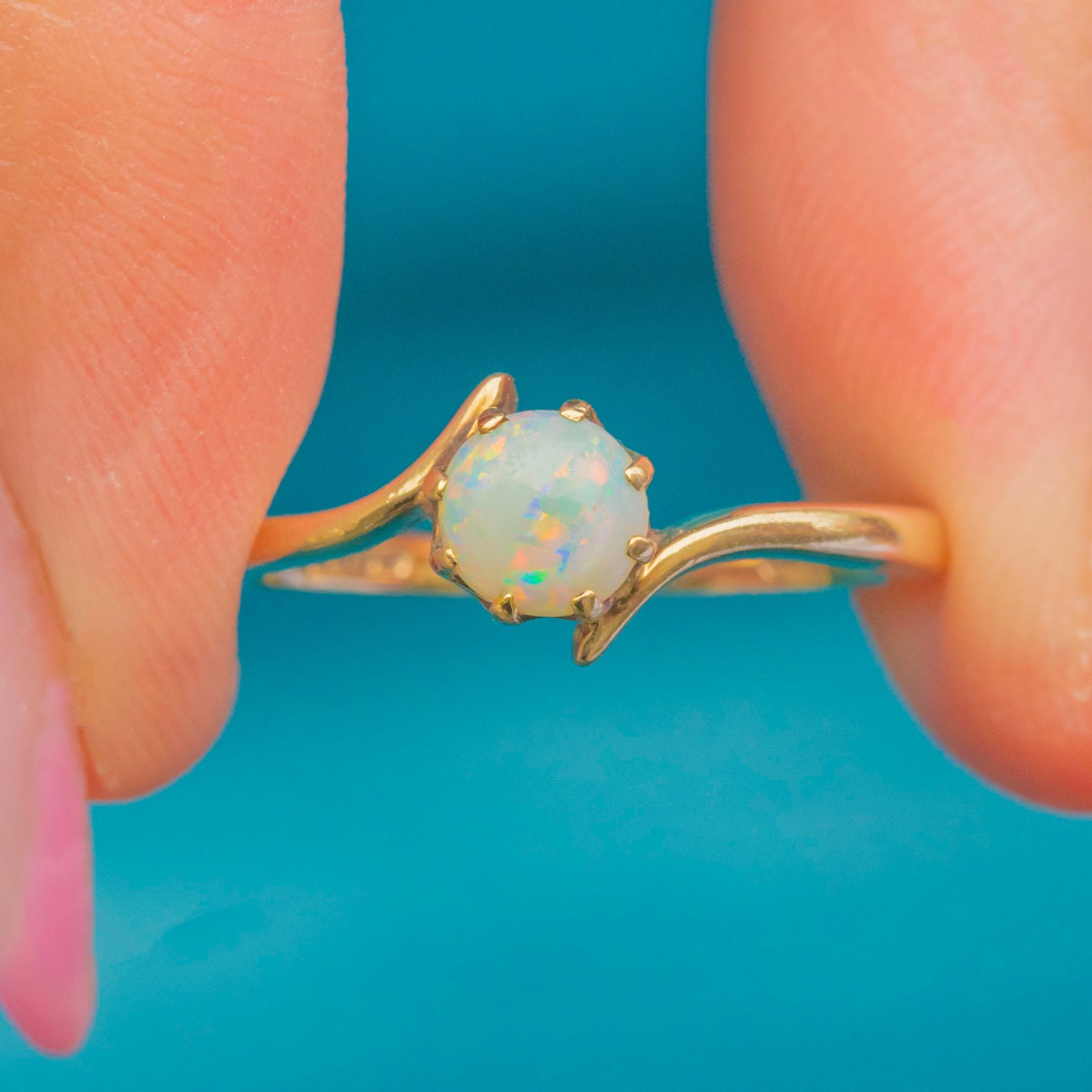 This charming Vintage Opal ring features a graceful crossover design, beautifully crafted in warm 9ct Gold. The natural solid Opal sits proudly at the centre, its milky body showing flashes of pink, green and blue as it catches the light.