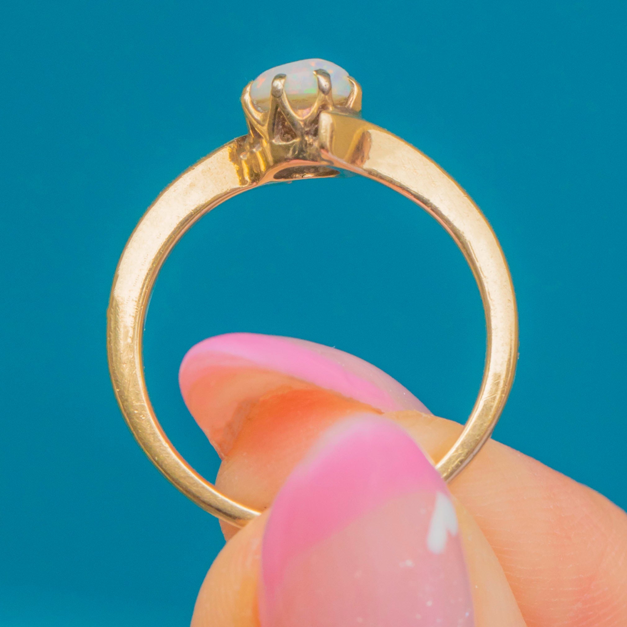 VERY GOOD: The Opal is securely set with lovely rainbow play-of-colour. Crisp 1970s hallmarks remain clear. Light wear consistent with age but no damage — ready to wear and enjoy for years to come.