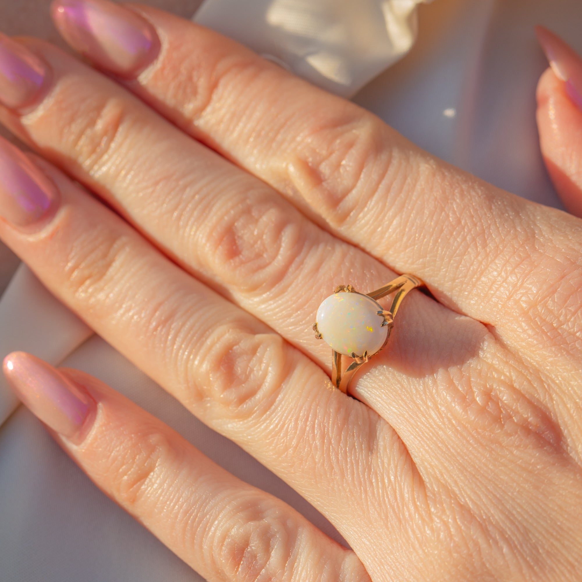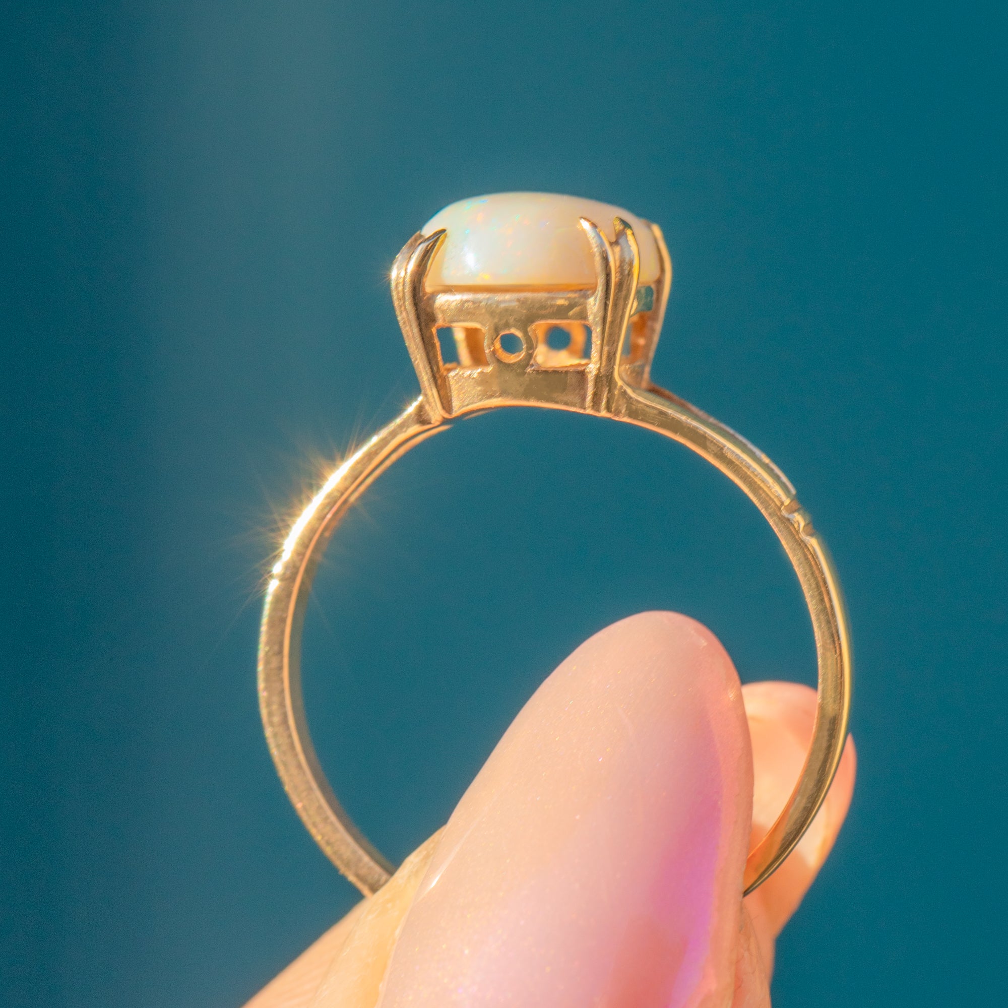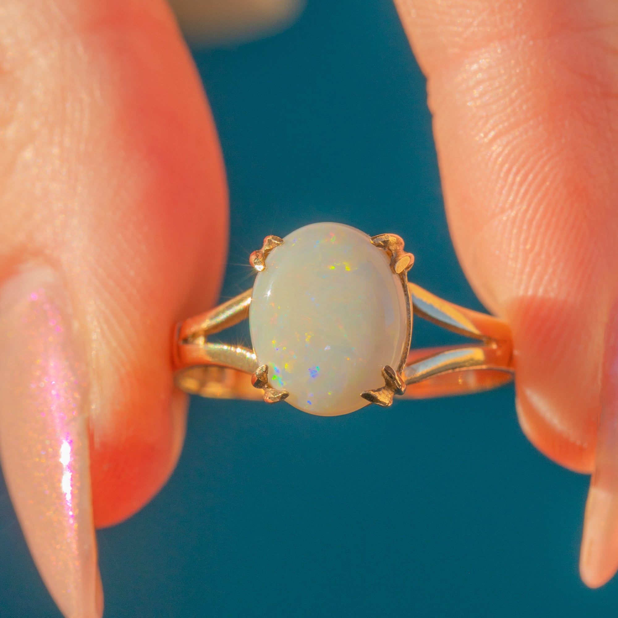 The Opal rests securely within her stylistic claw settings framed by spilt shoulders for an elegant finish. Wonderfully versatile, this solitaire ring is the perfect everyday ring to add to your collection.
