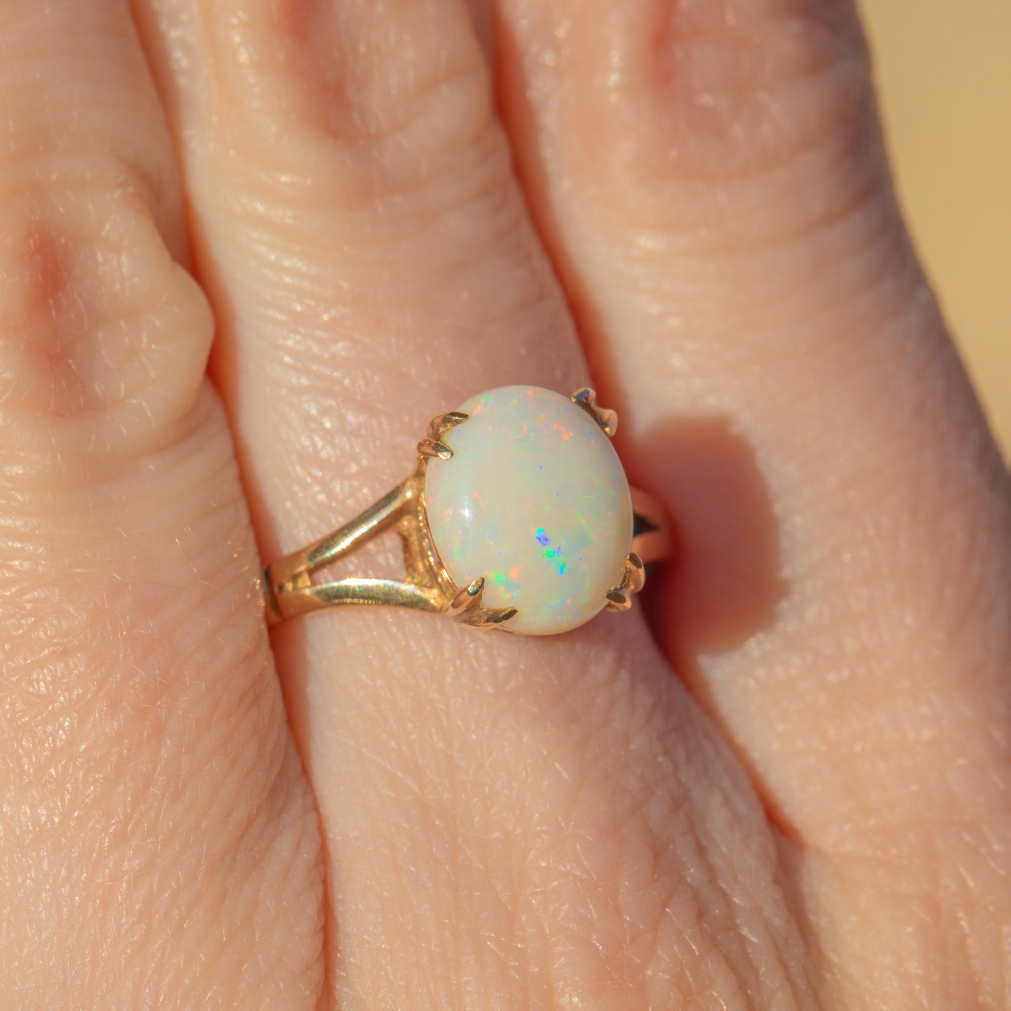 Crafted from buttery 9ct Gold, this vintage solitaire ring features a plump, creamy 4.55ct Opal at her centre, radiating vibrant flecks of yellows and oranges as it catches the light.