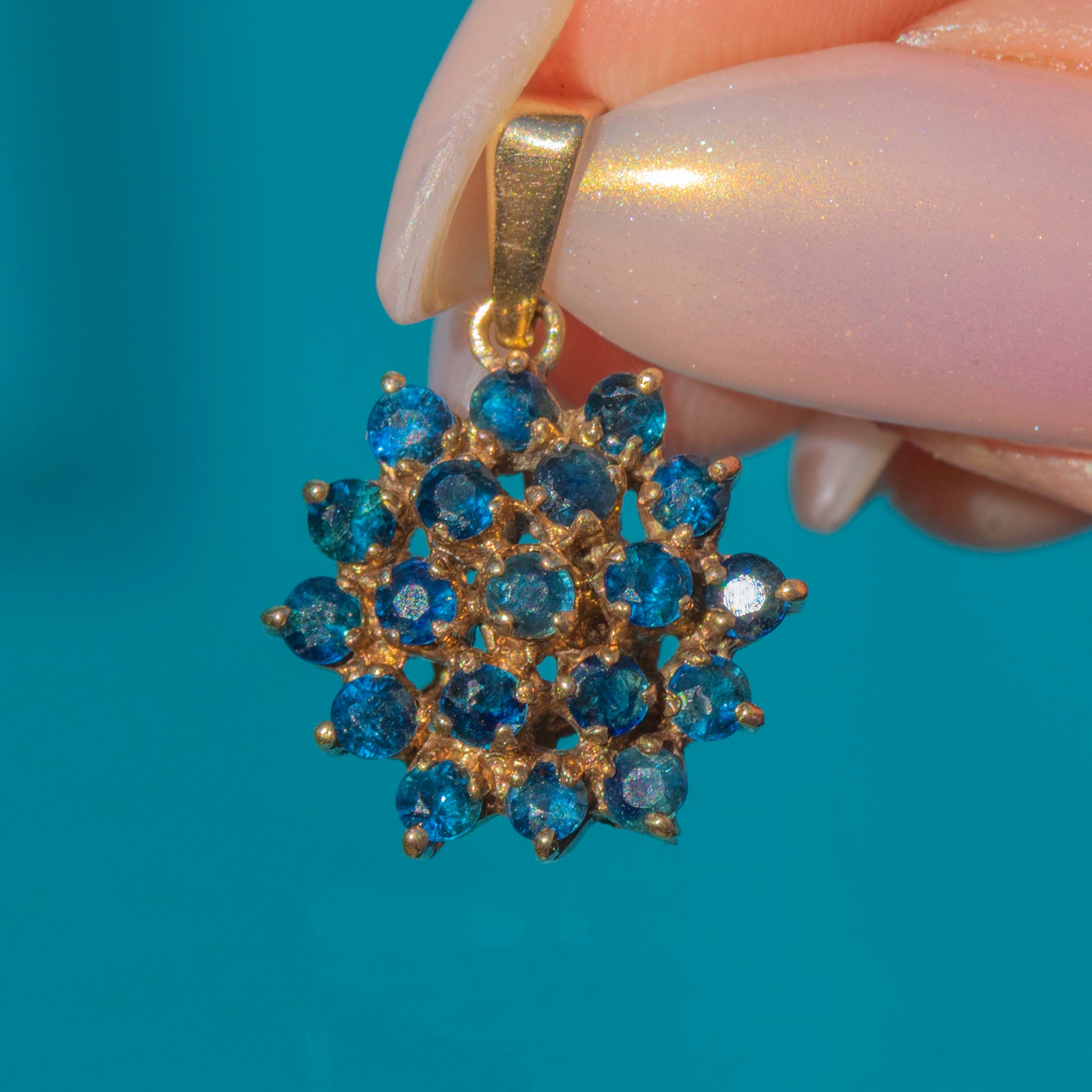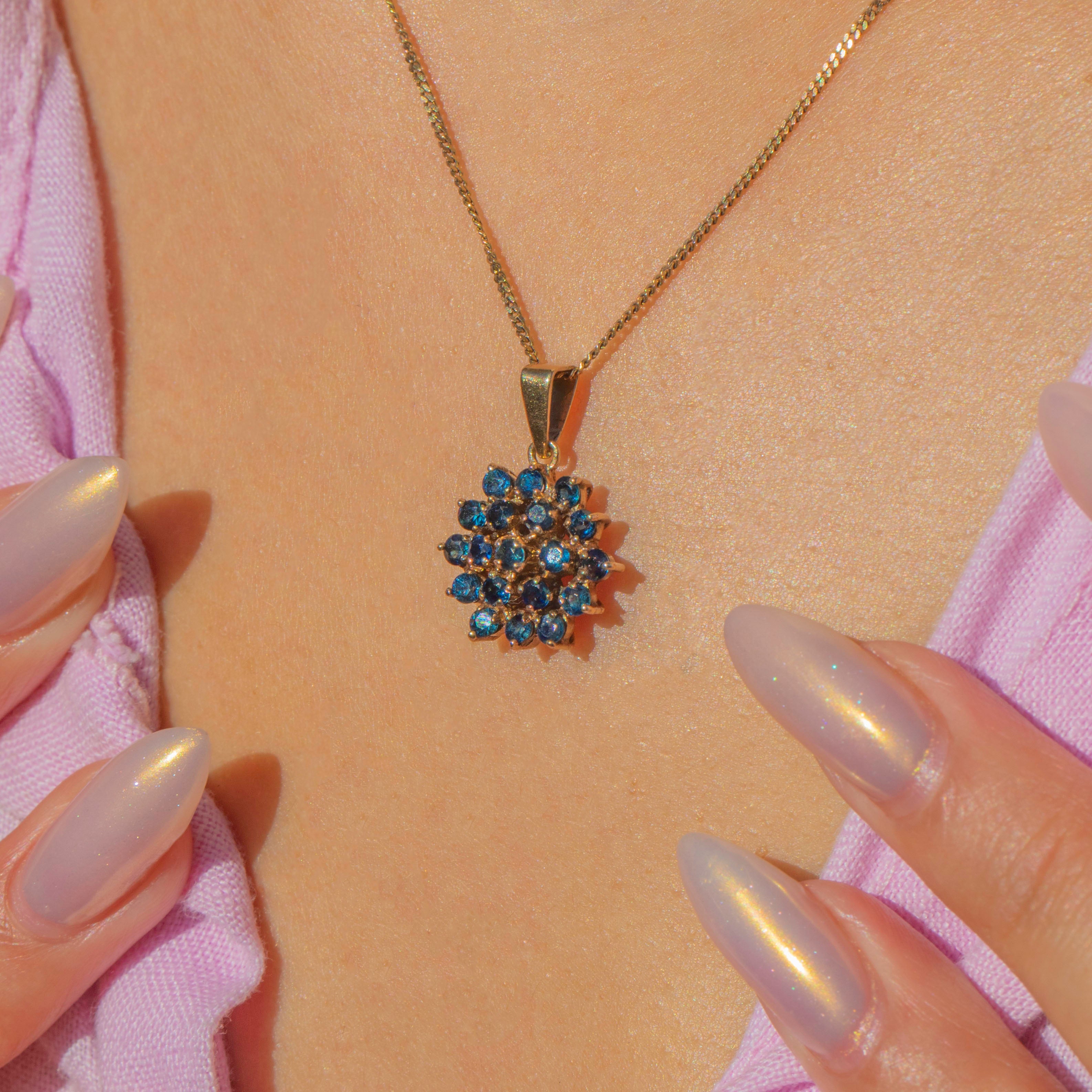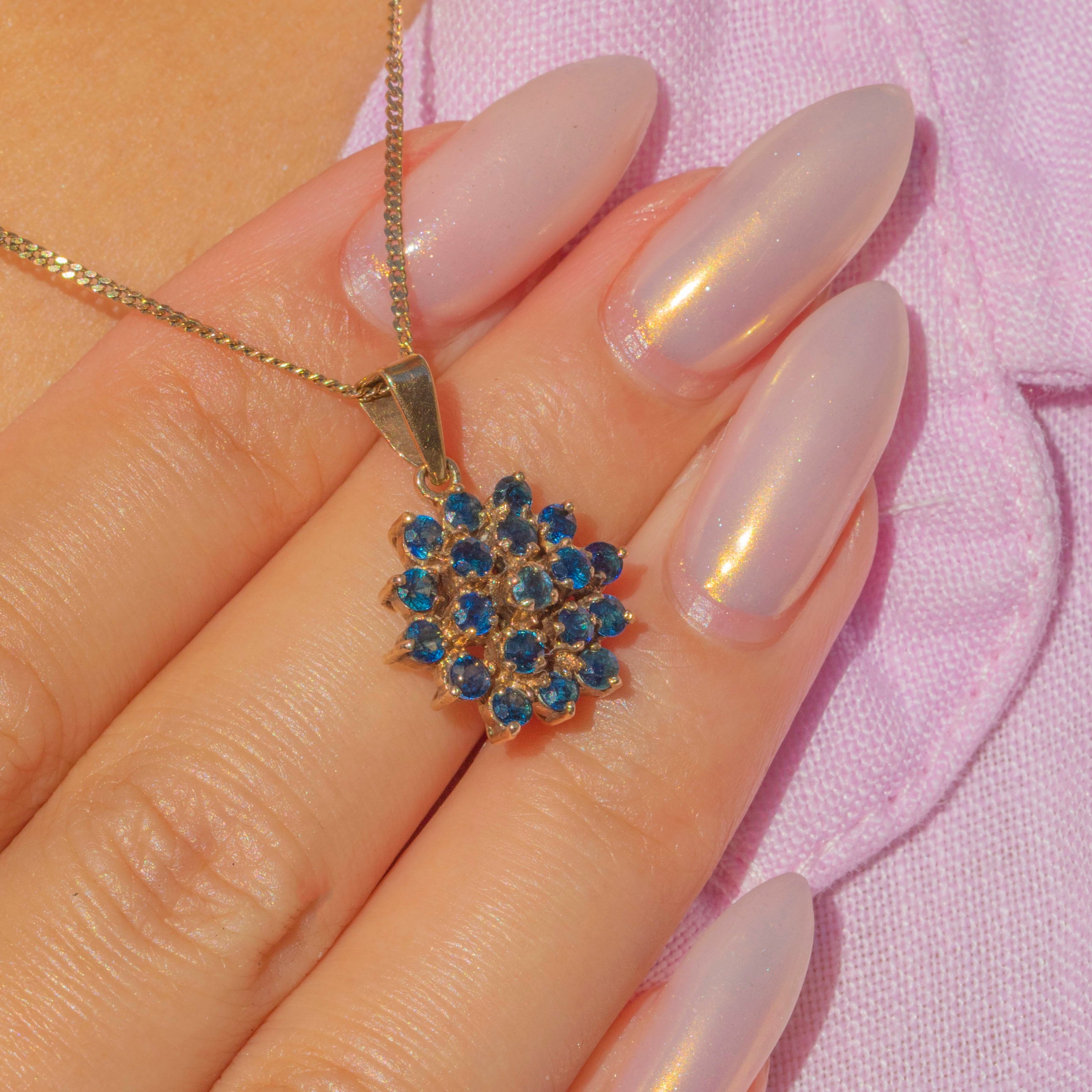 This vintage pendant is crafted in 9ct Gold and designed as a classic starburst. It is set with 19 natural deep inky blue Sapphires, each measuring approximately 2mm, arranged in a vibrant cluster formation. The stones are securely set, creating a lively sparkle that makes this a striking yet wearable jewel.