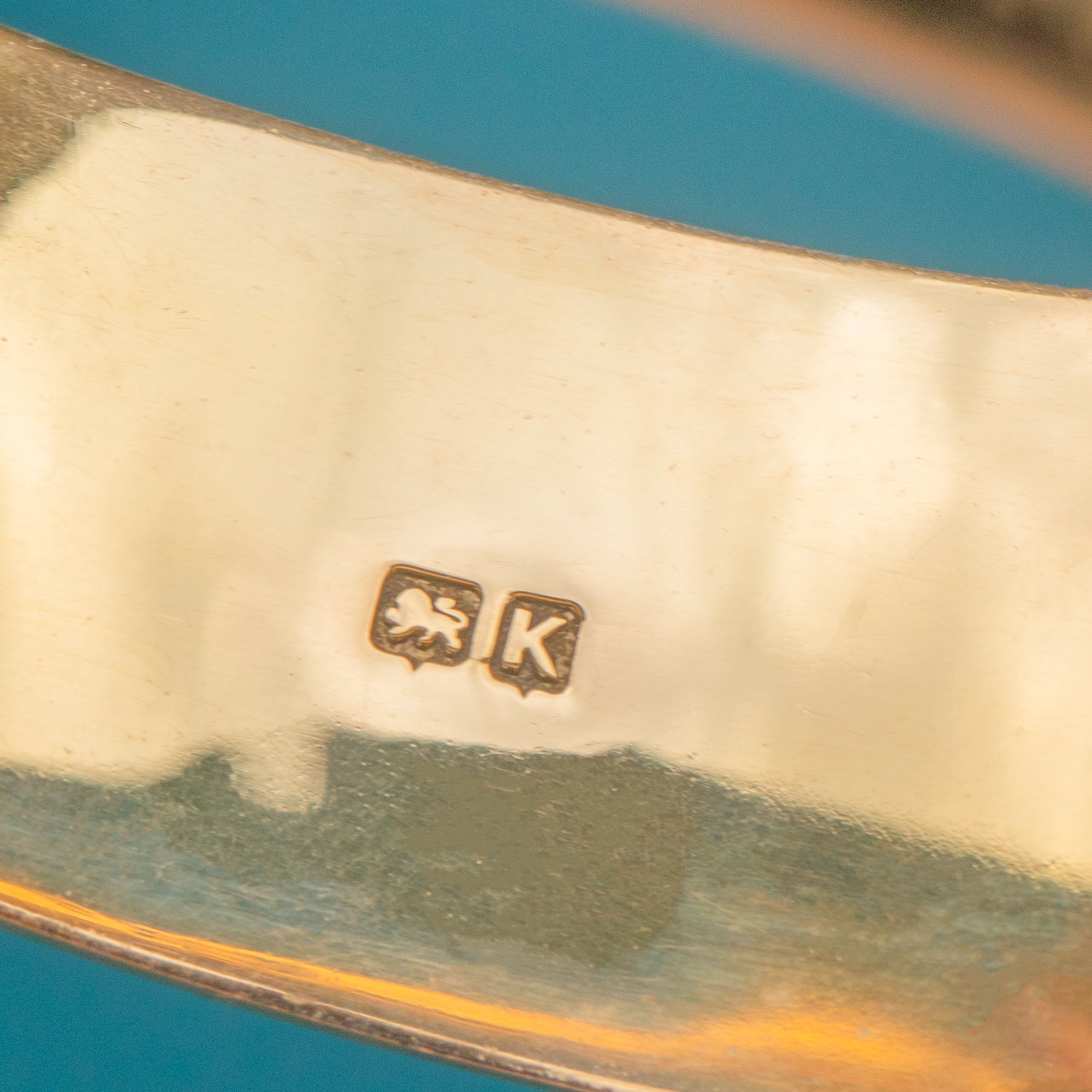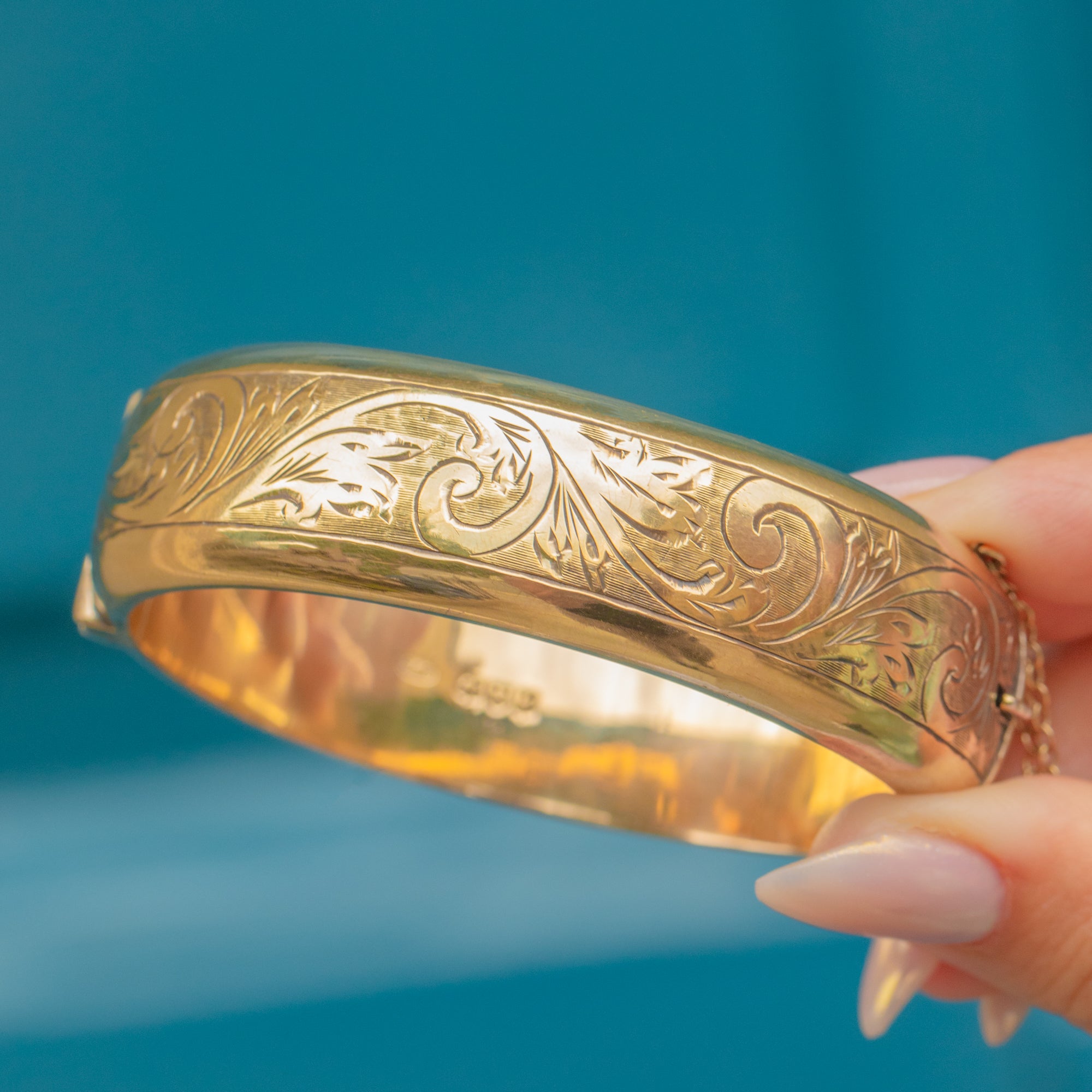 Crafted from glossy 9ct Gold over Silver, this chunky bangle radiates a rich golden hue while retaining the strength and comforting weight of over 30 grams of solid Sterling Silver. The front is adorned with swirling baroque-style engravings, providing a wonderful texture and depth to the piece.