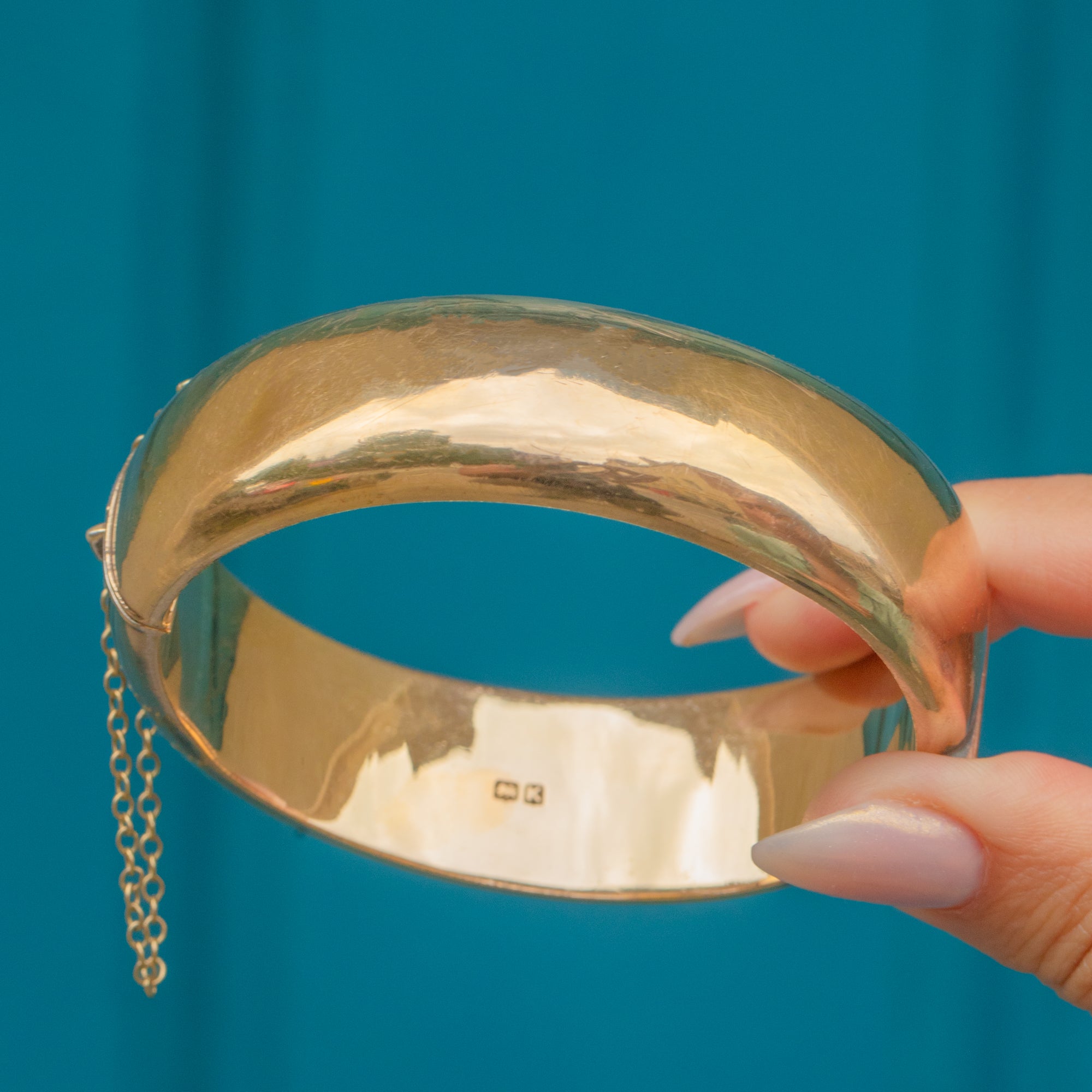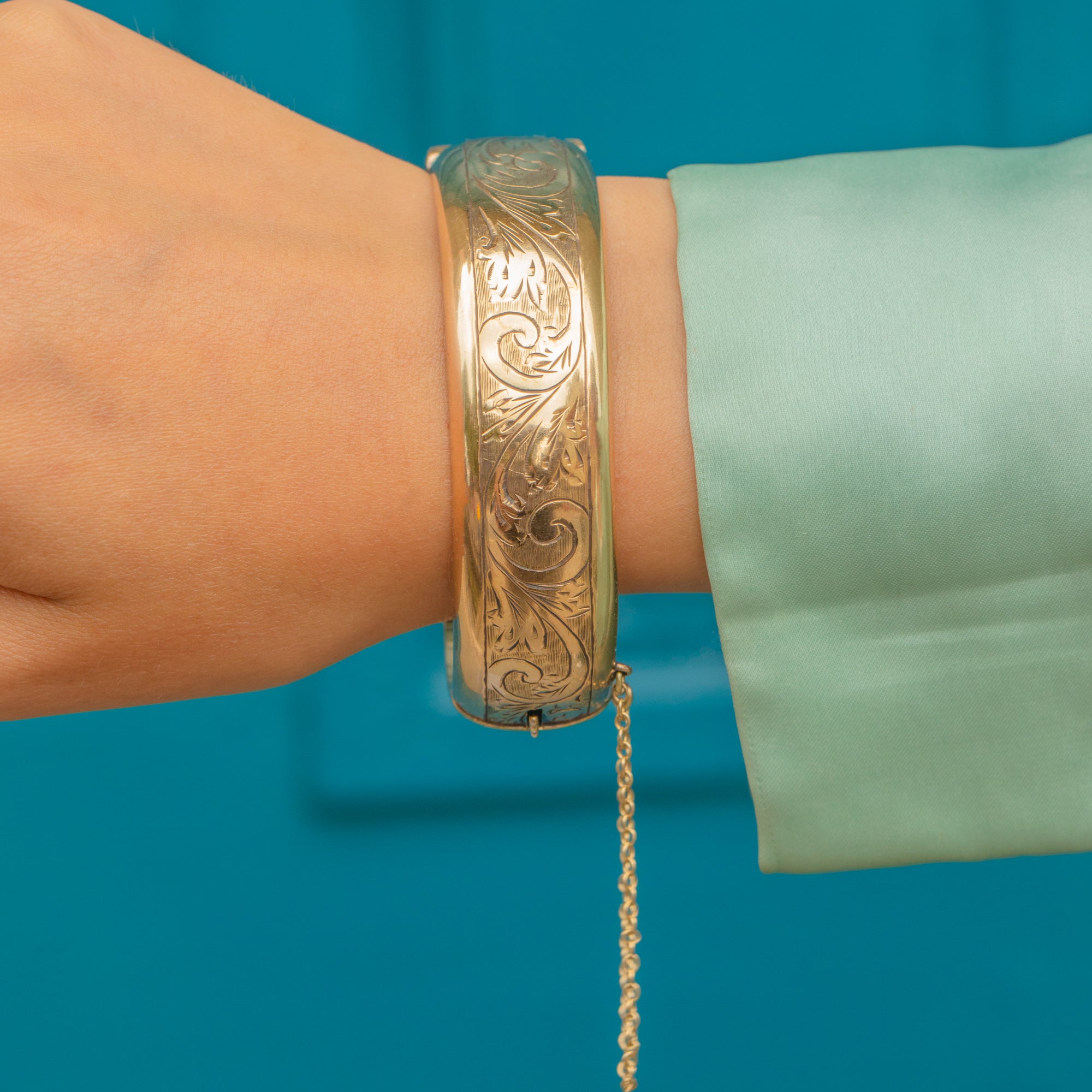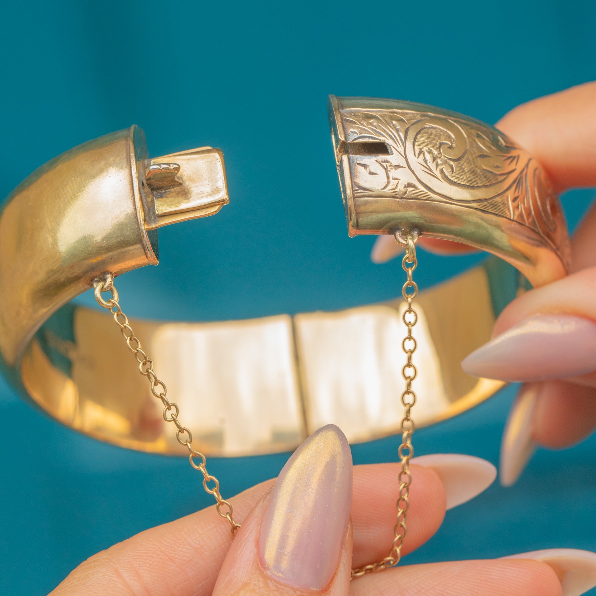VERY GOOD-EXCELLENT: The gilded surface shows only very slight wear consistent with age, adding gentle character without detracting from its appeal. The hinge and clasp are in excellent working order, ensuring the bangle remains secure and functional. Complete with a safety chain, this vintage bangle can be worn with utmost confidence.