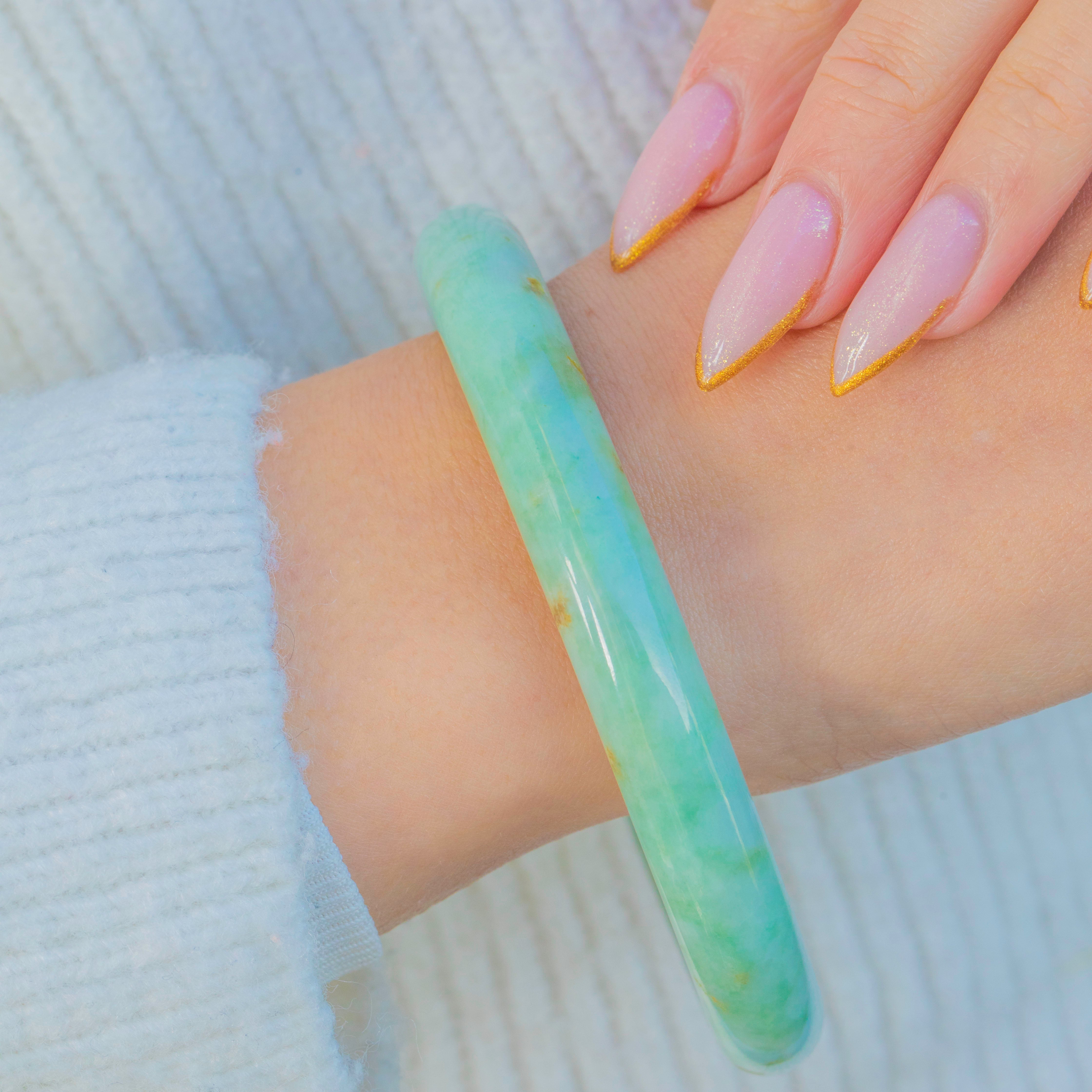 This beautiful vintage Jade bangle has a smooth, polished finish and a serene natural green tone throughout. With its generous weight and classic rounded profile, it feels wonderfully substantial and cool against the skin, adding effortless elegance to any jewellery stack.