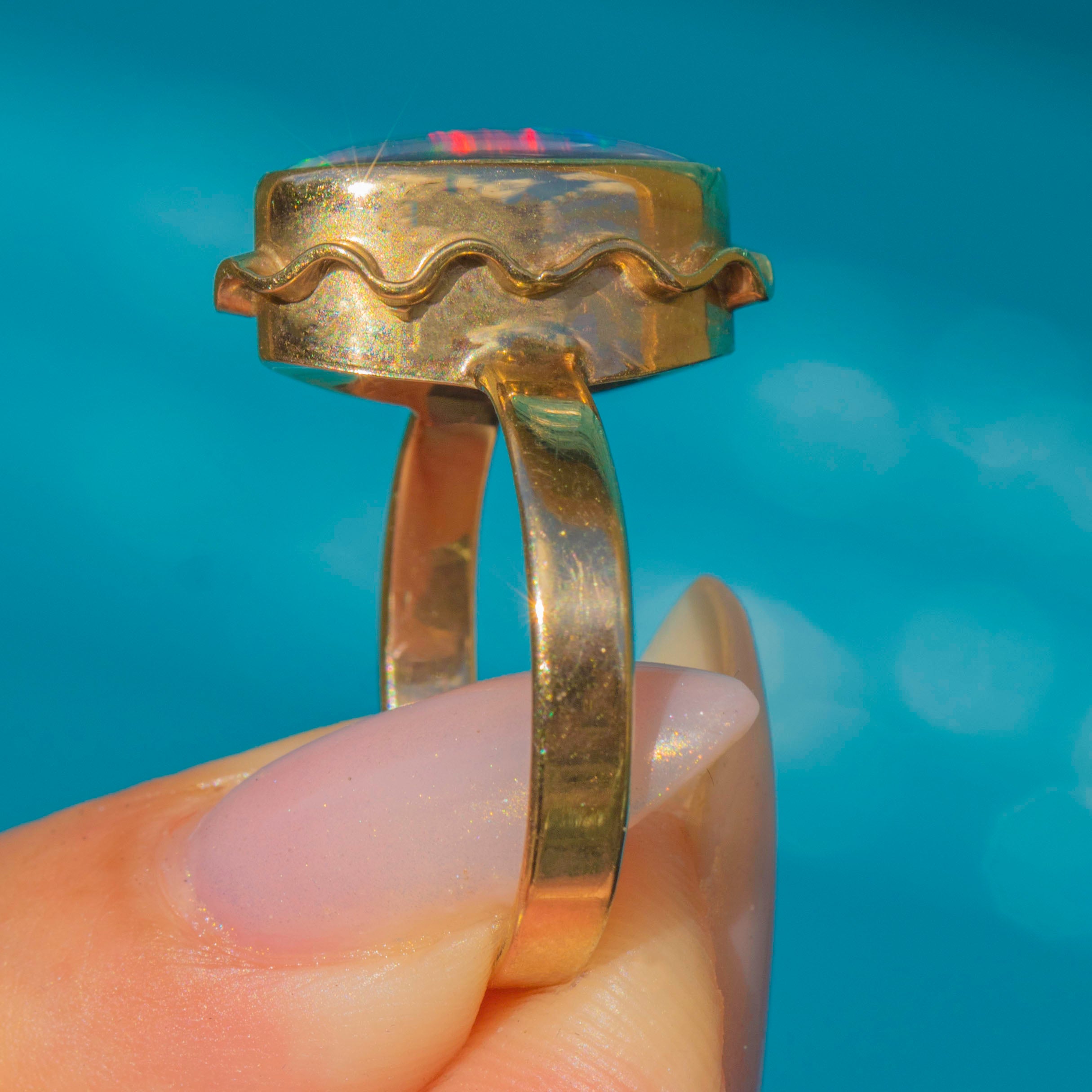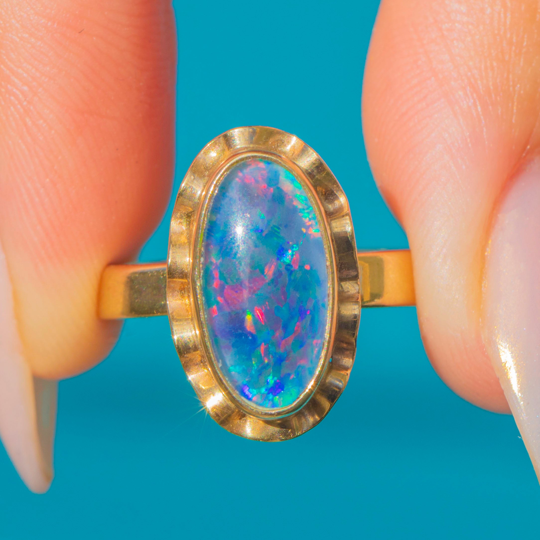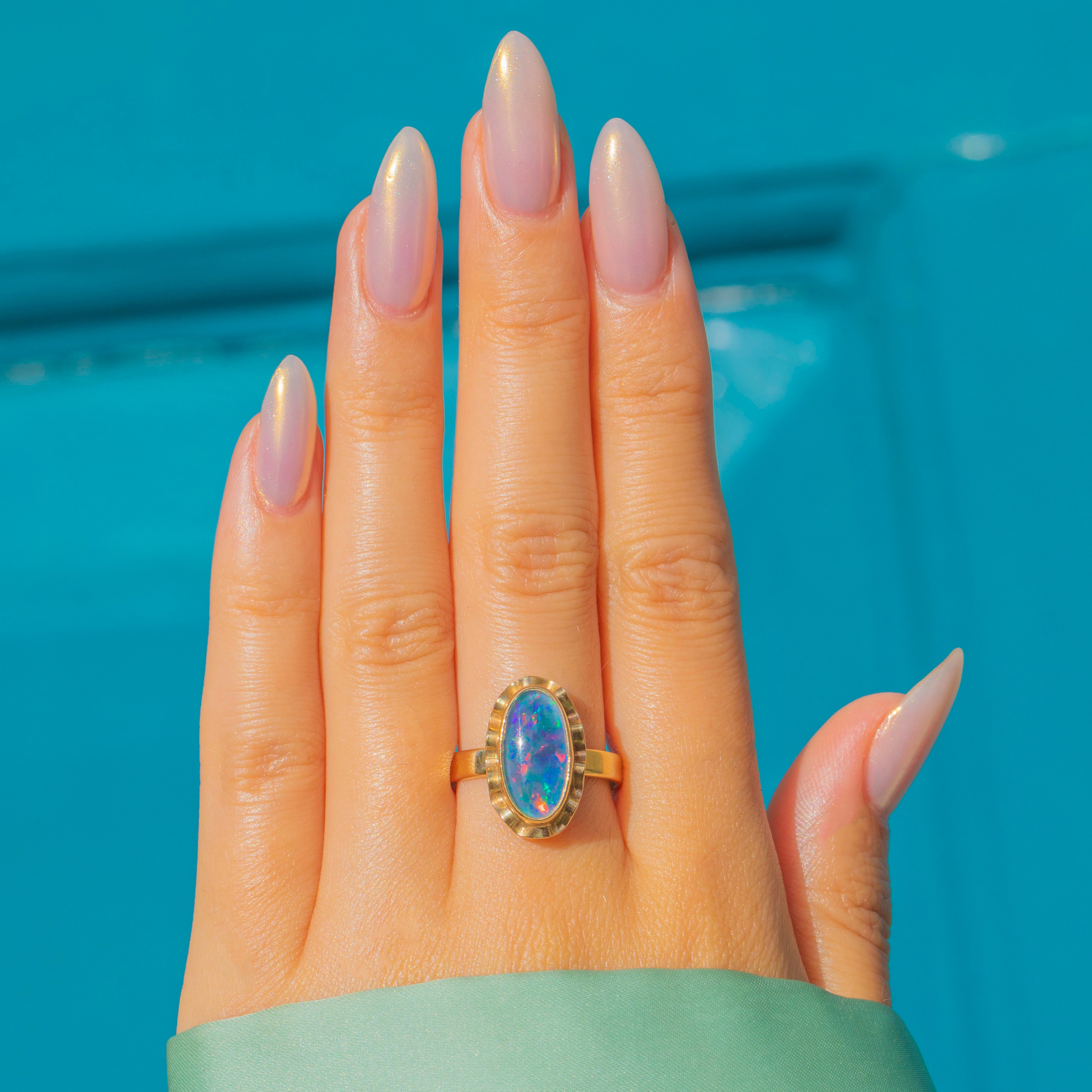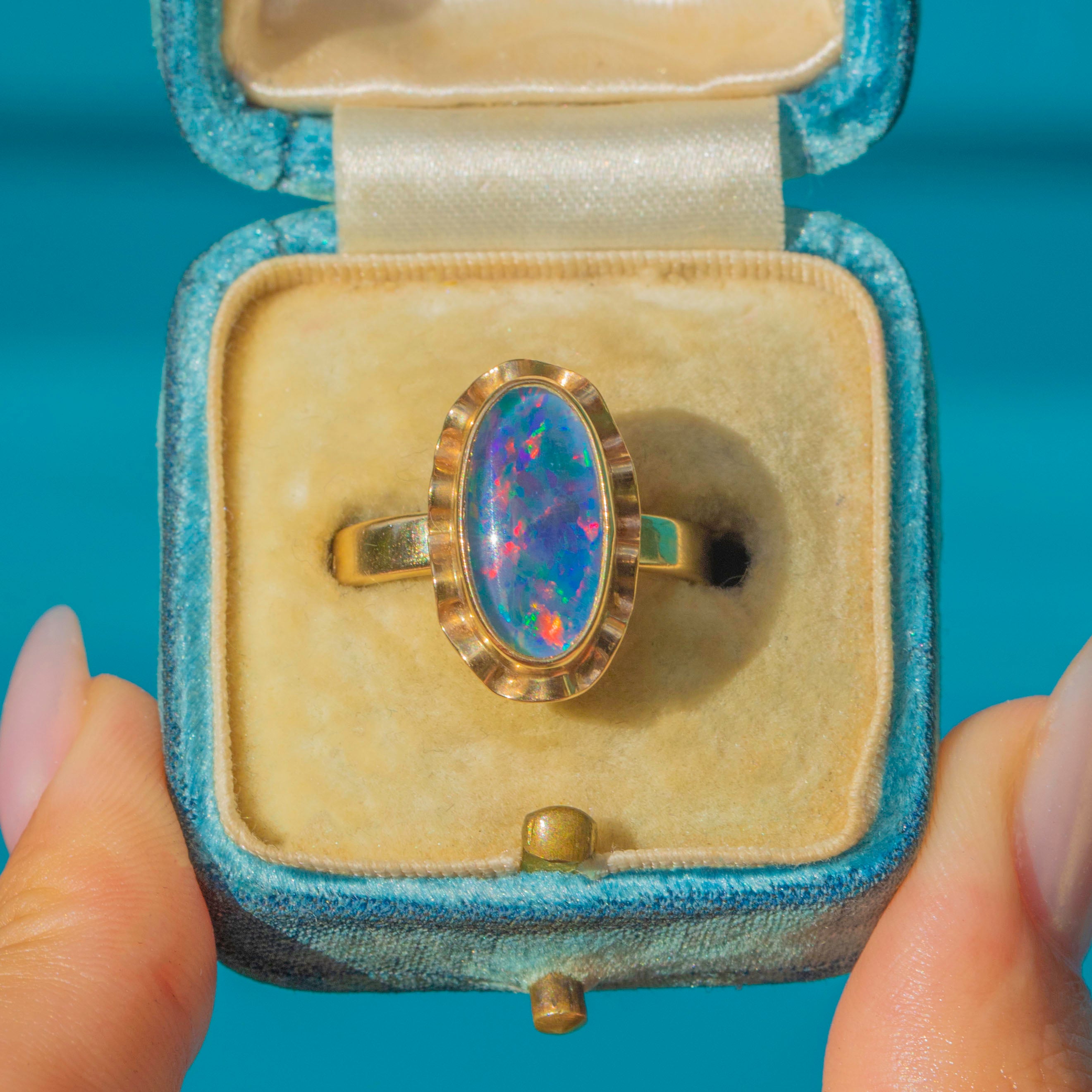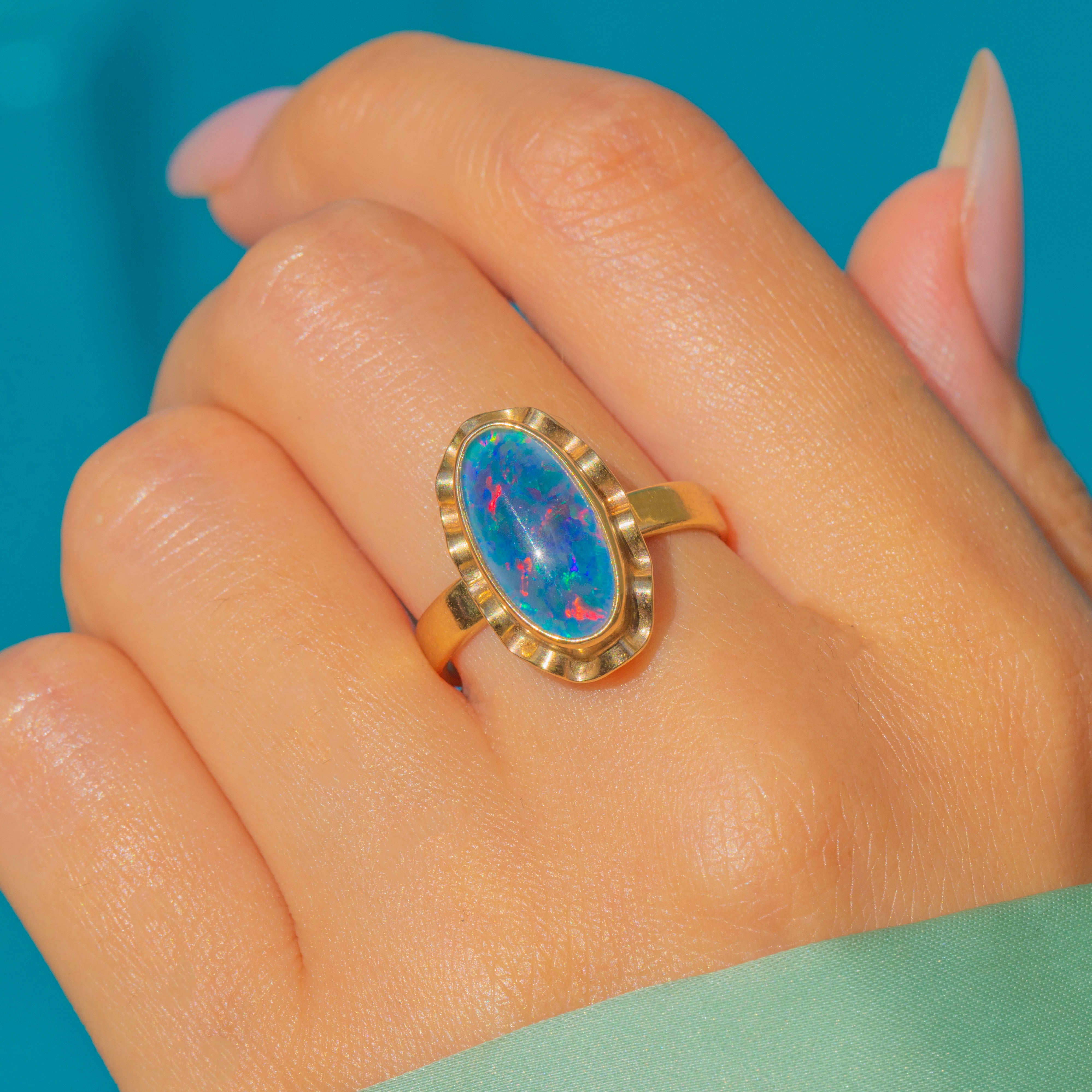 A Vintage Opal triplet ring in 9ct Gold, featuring a striking elongated cabochon with vivid flashes of colour. The Opals shimmering play-of-colour is enhanced by the protective triplet construction.